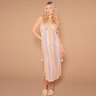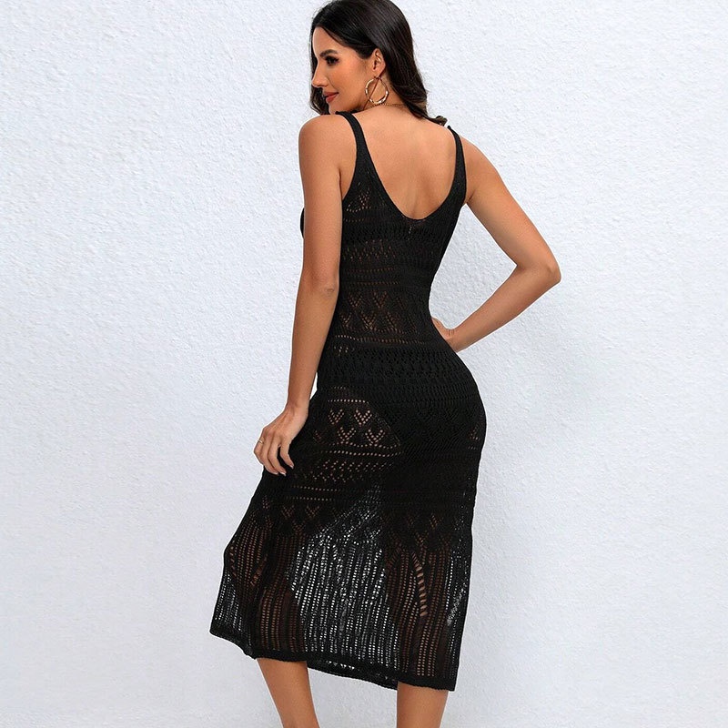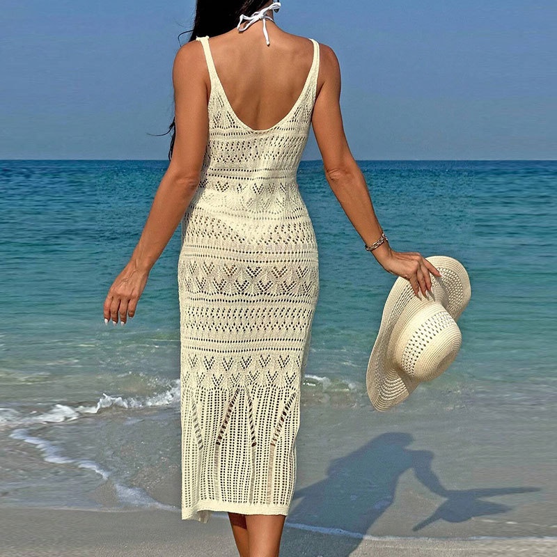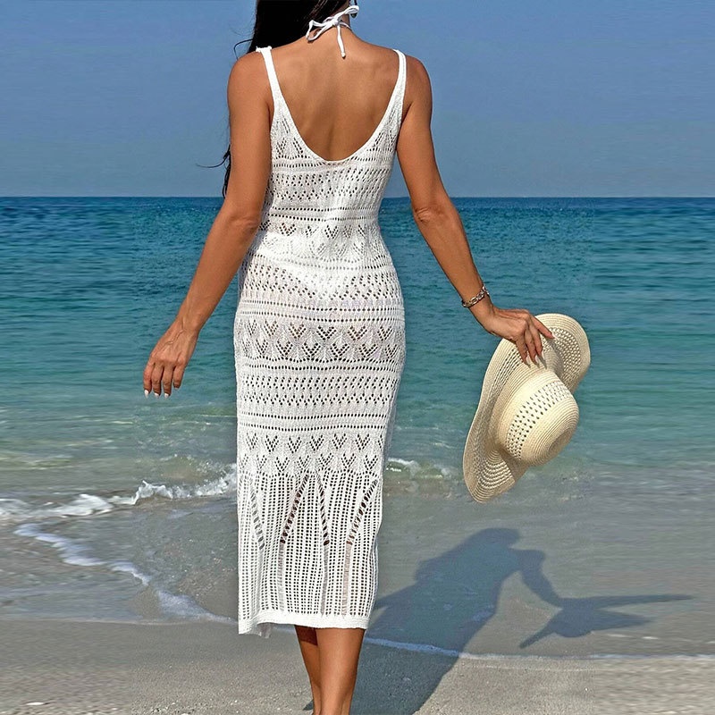 洋洋欧美跨境沙滩罩衫性感长款镂空针织吊带露背度假防晒裙