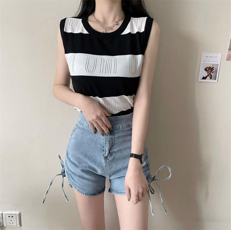 字母镂空条纹无袖背心上衣女2022夏季新款韩版T恤时尚休闲打底衫