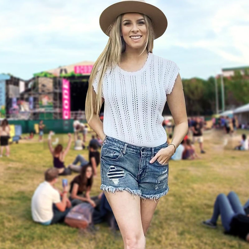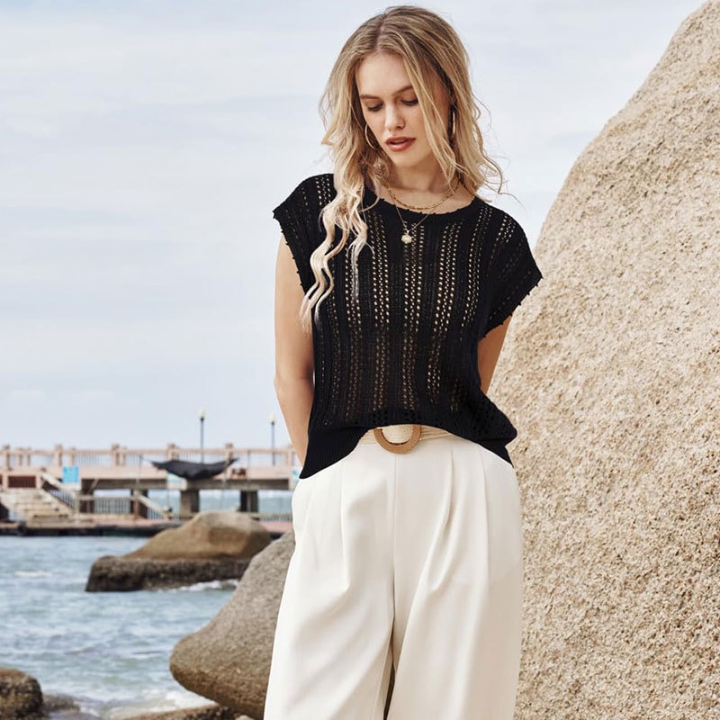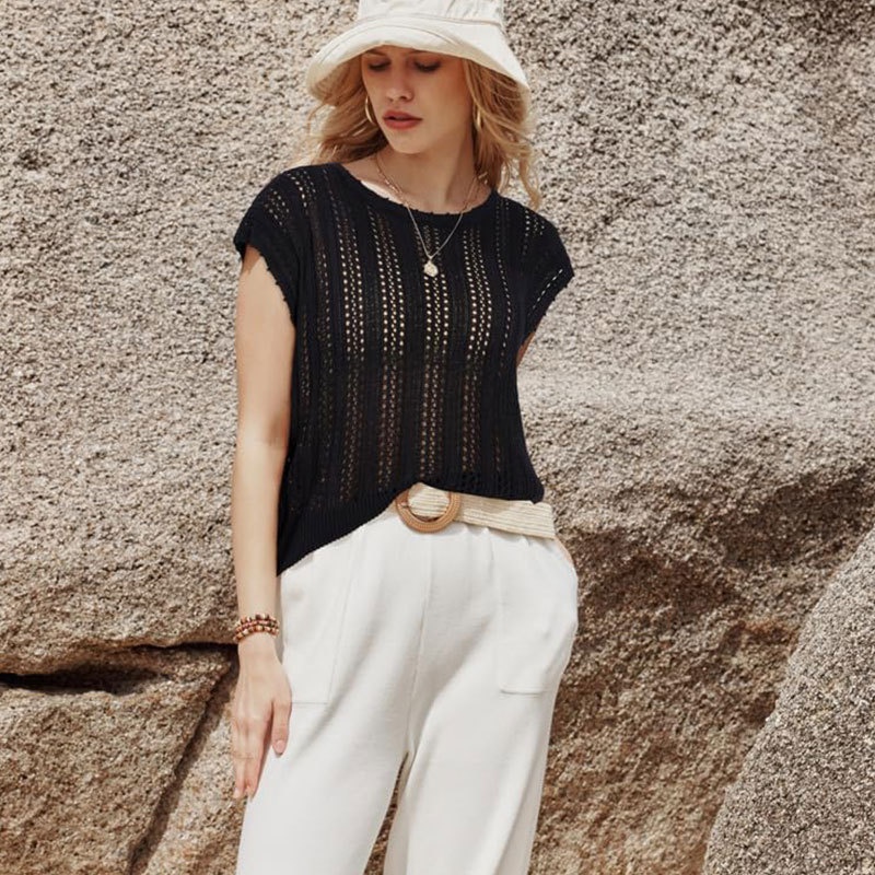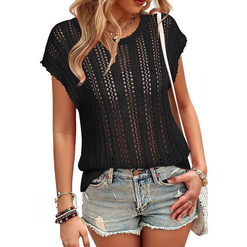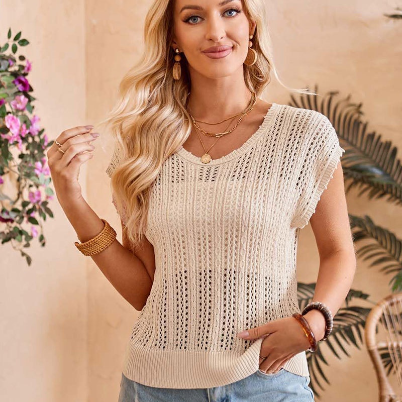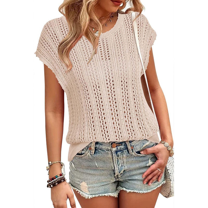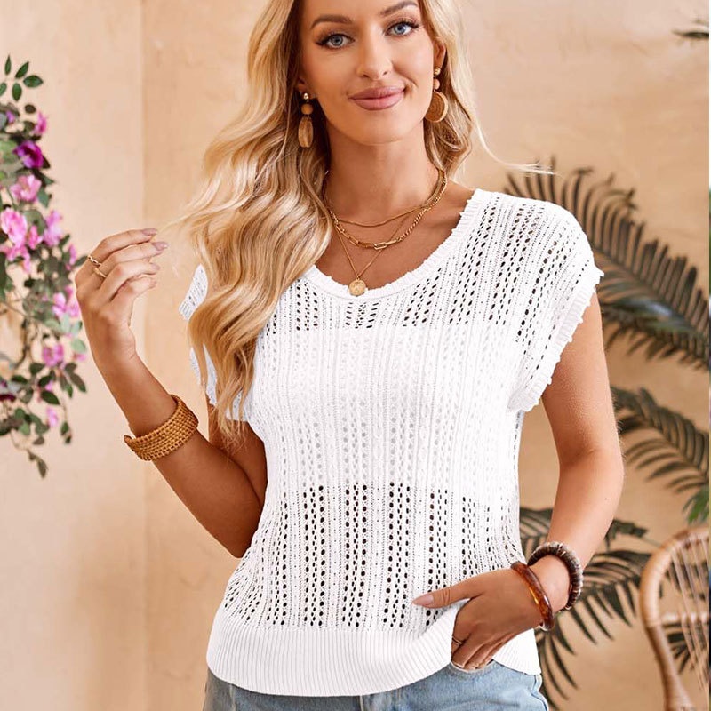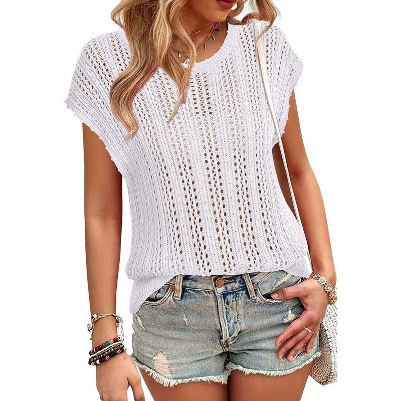 洋洋夏季欧美跨境宽松镂空女款背心圆领盖袖度假风针织罩衫