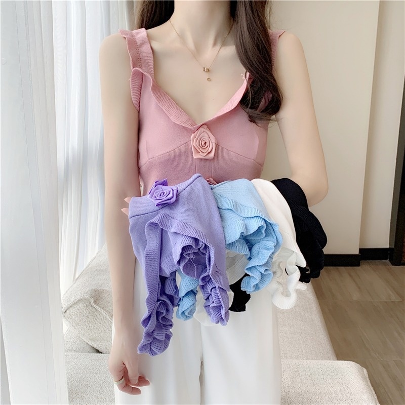 2022夏新款韩版修身设计感小众木耳边V领立体花朵吊带背心女上衣