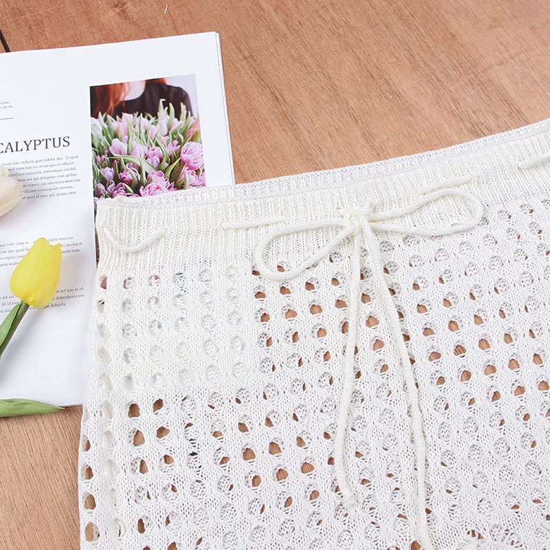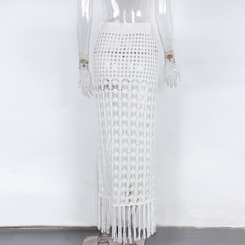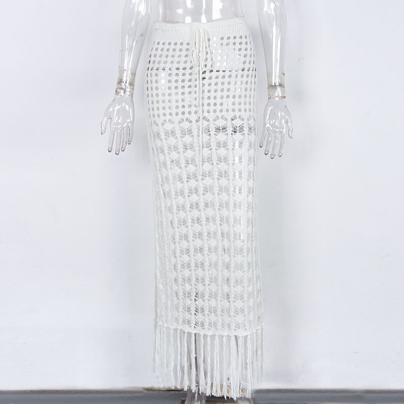 沙滩裙度假性感透视半身裙镂空开叉针织手钩花流苏半身裙