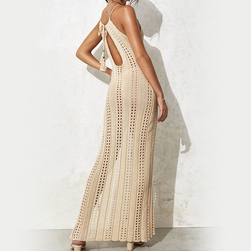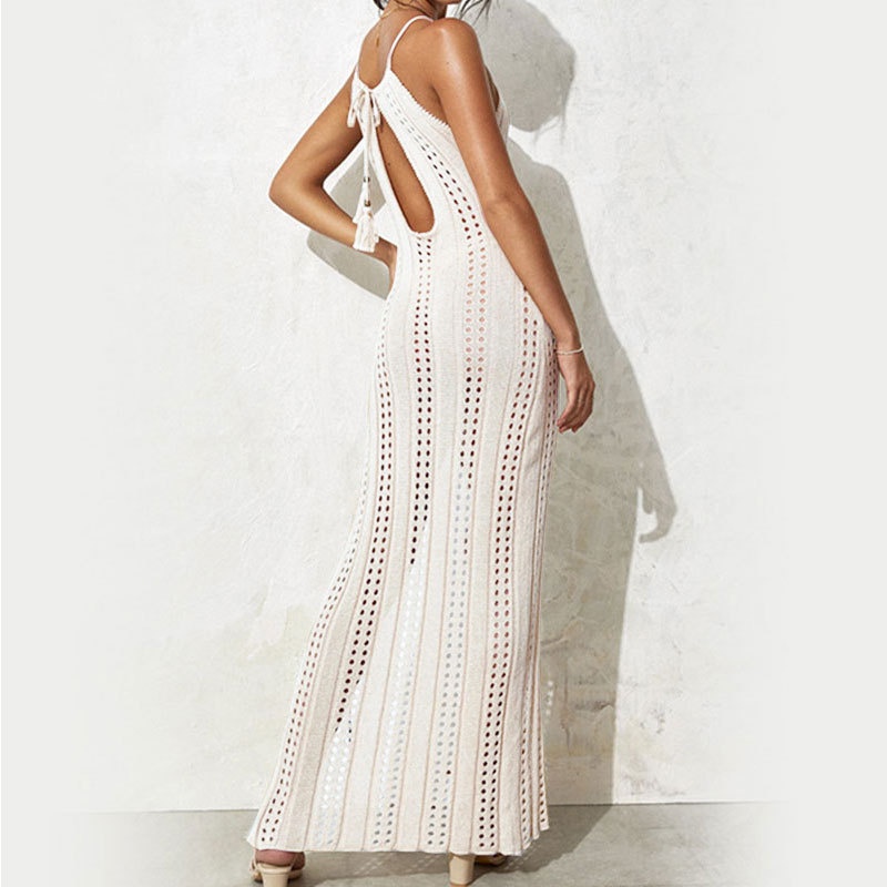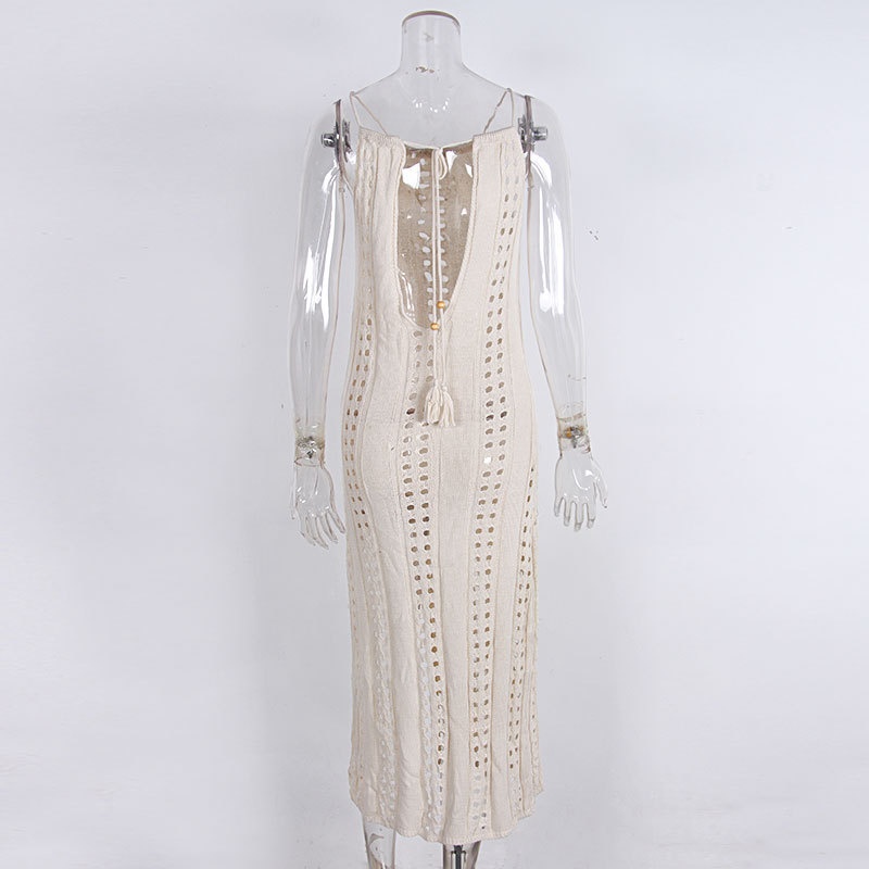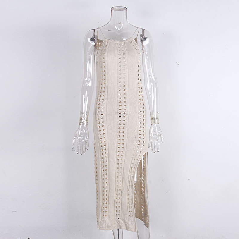欧美外贸侧开叉吊带露背性感镂空沙滩针织连衣裙沙滩裙防晒衫