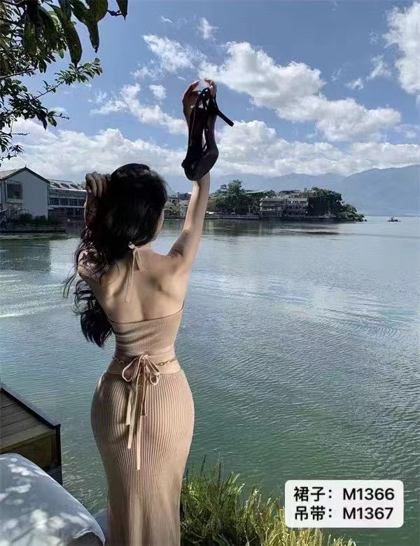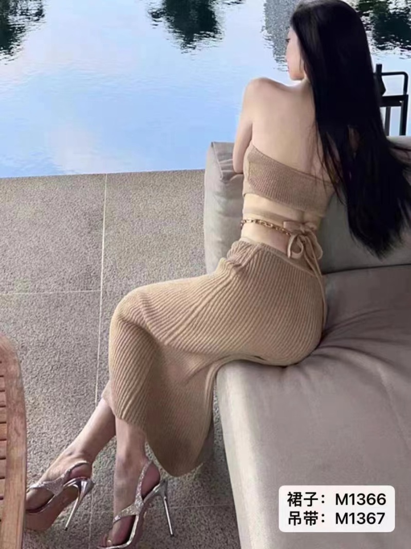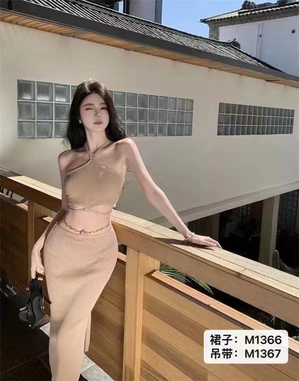 2024夏季新款性感辣妹修身显瘦挂脖露腰吊带+链条开叉半身裙套装