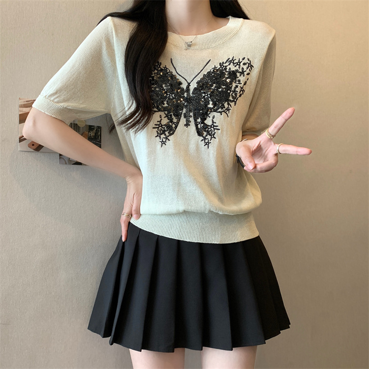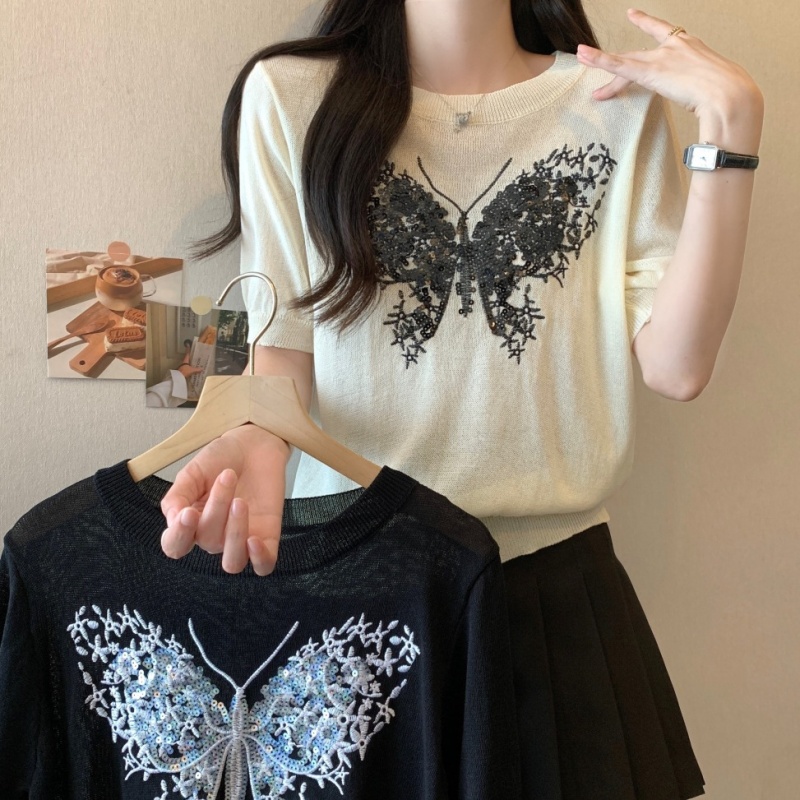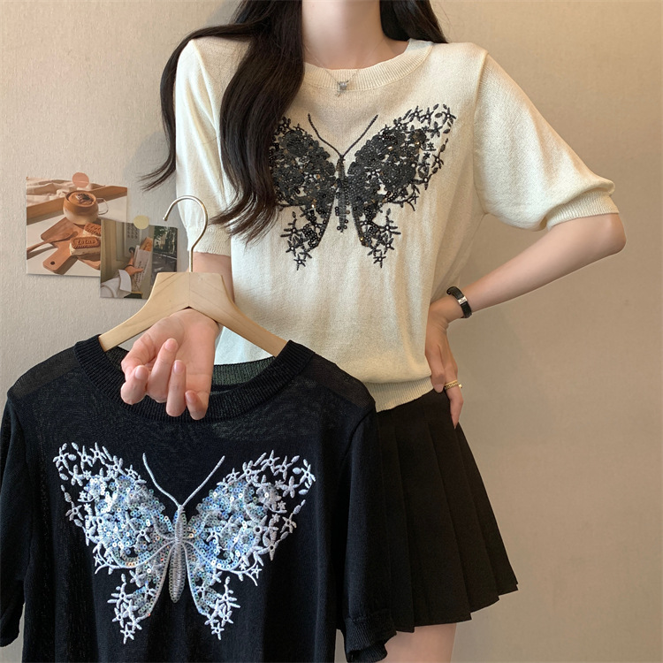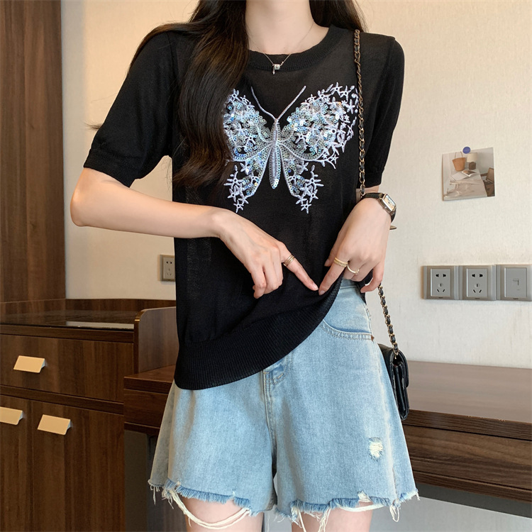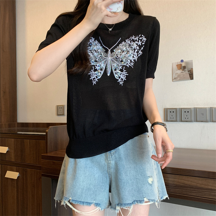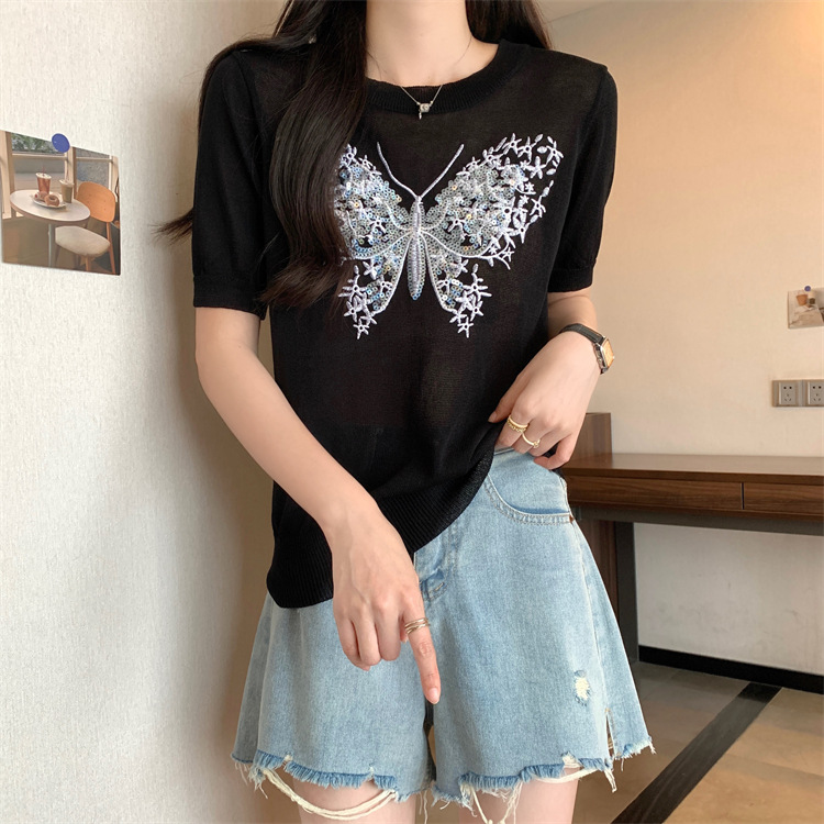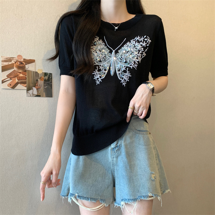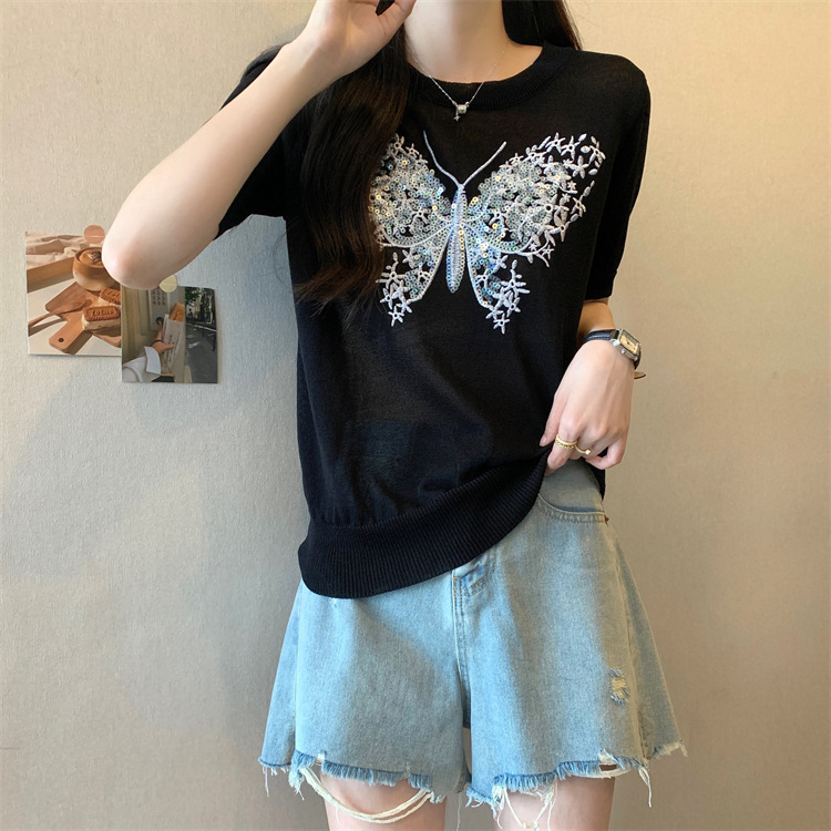首发实拍2024夏季新款大码韩版洋气蝴蝶圆领针织短袖上衣显瘦T恤