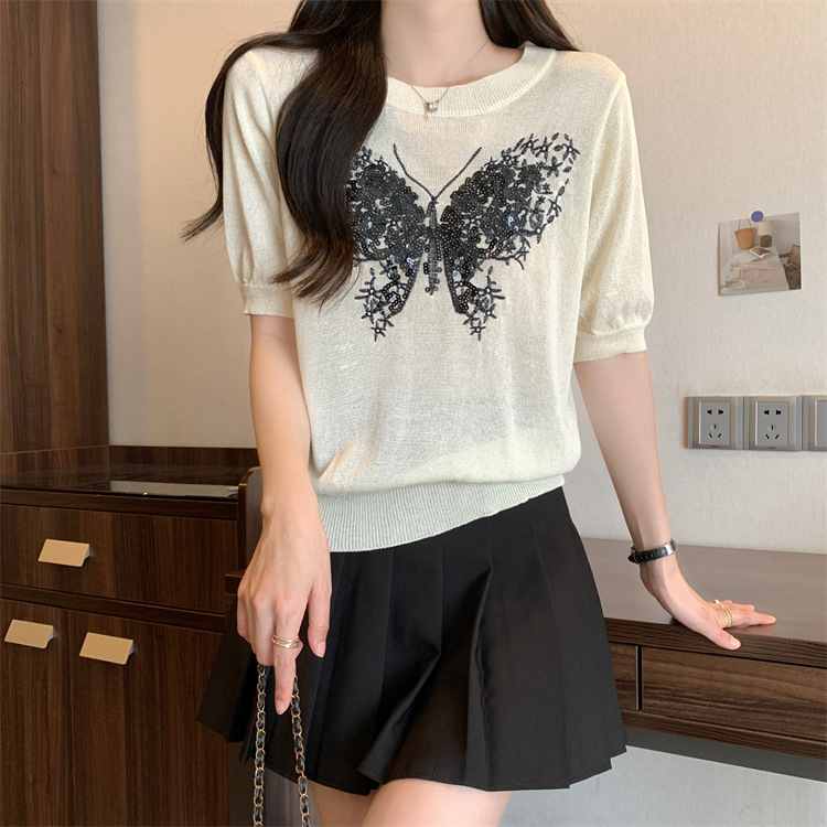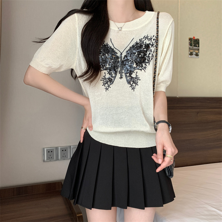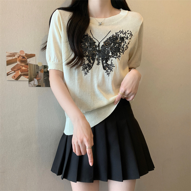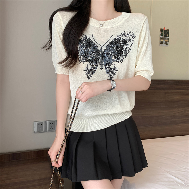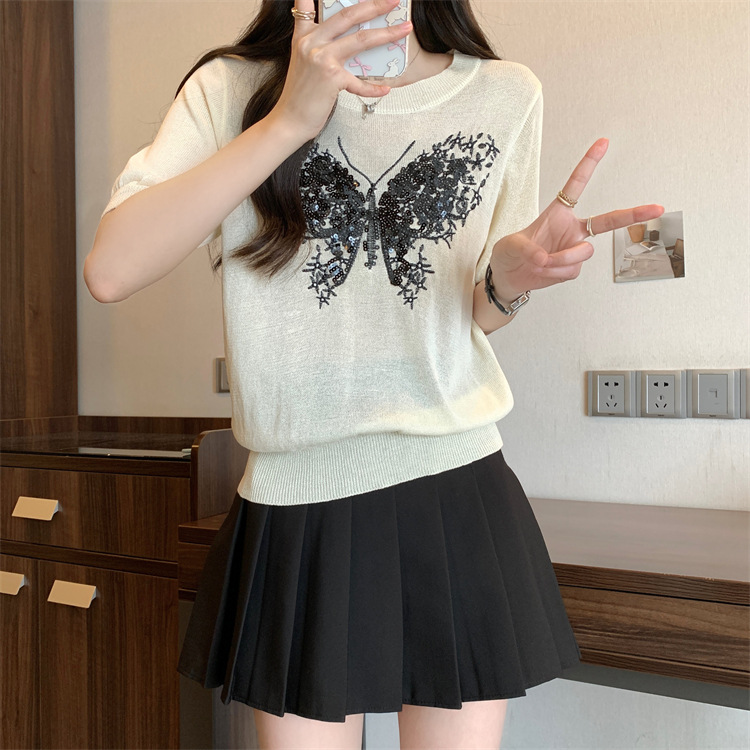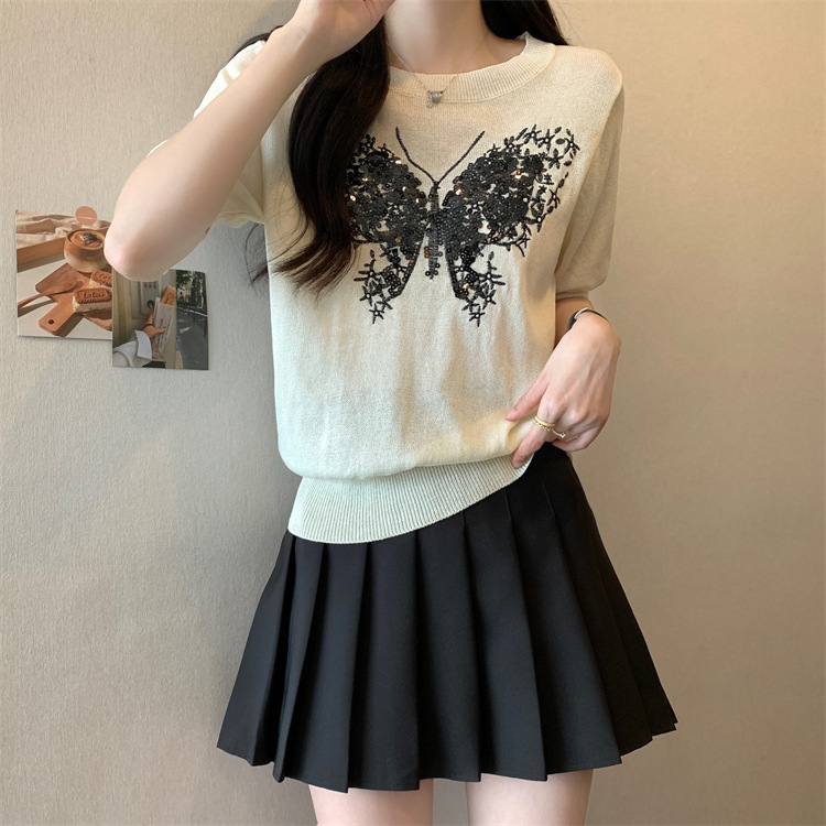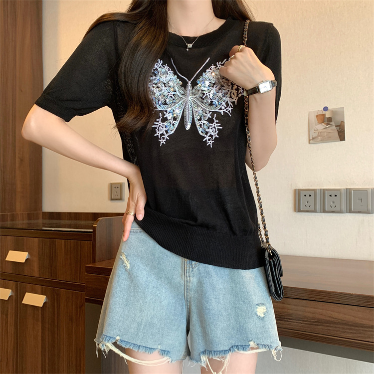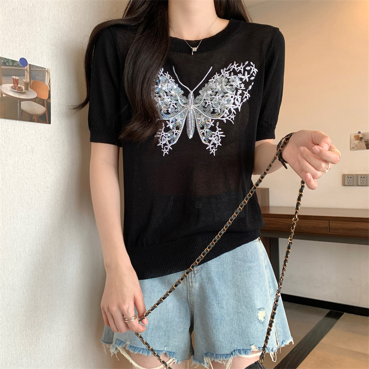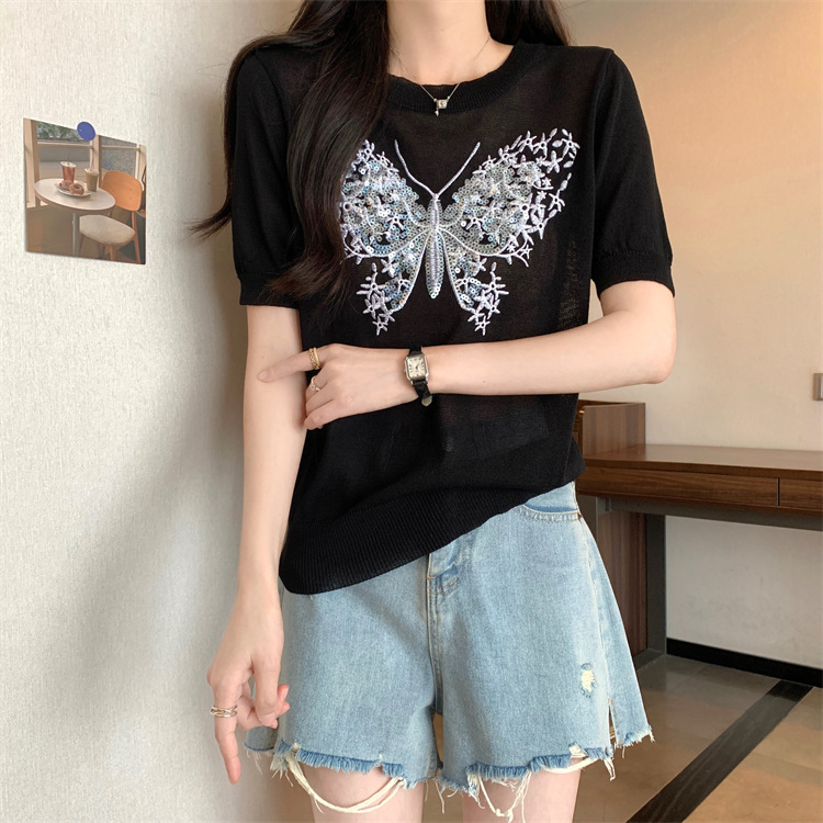 首发实拍2024夏季新款大码韩版洋气蝴蝶圆领针织短袖上衣显瘦T恤