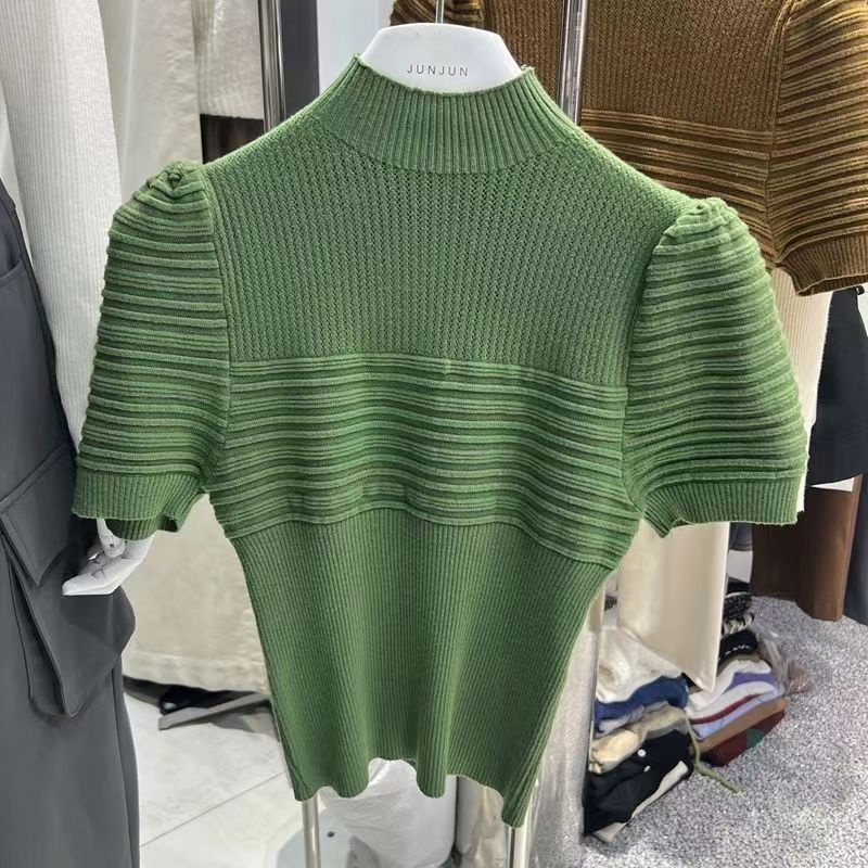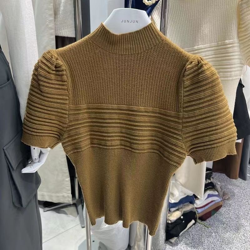 高领针织短袖T恤女2023年新款白色泡泡袖设计感别致显瘦小上衣女