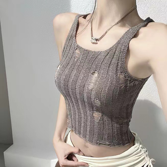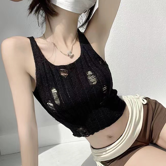 夏季新款设计感2025修身辣妹镂空破洞针织吊带背心女袖套短款上衣