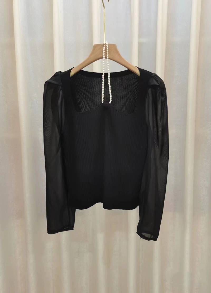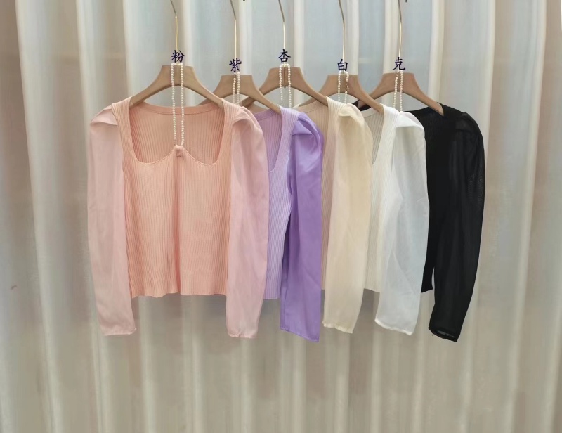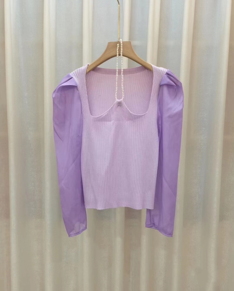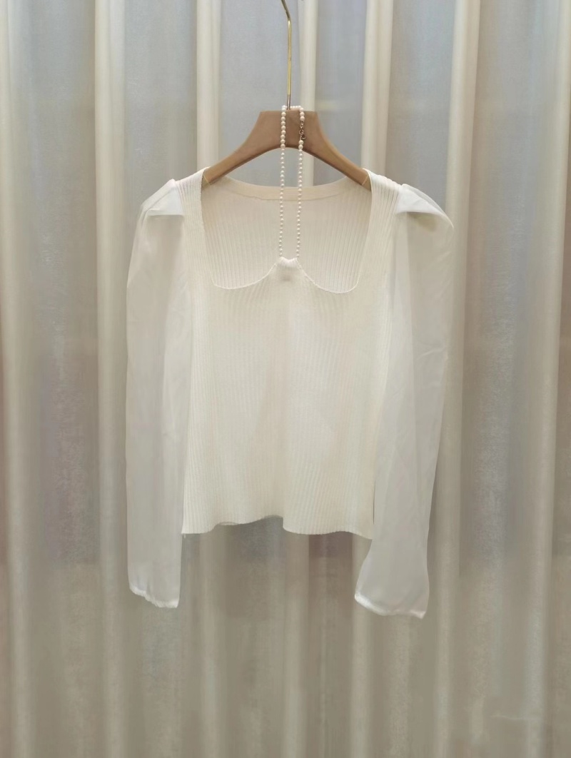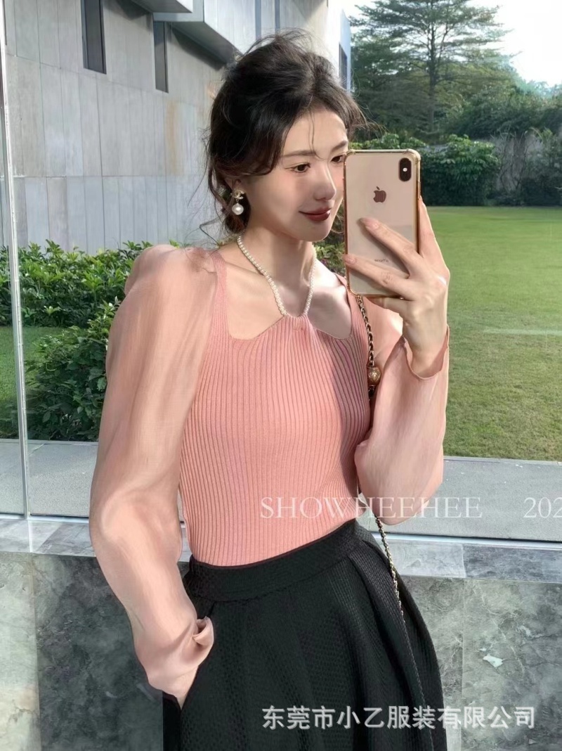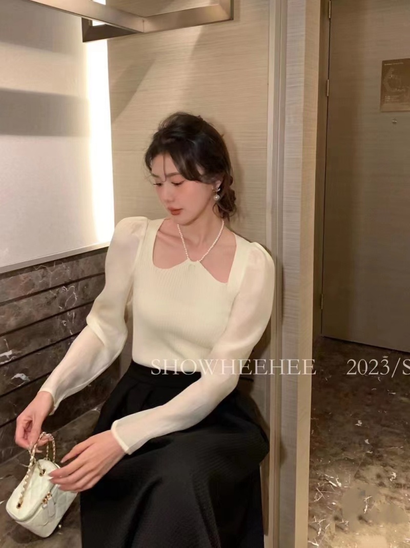 韩国东大门法式珍珠挂脖针织衫露锁骨性感泡泡袖上衣2023春季新款