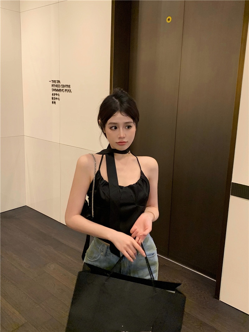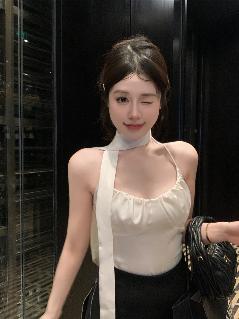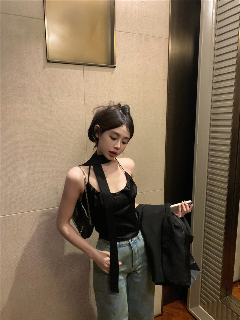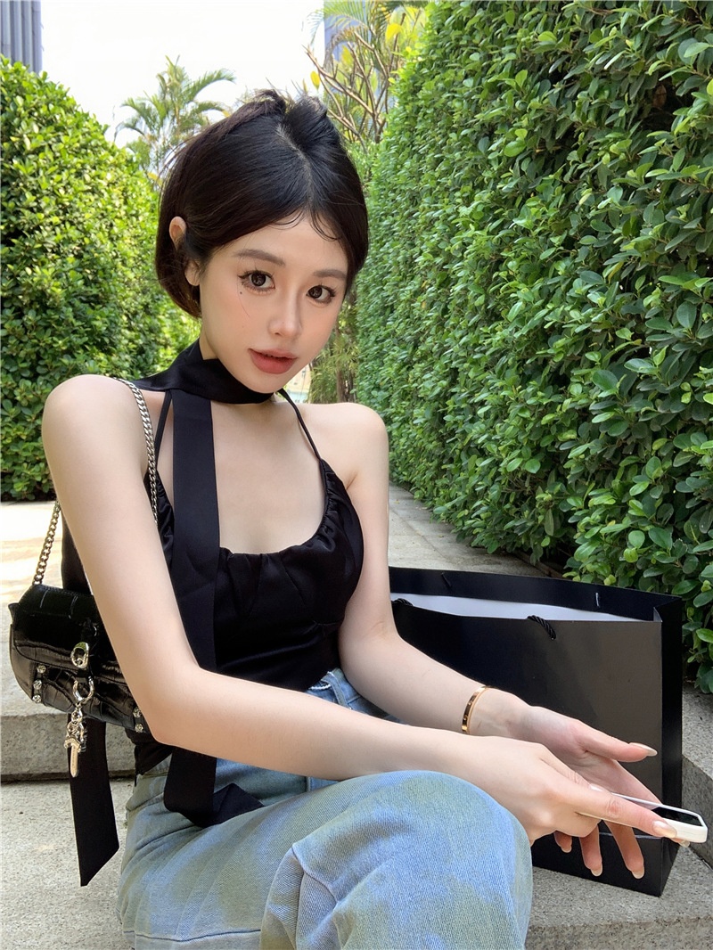 夏季设计感小众别致辣妹性感纯欲挂脖缎面吊带背心气质短款上衣女