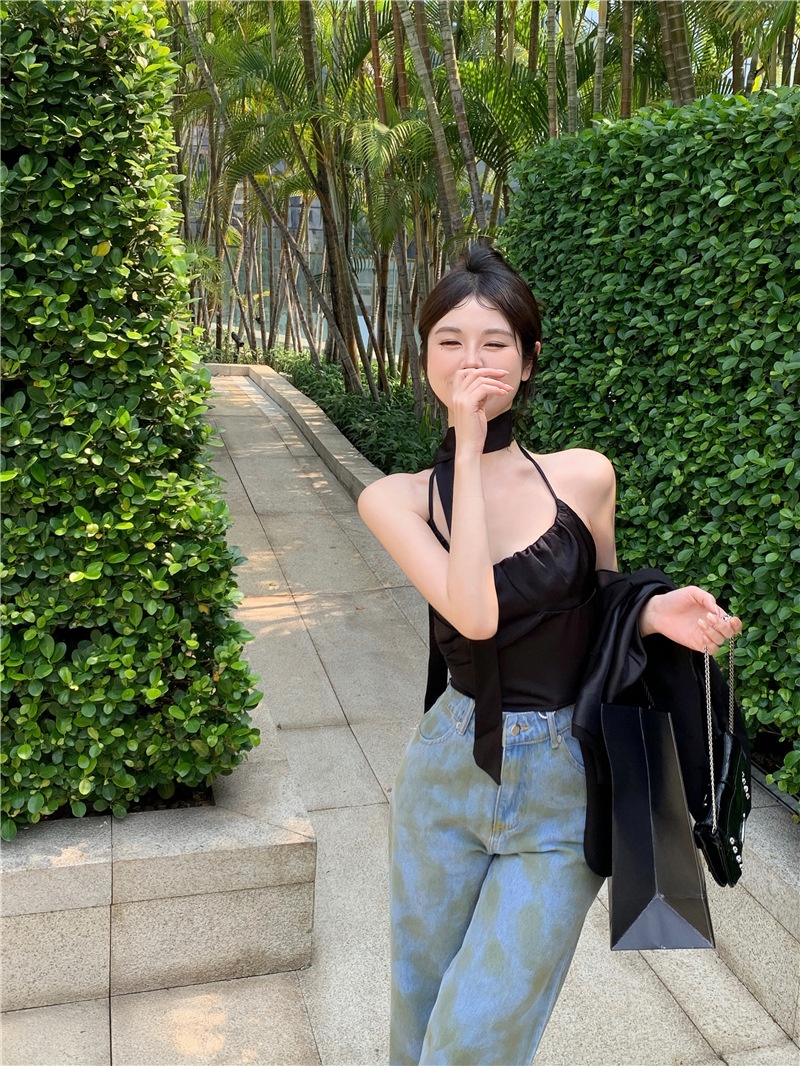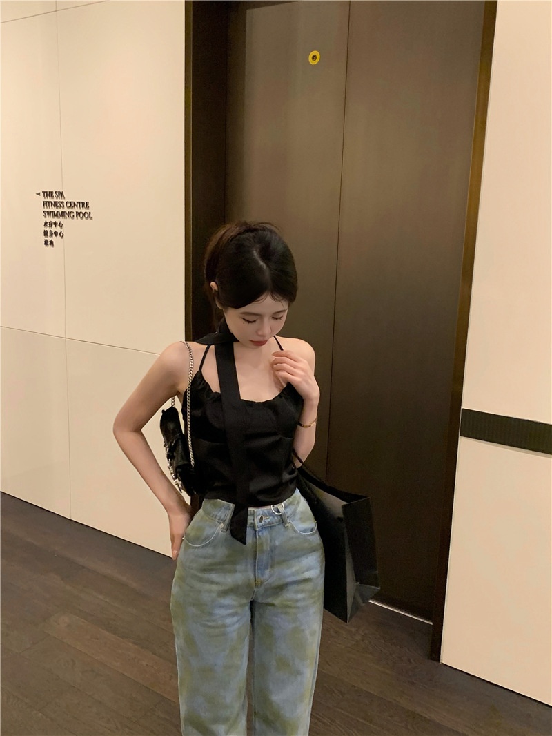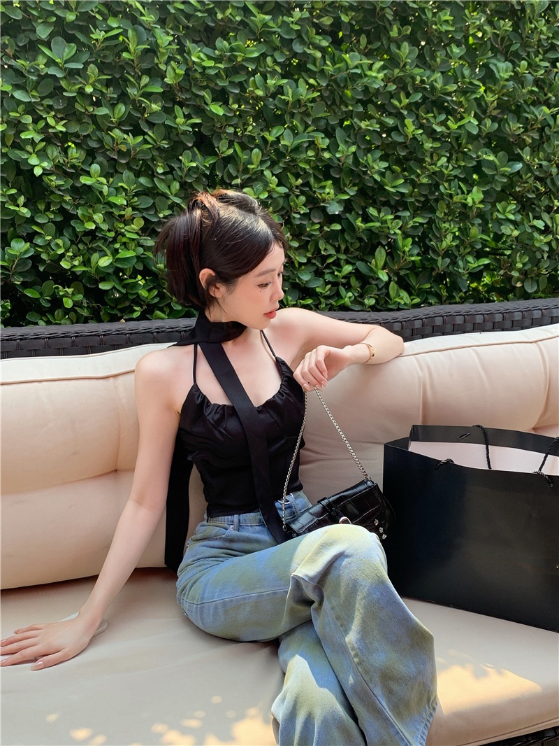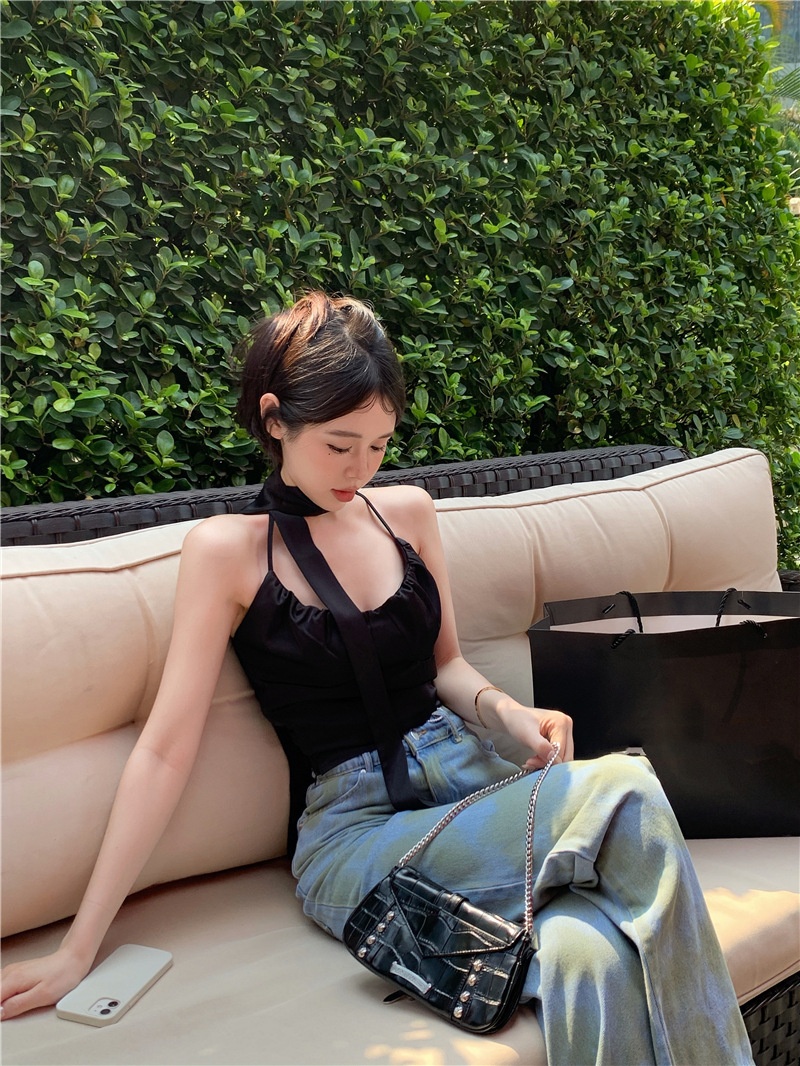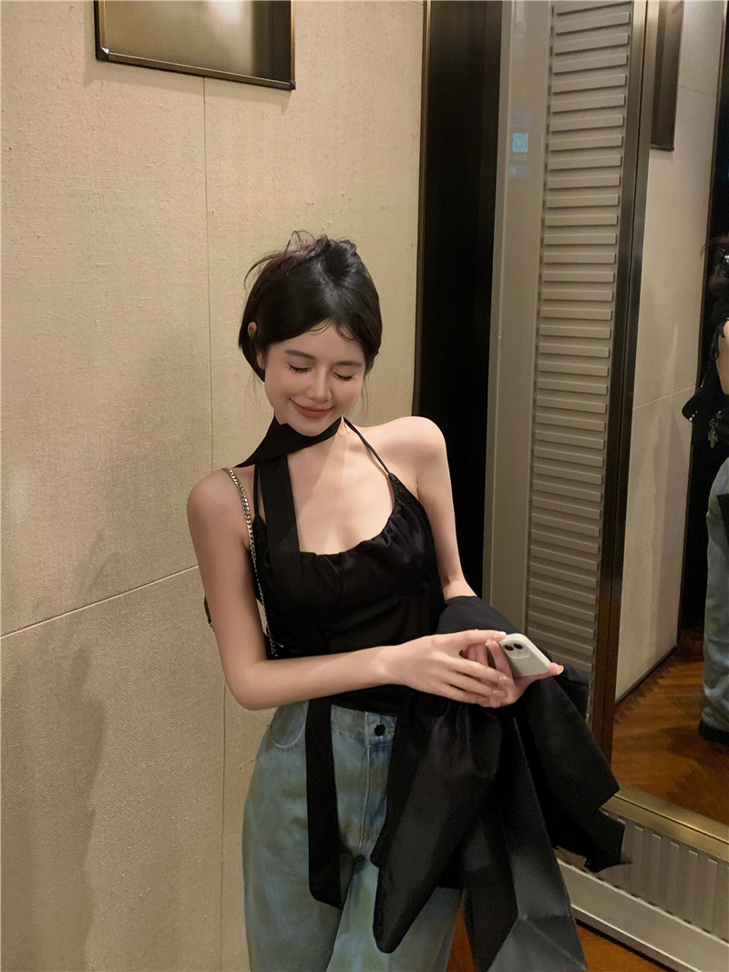 夏季设计感小众别致辣妹性感纯欲挂脖缎面吊带背心气质短款上衣女