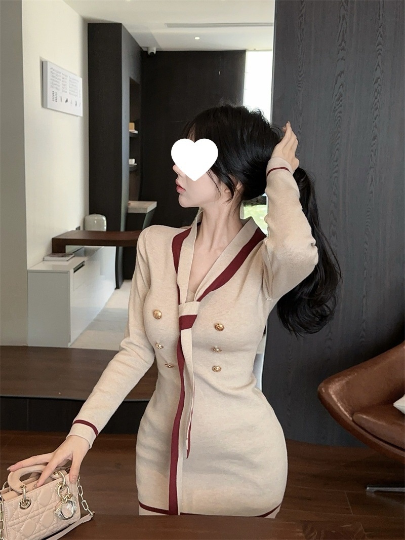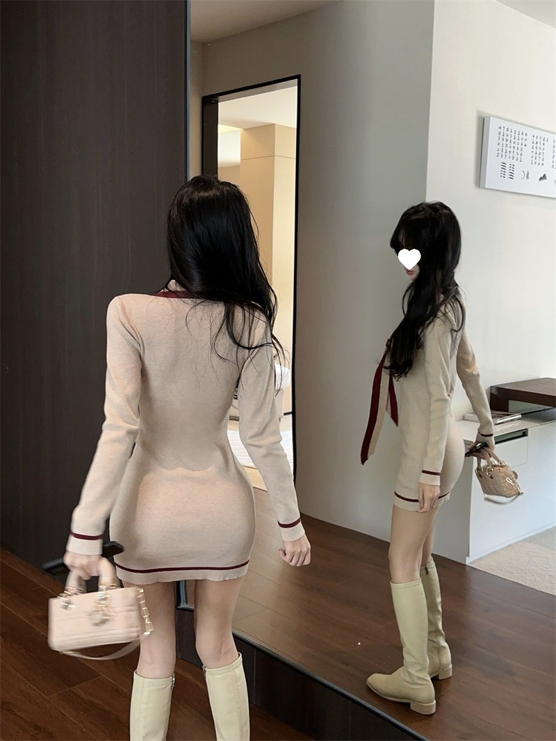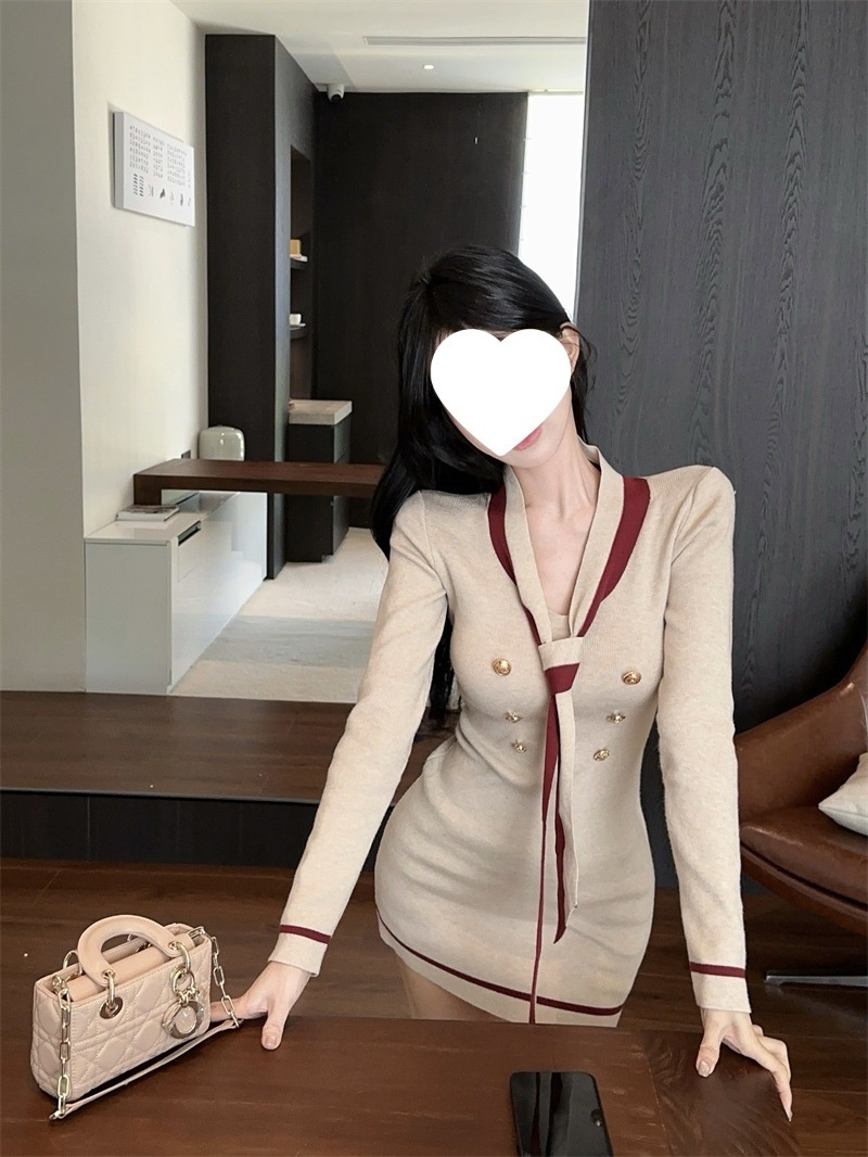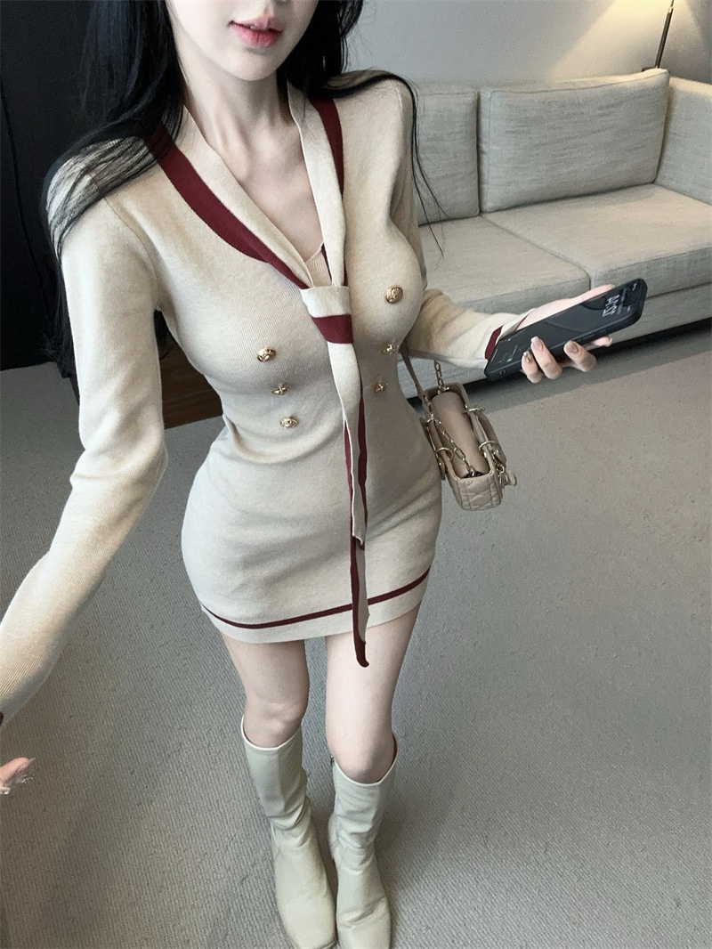 2024春秋季新款气质拼色针织连衣裙小众V领系带显瘦性感包臀短裙