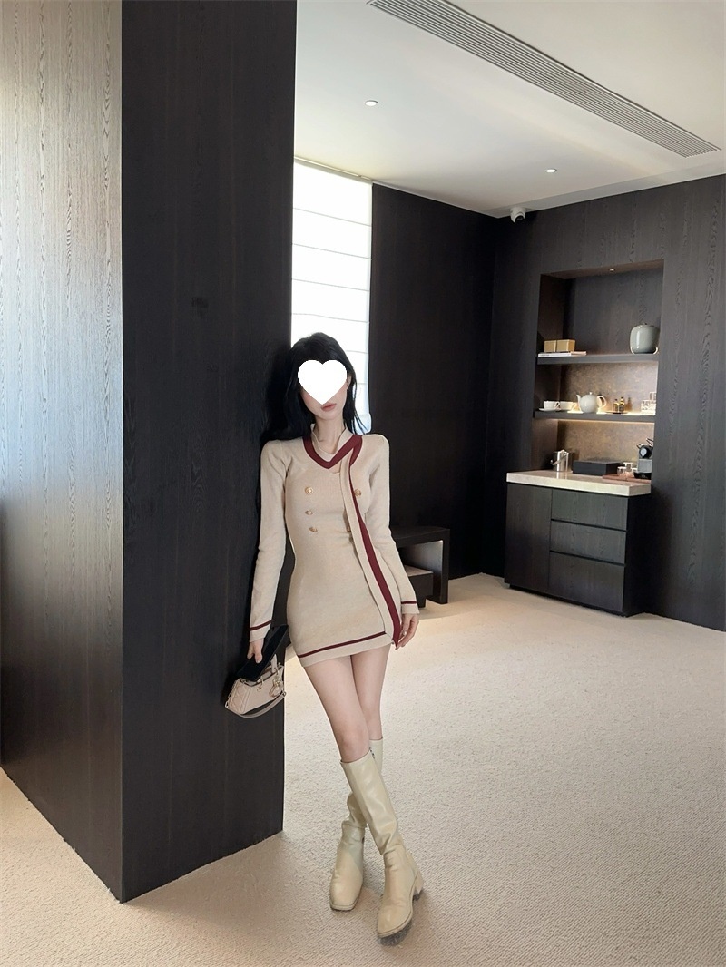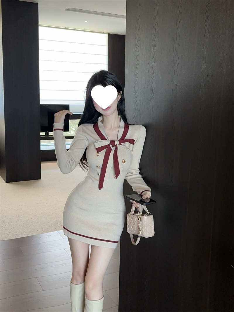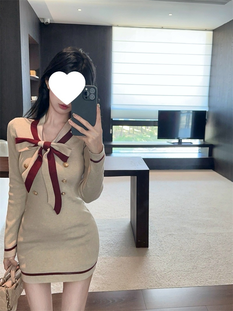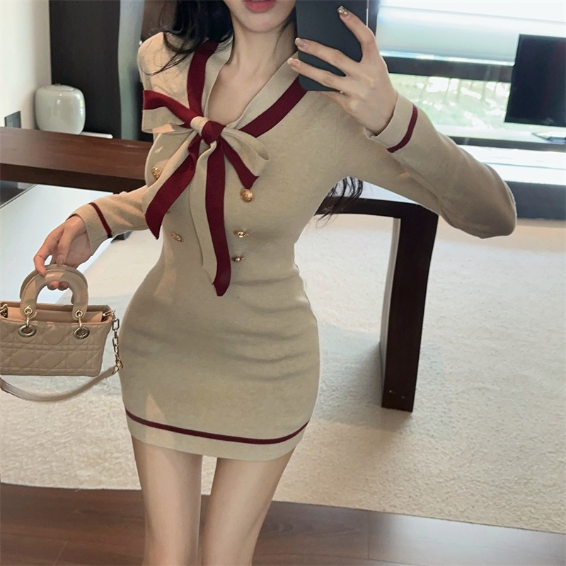 2024春秋季新款气质拼色针织连衣裙小众V领系带显瘦性感包臀短裙