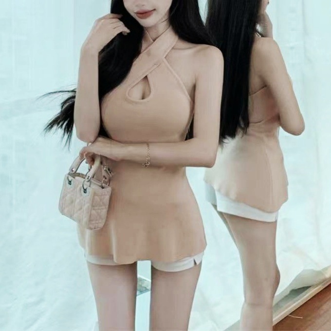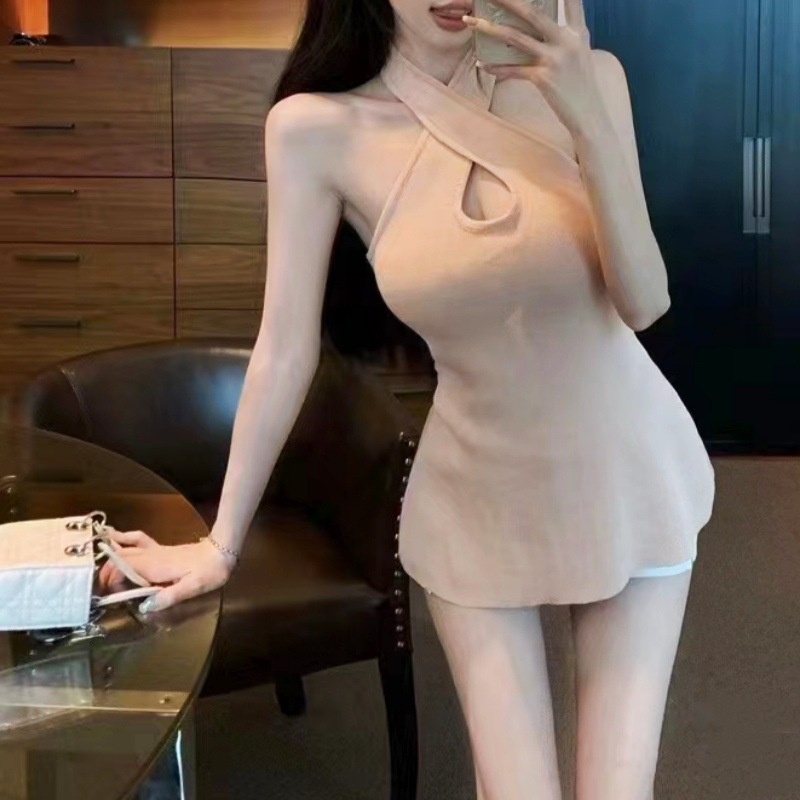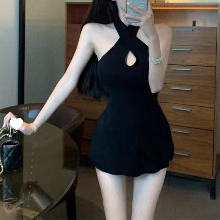 纯欲性感风设计感镂空露背挂脖连衣裙女法式高腰修身显瘦收腰短裙
