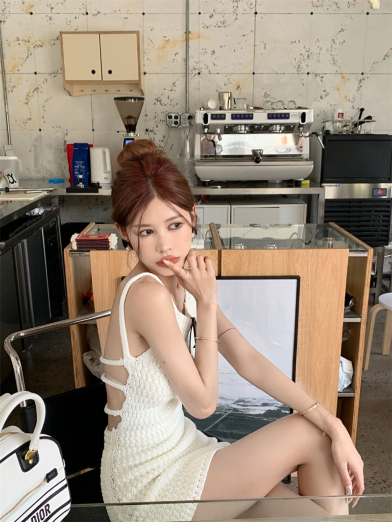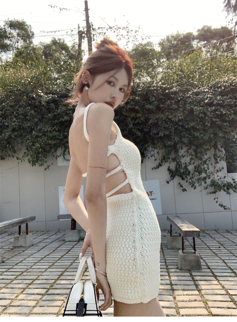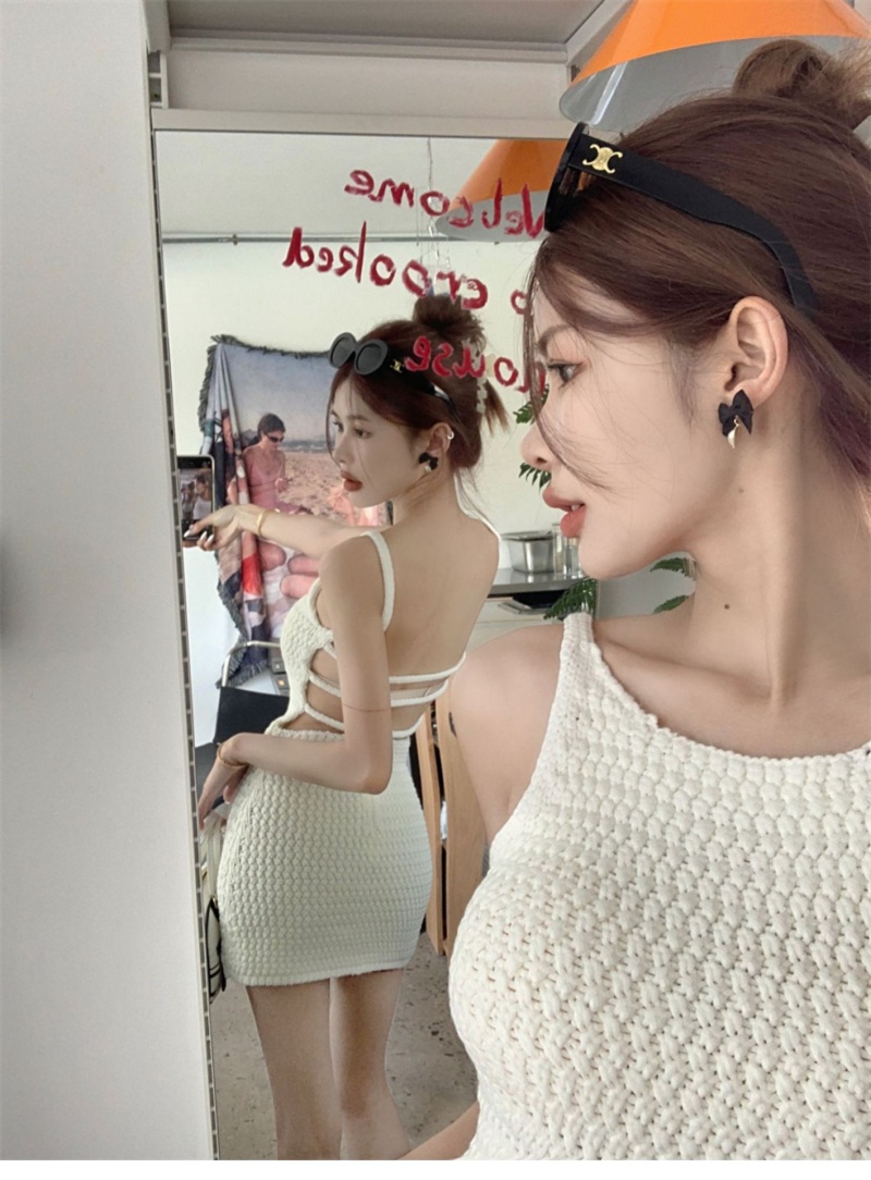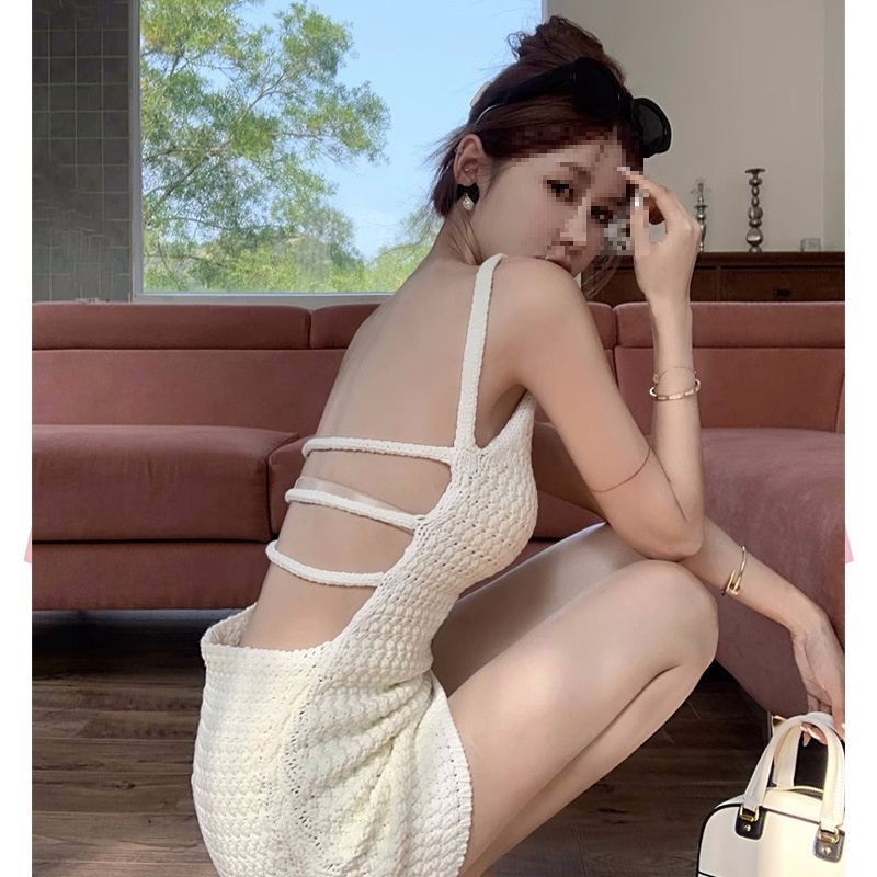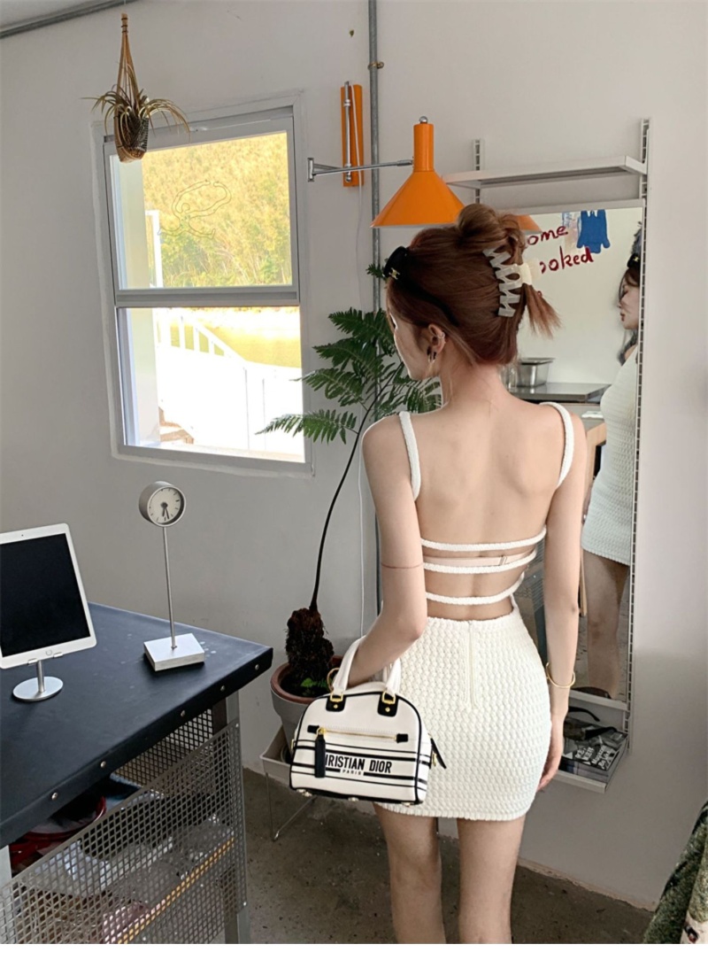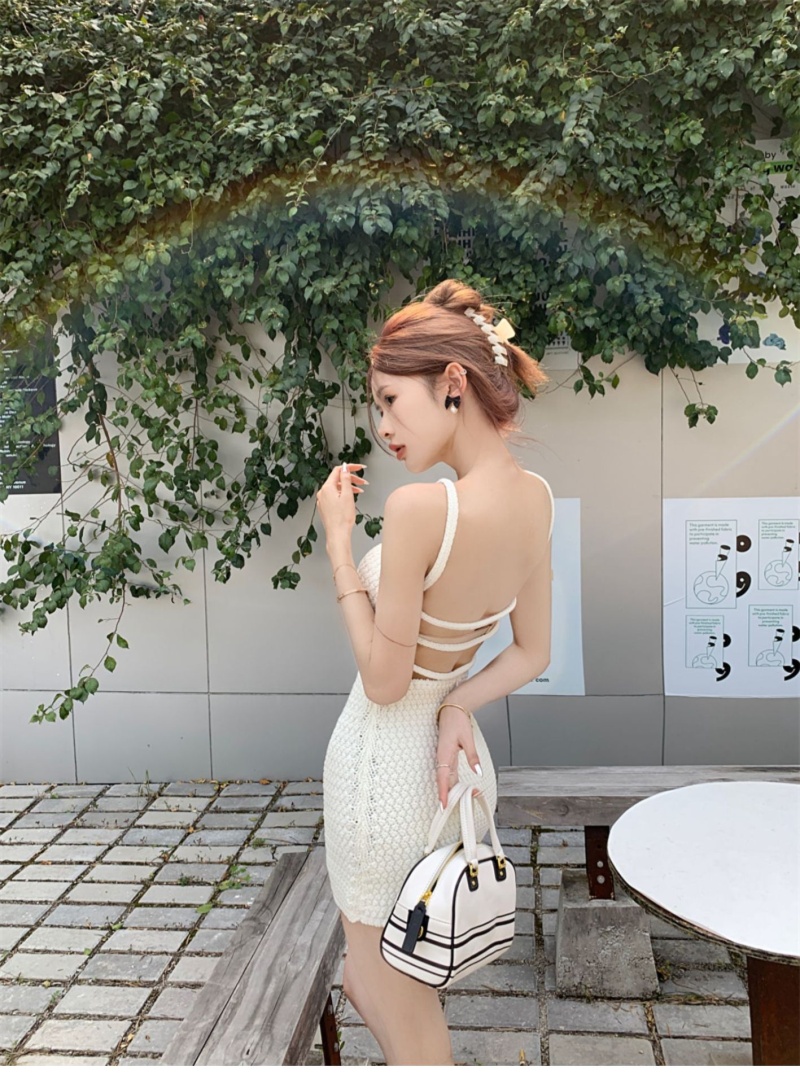 夏季性感白色针织法式吊带连衣裙女露背显瘦甜辣妹背心包臀短裙子