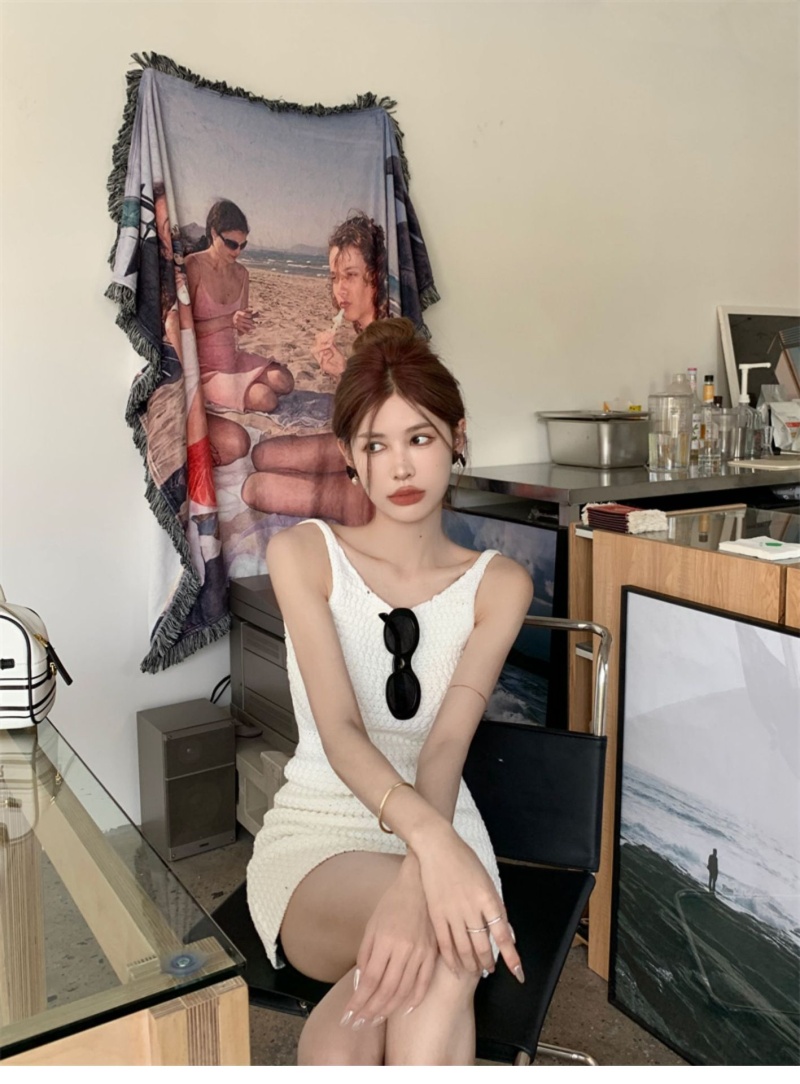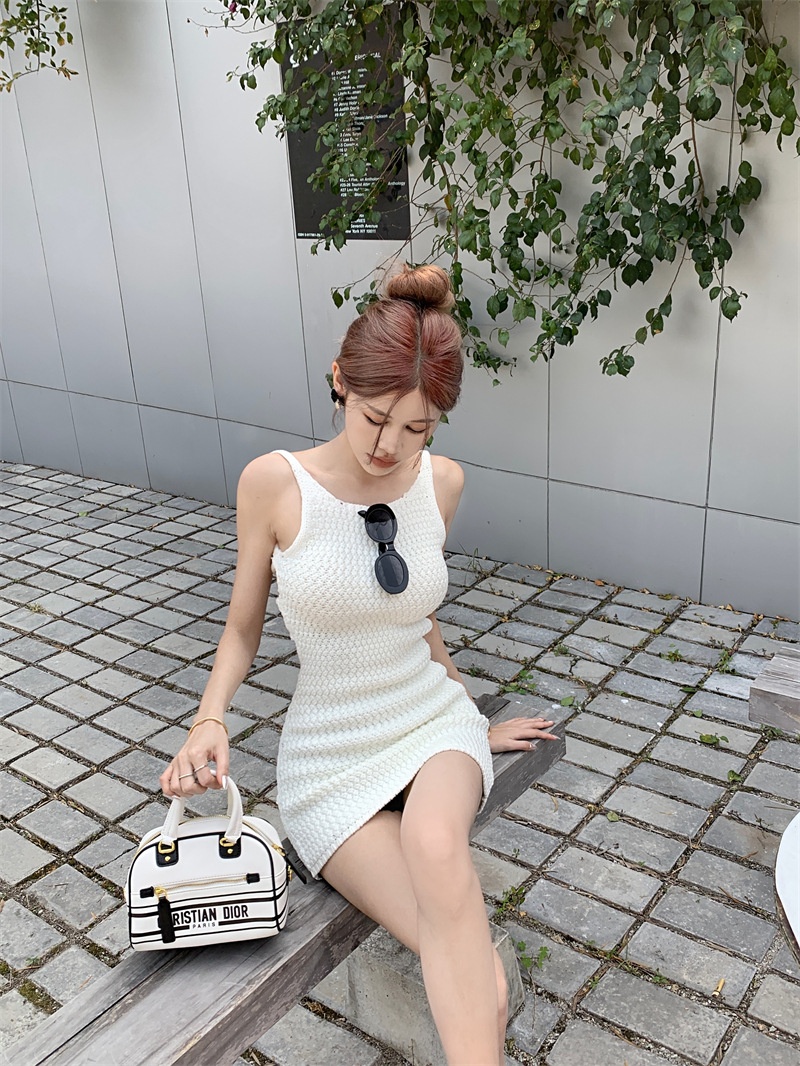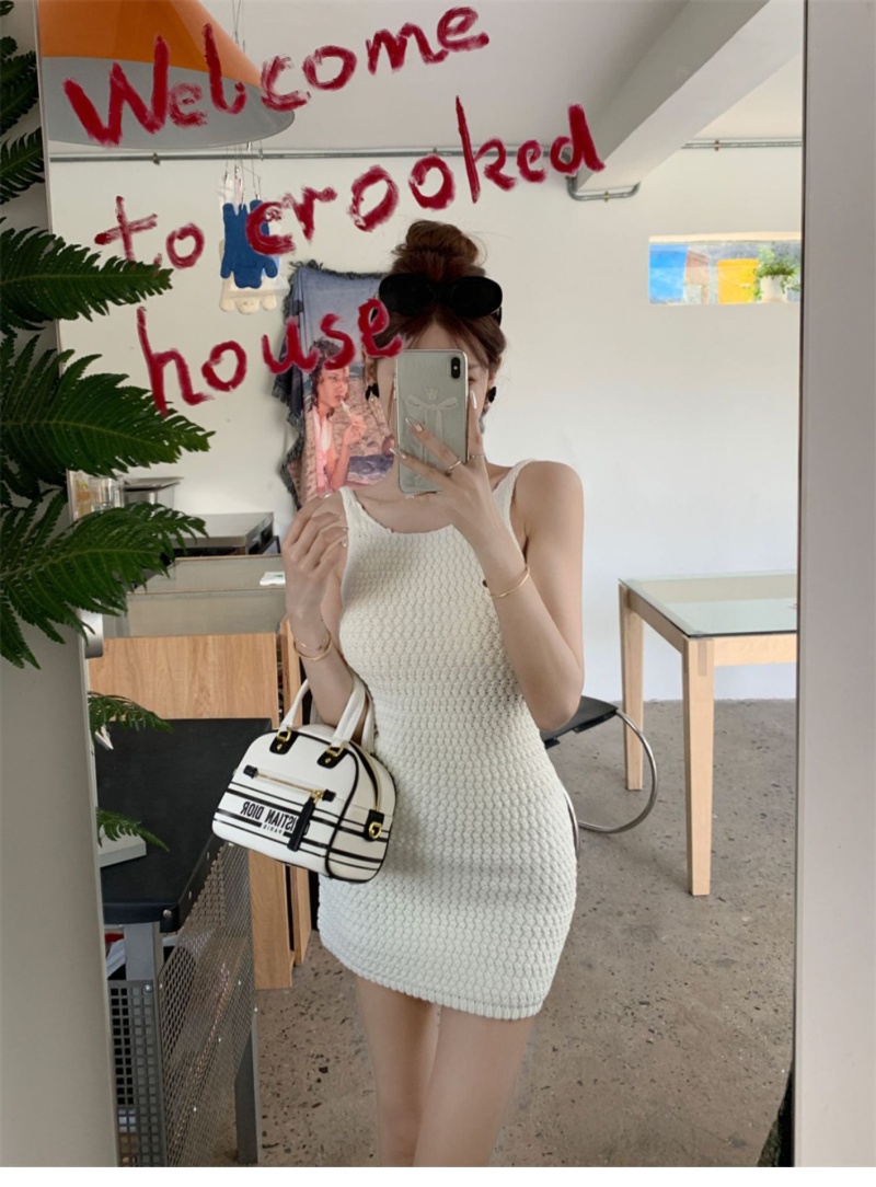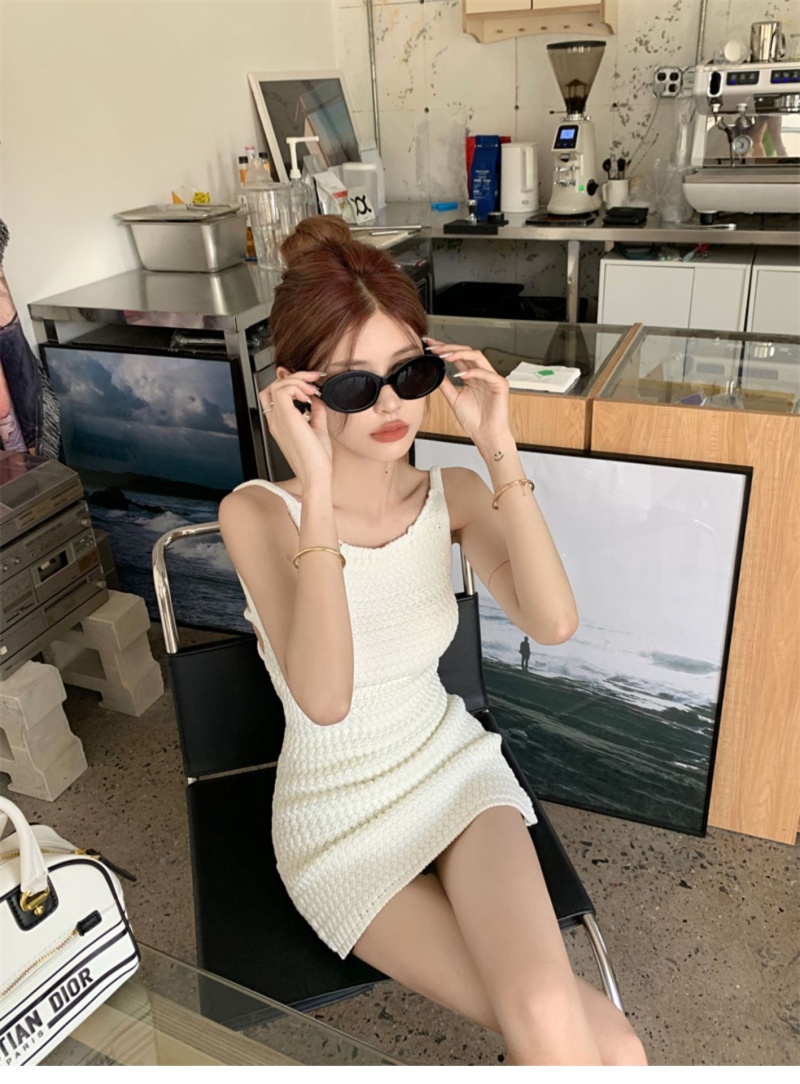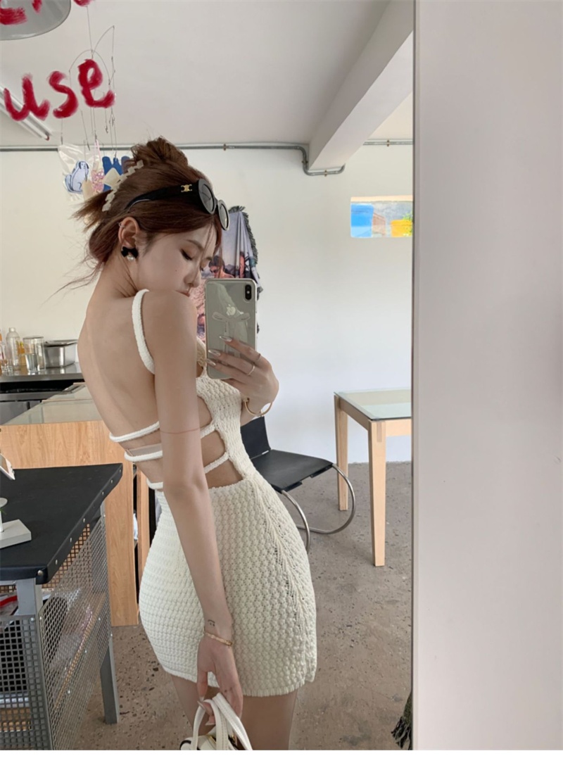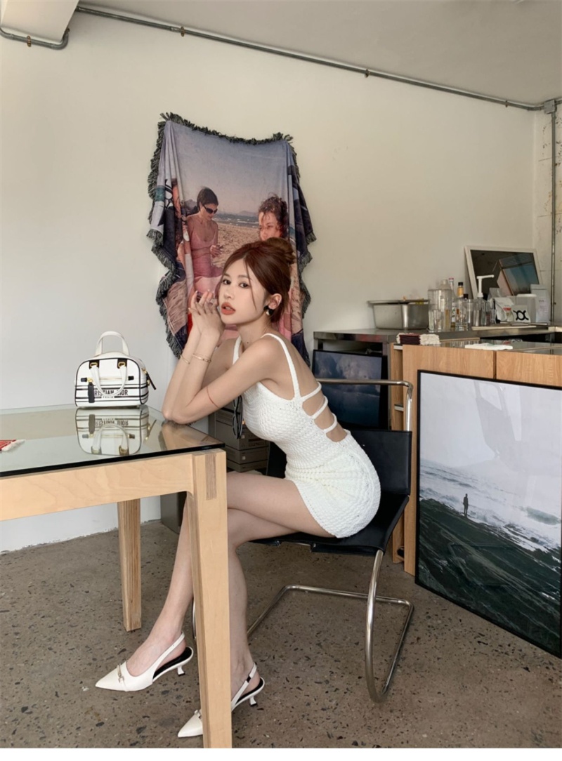 夏季性感白色针织法式吊带连衣裙女露背显瘦甜辣妹背心包臀短裙子