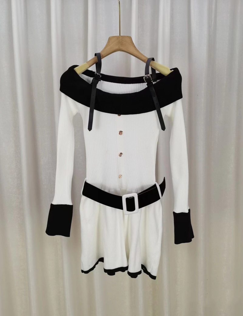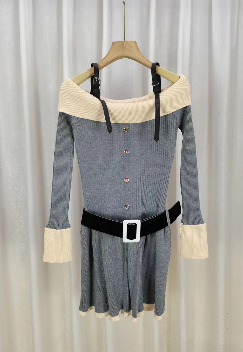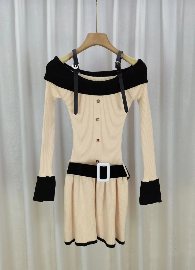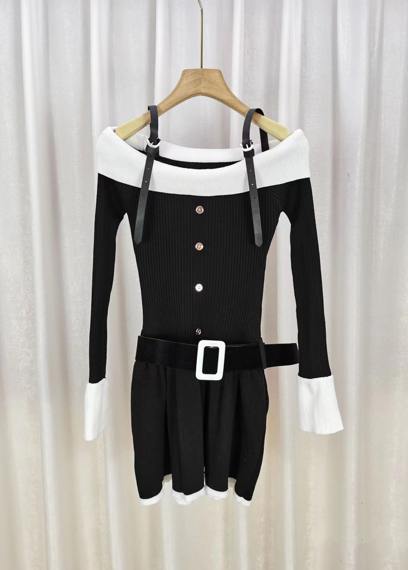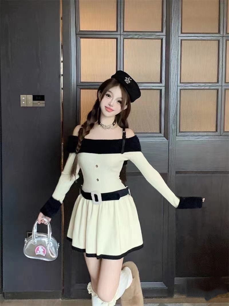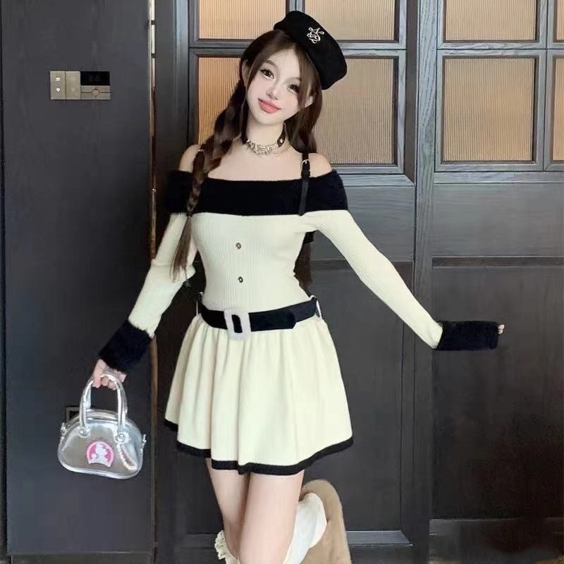 原创气质显瘦2023秋冬新款女装辣妹风一字肩长袖针织喇叭袖连衣裙