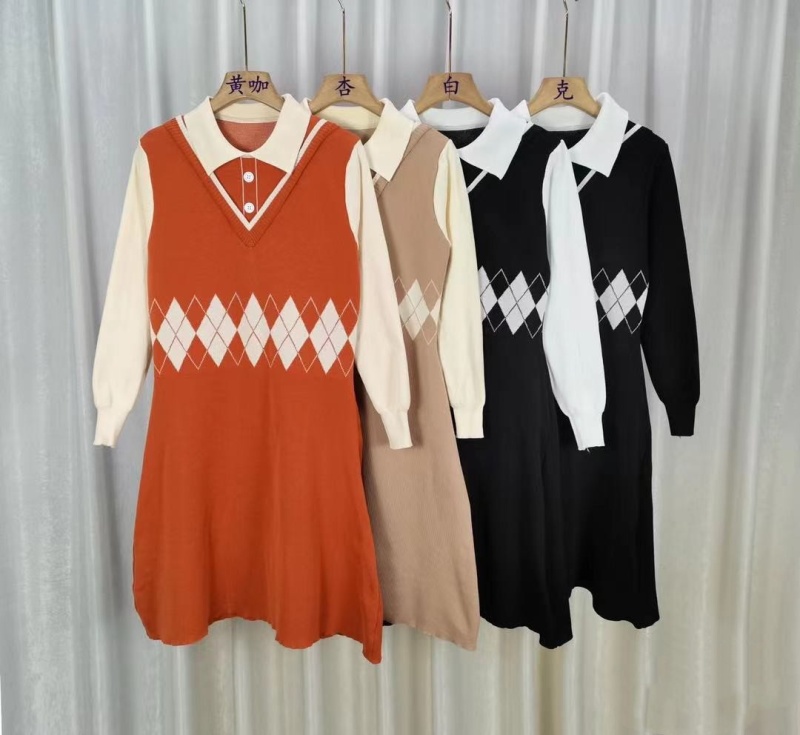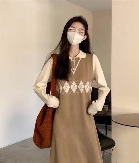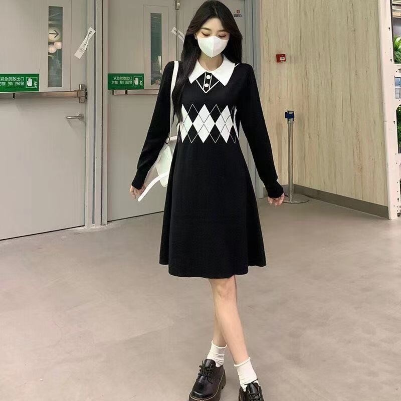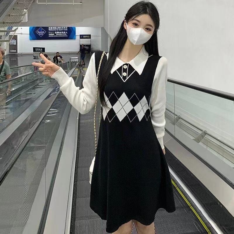2023秋冬新款韩版学院风修身翻领个性拼接菱格文艺小清新连衣裙