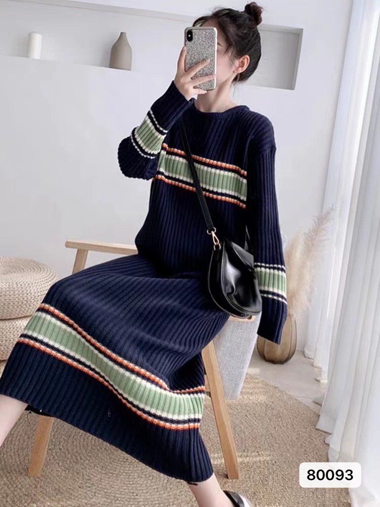 2023新款秋冬季长款过膝宽松大码显瘦条纹拼色毛衣裙针织连衣裙女