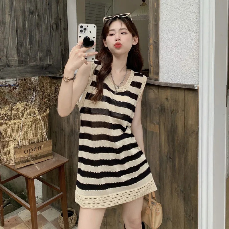 2022夏季新款韩版背心裙小个子短裙设计感显瘦无袖条纹连衣裙子女