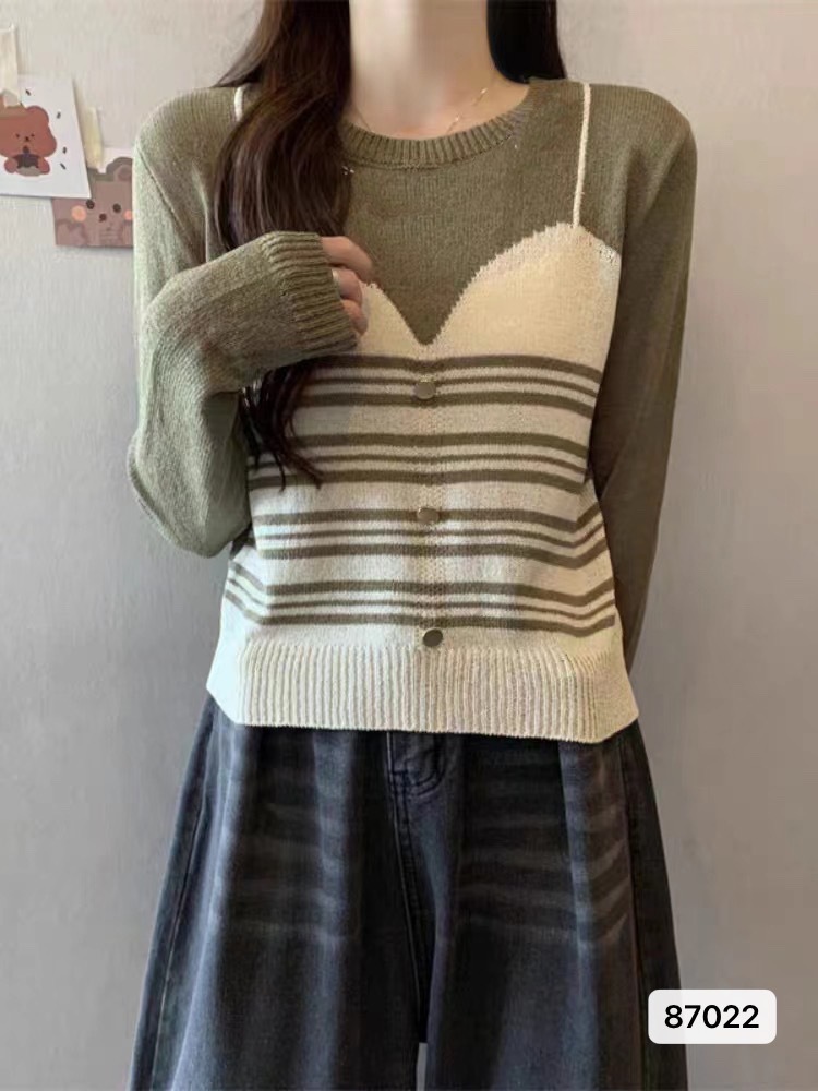 女装宽松遮肉假两件拼色冰丝针织衫秋季薄款时尚百搭上衣短袖女潮