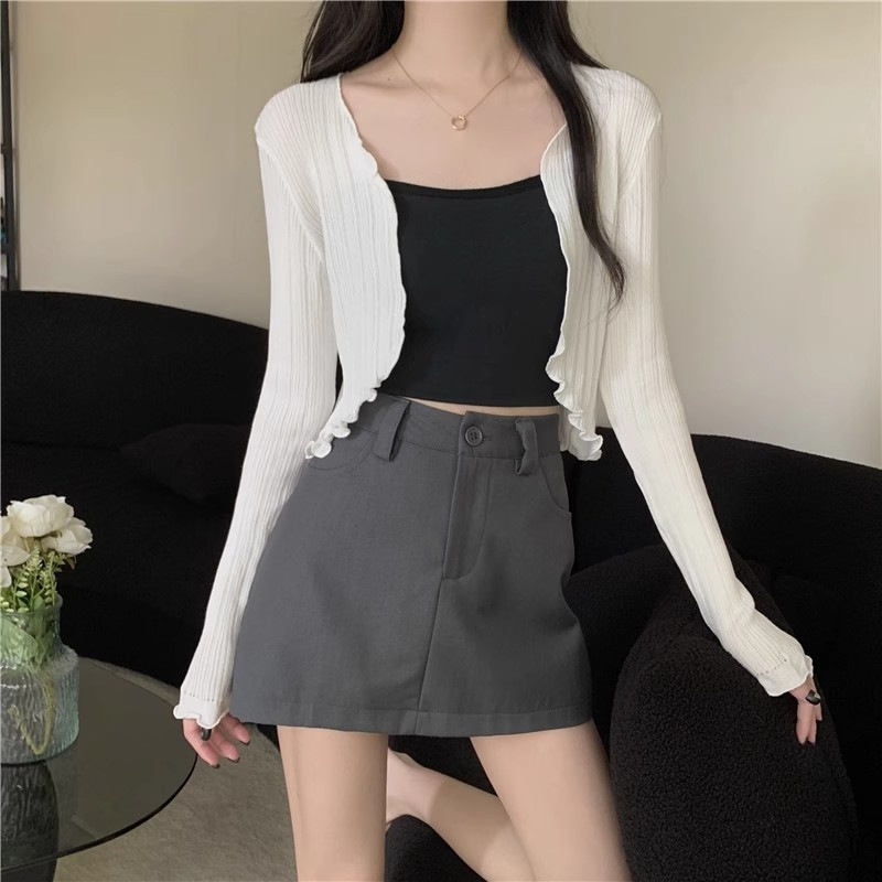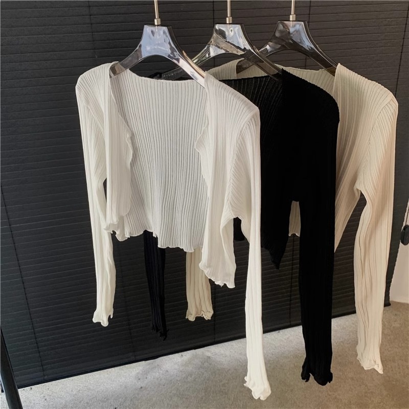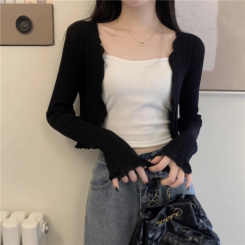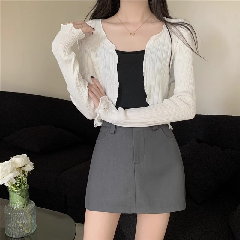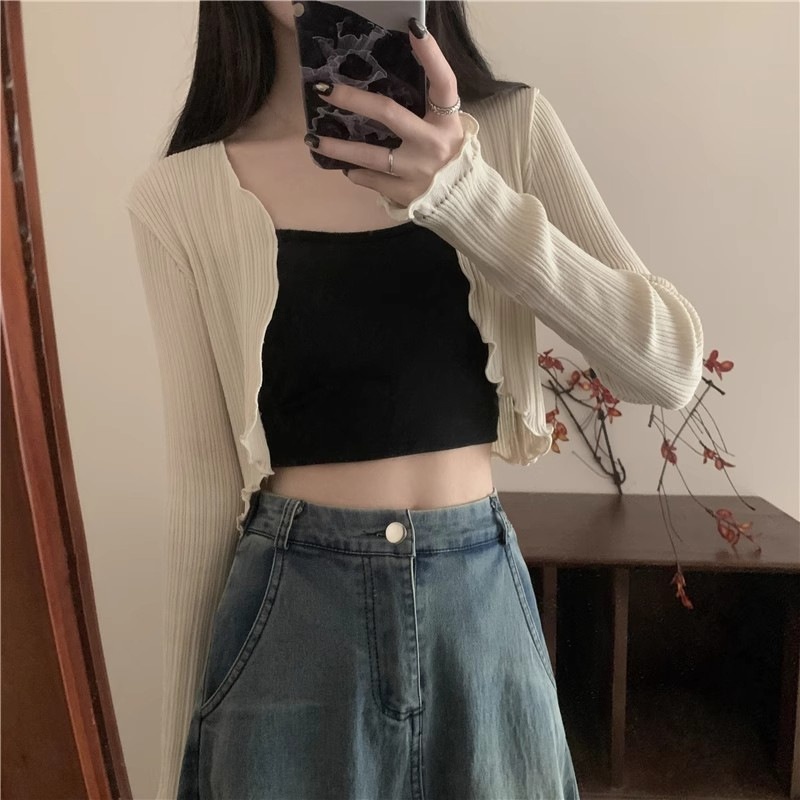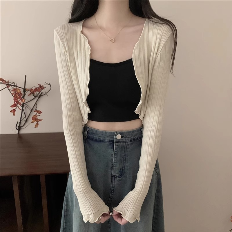 杏色冰丝长袖针织开衫女夏季薄款防晒罩衫配吊带外搭披肩短款上衣