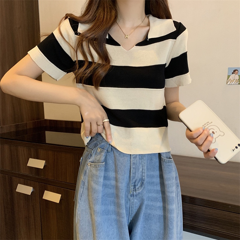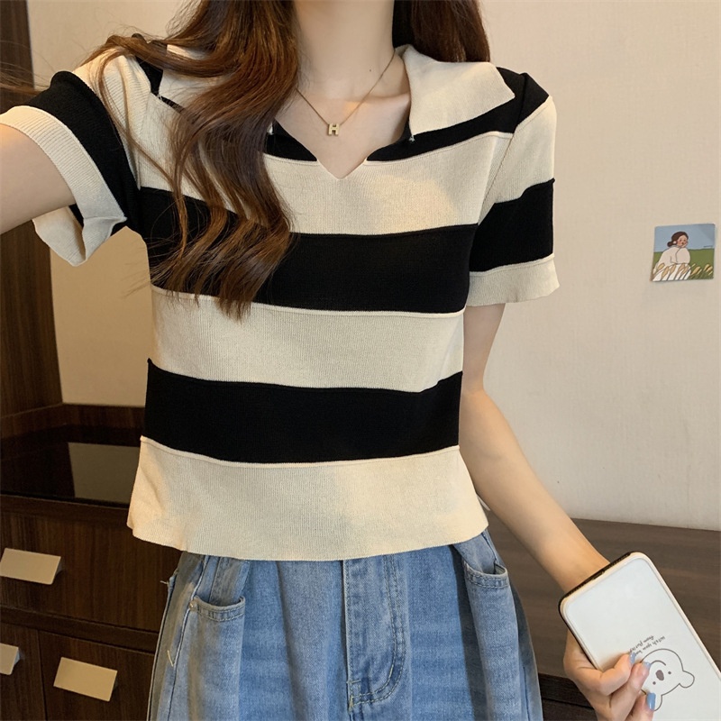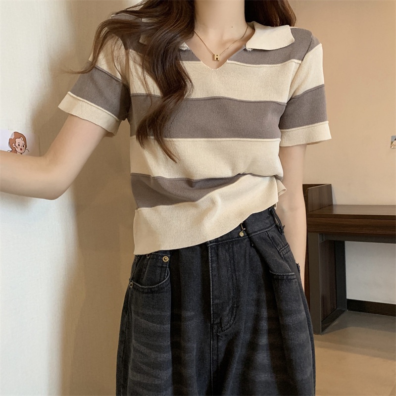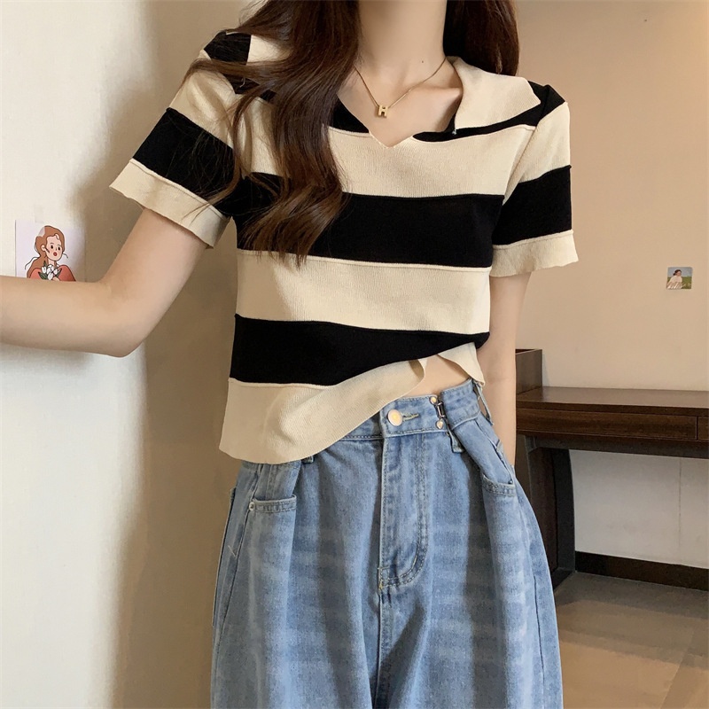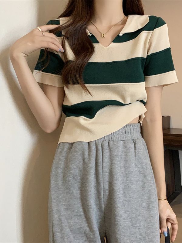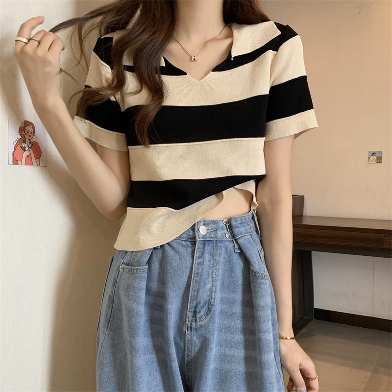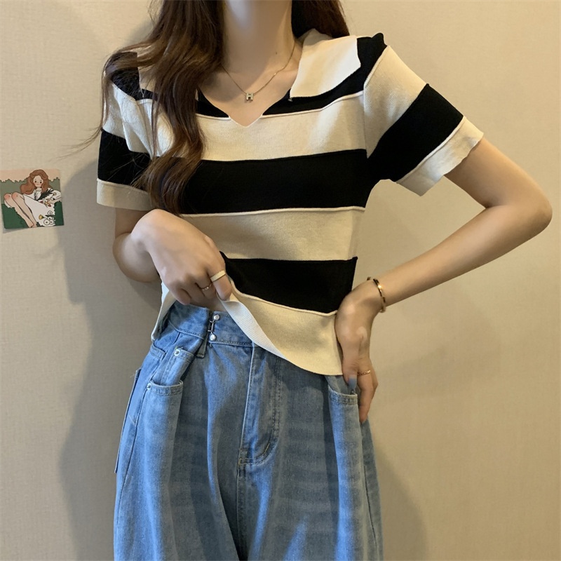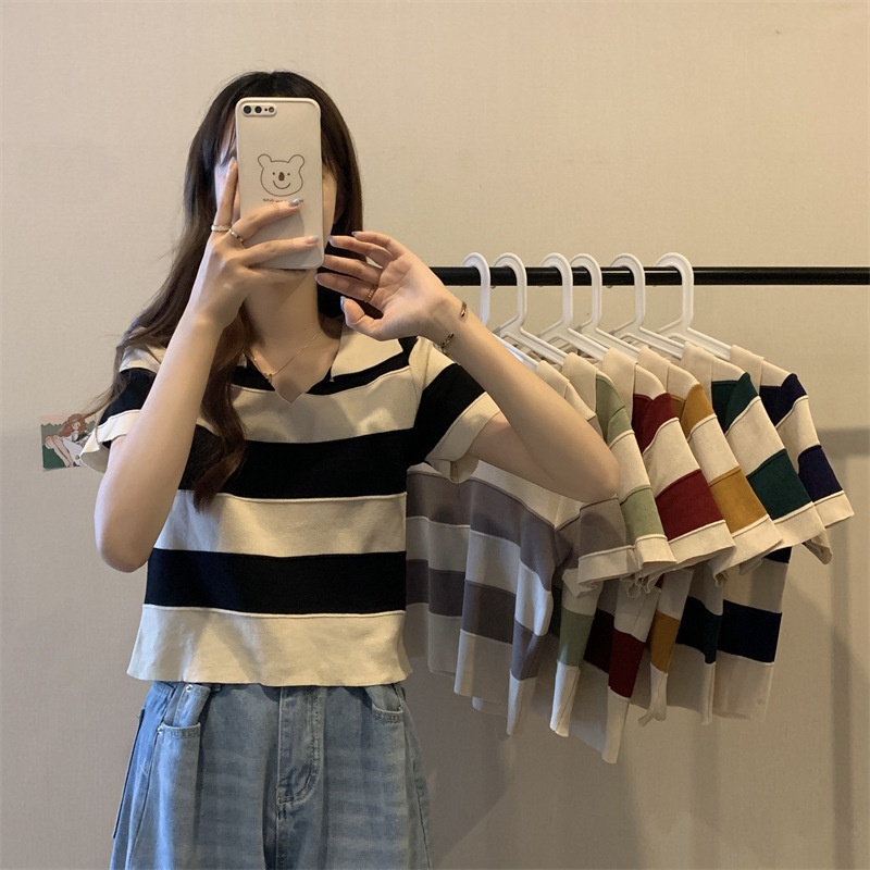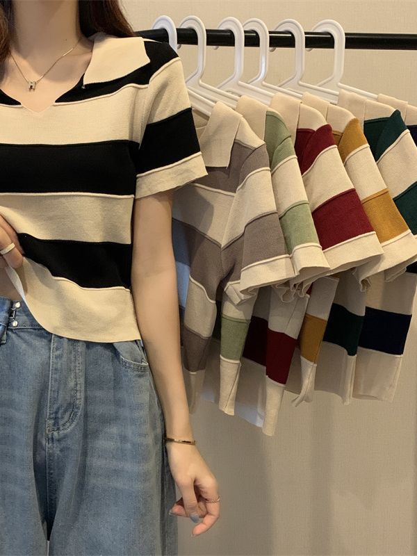 2023夏季新款韩版撞色百搭条纹V领宽松显瘦洋气针织衫短袖上衣女