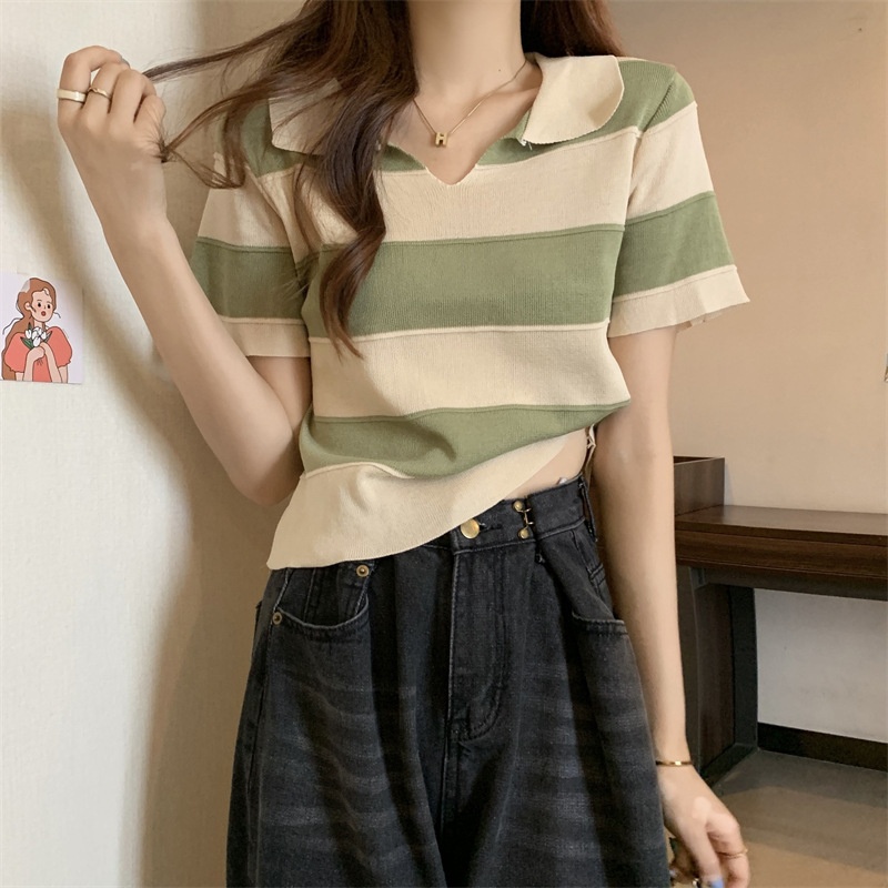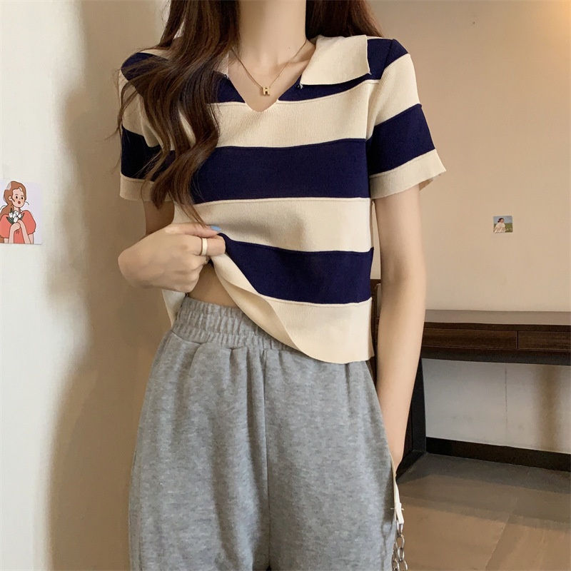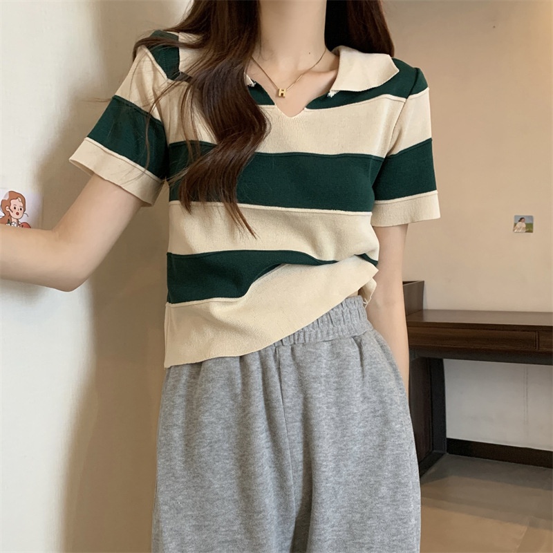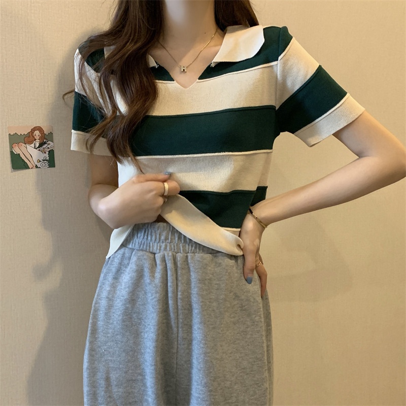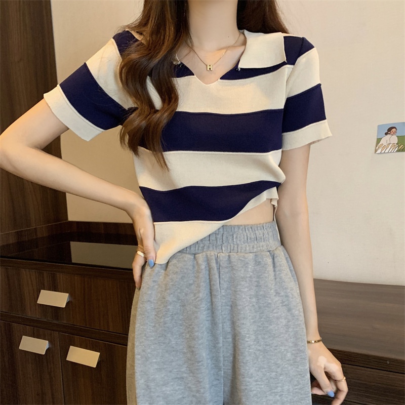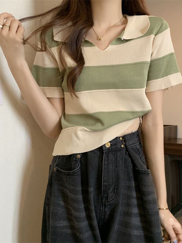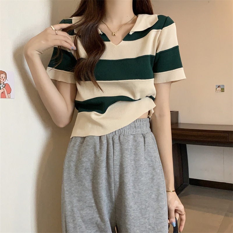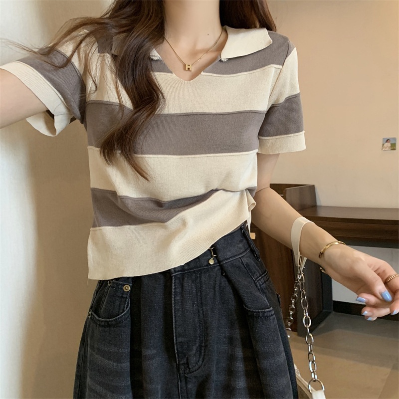 2023夏季新款韩版撞色百搭条纹V领宽松显瘦洋气针织衫短袖上衣女