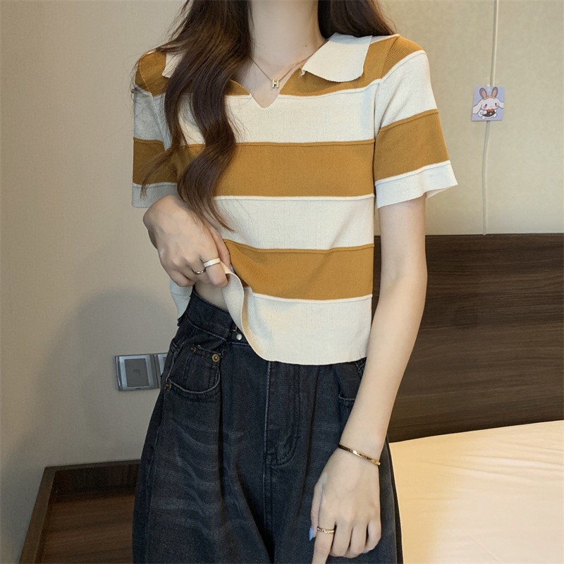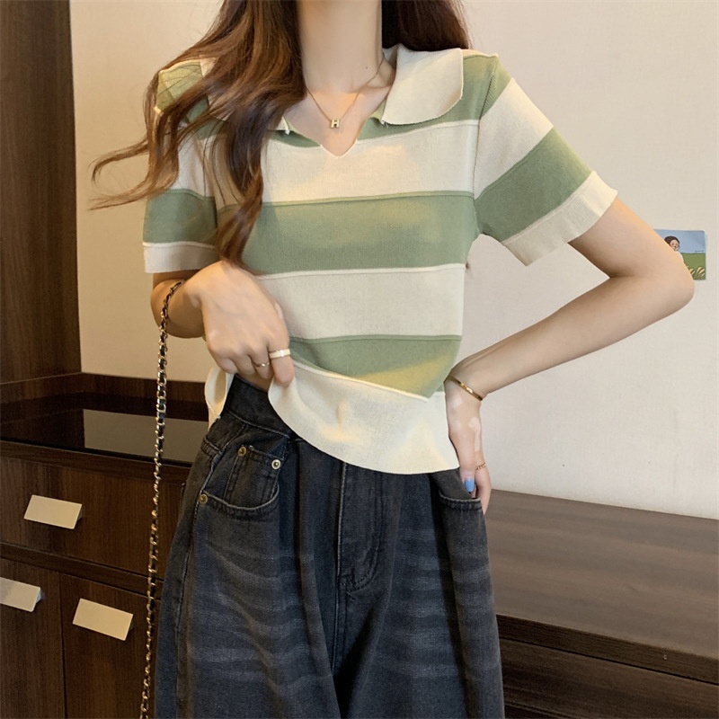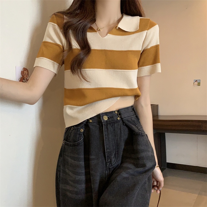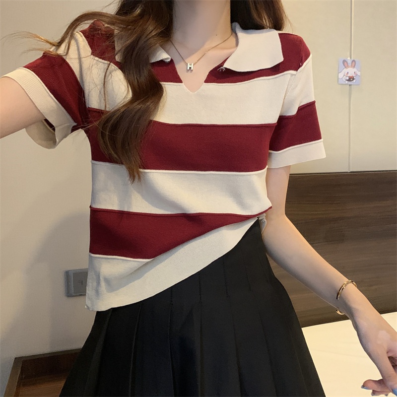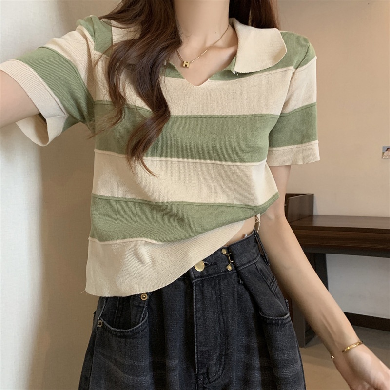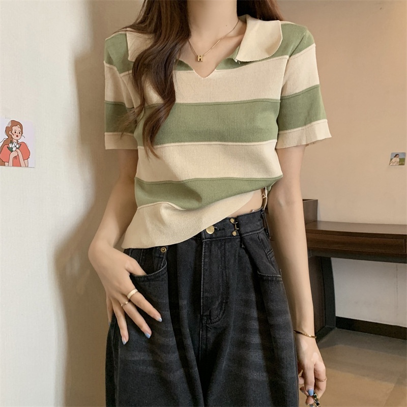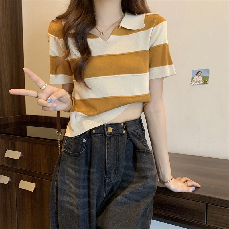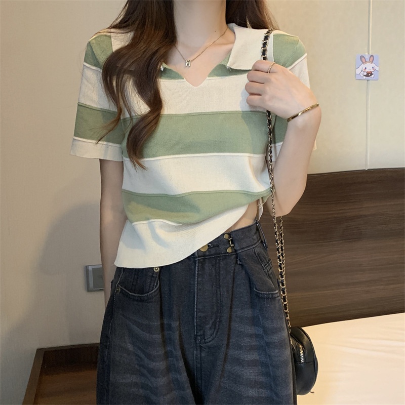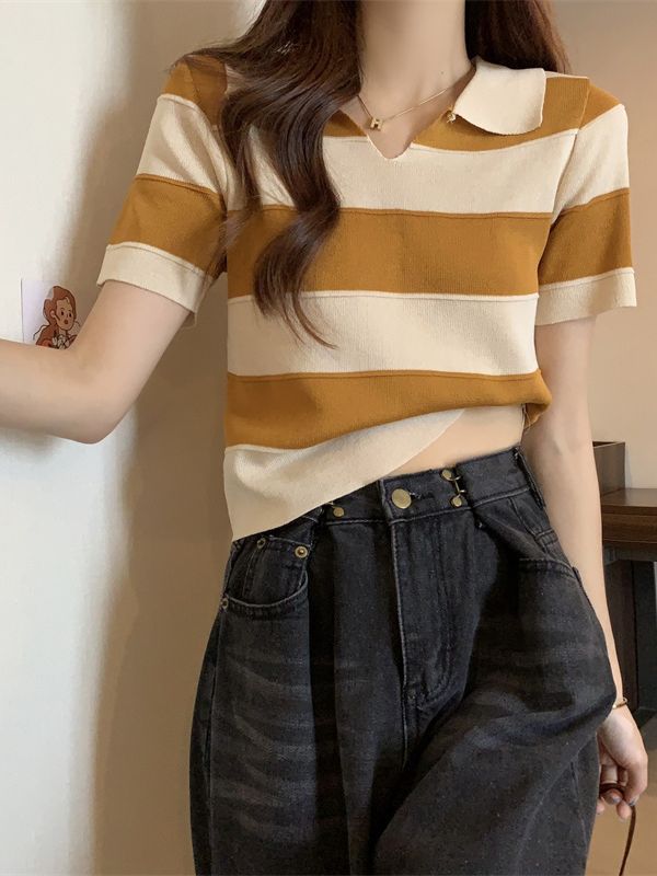 2023夏季新款韩版撞色百搭条纹V领宽松显瘦洋气针织衫短袖上衣女