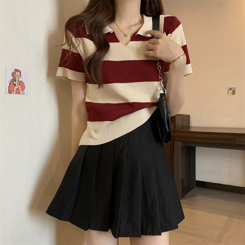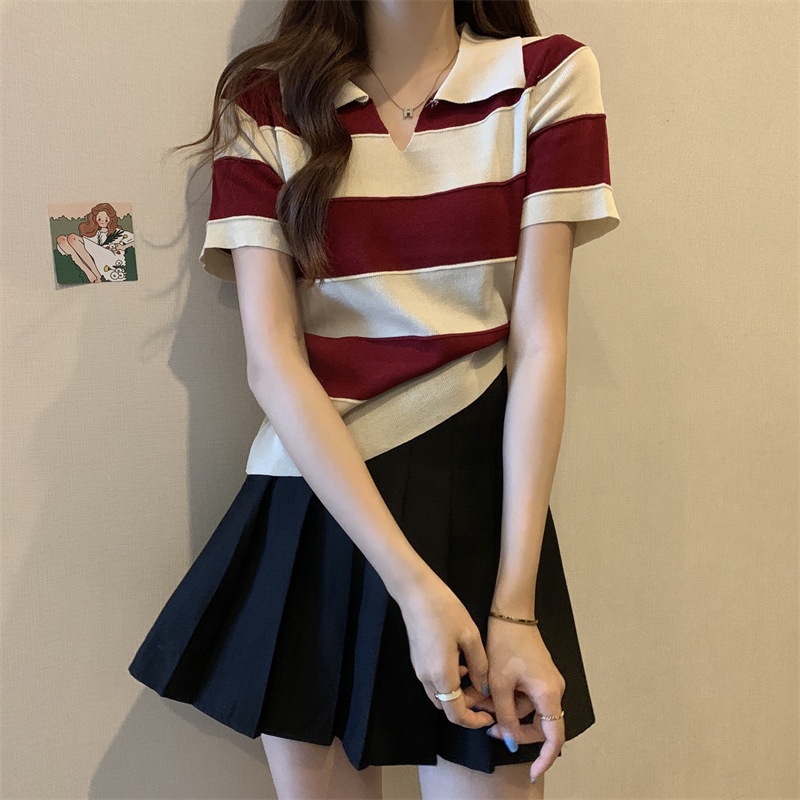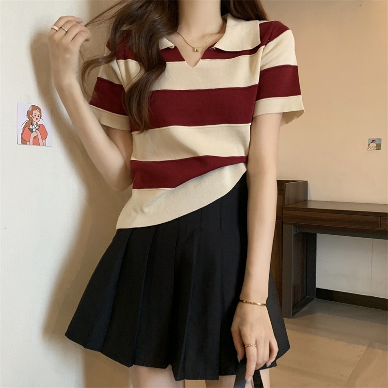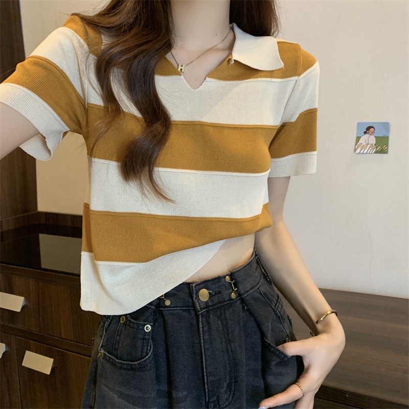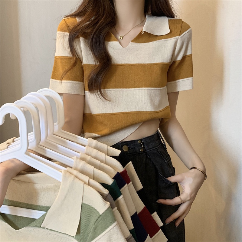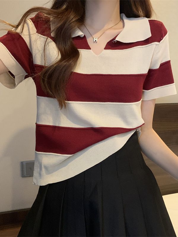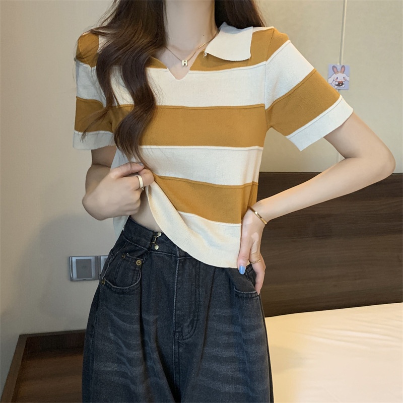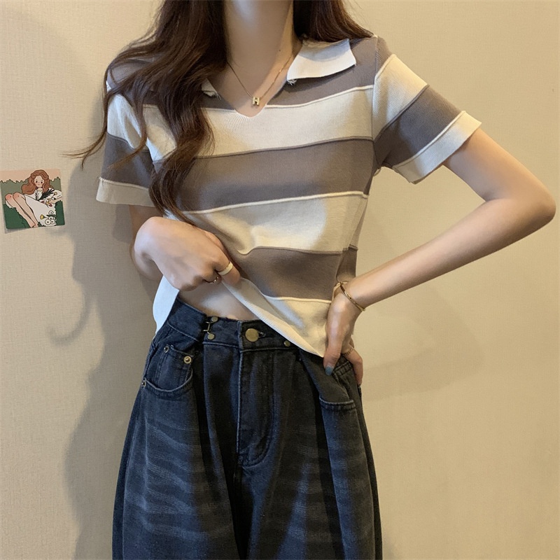 2023夏季新款韩版撞色百搭条纹V领宽松显瘦洋气针织衫短袖上衣女