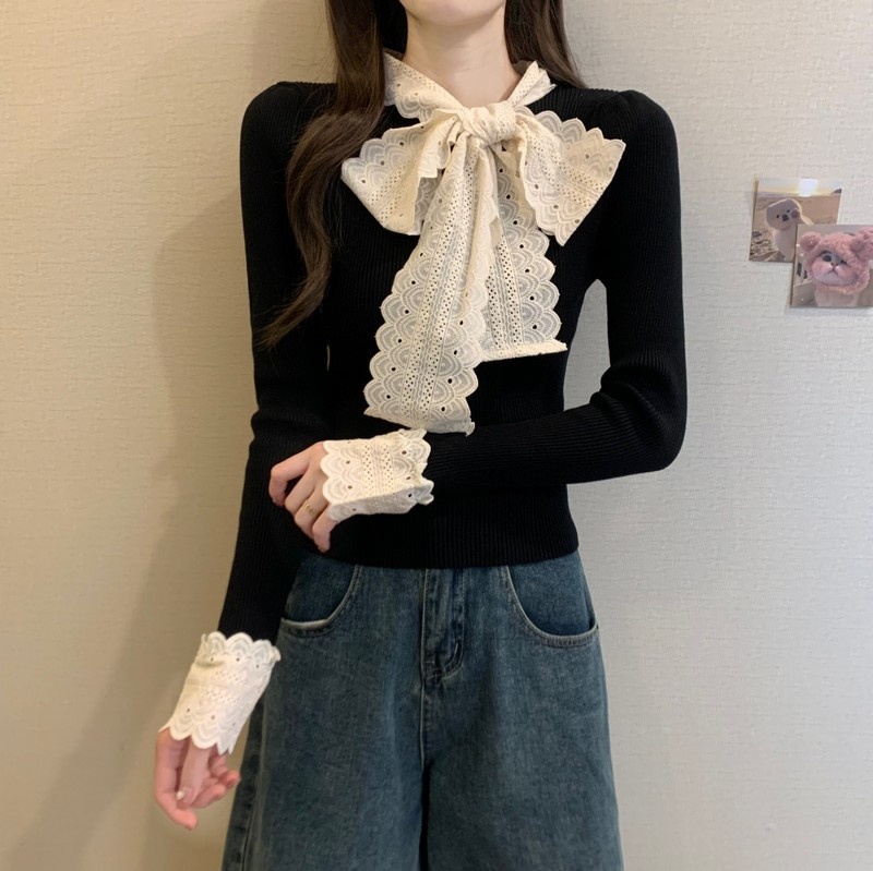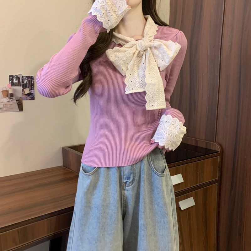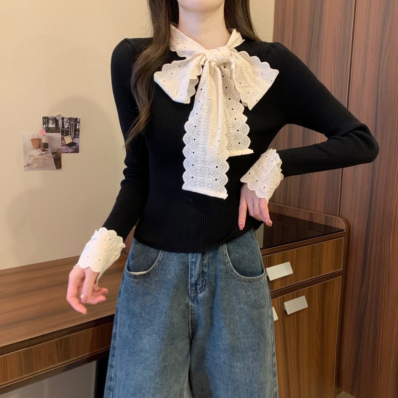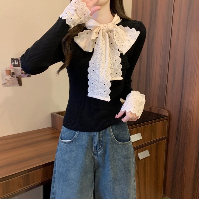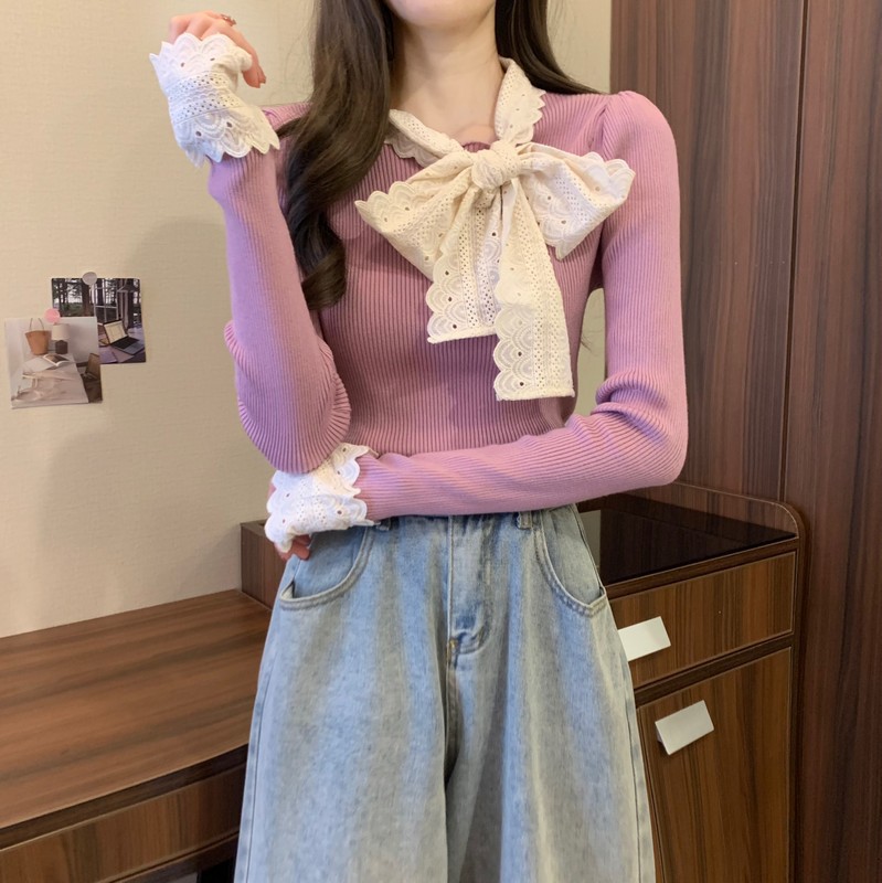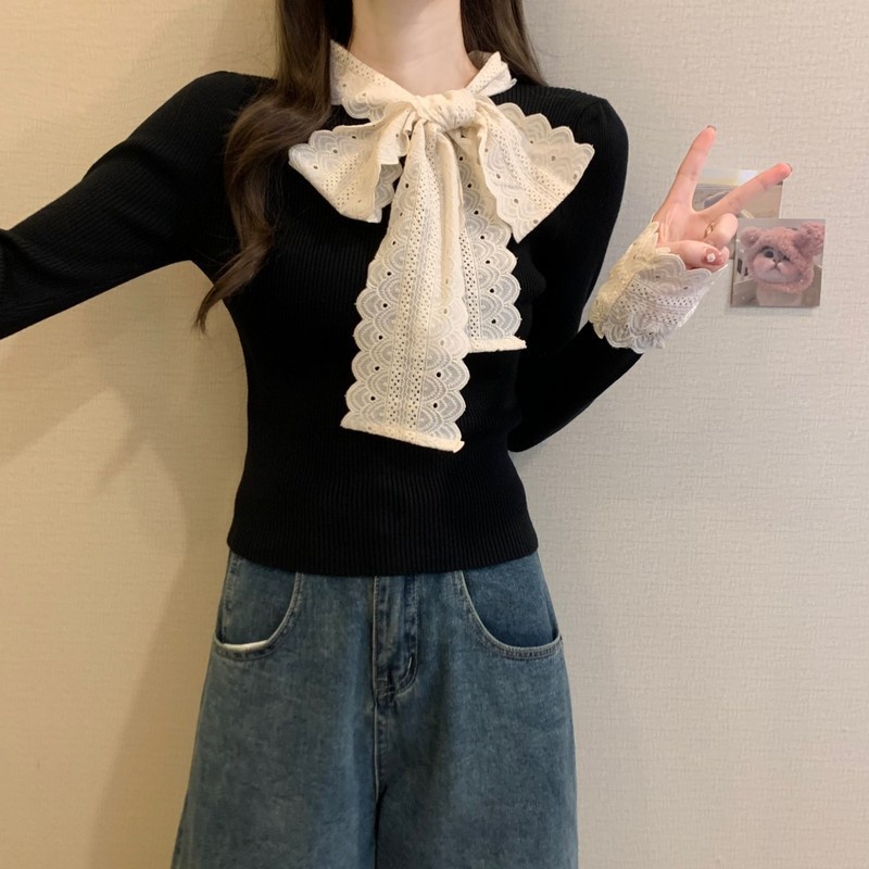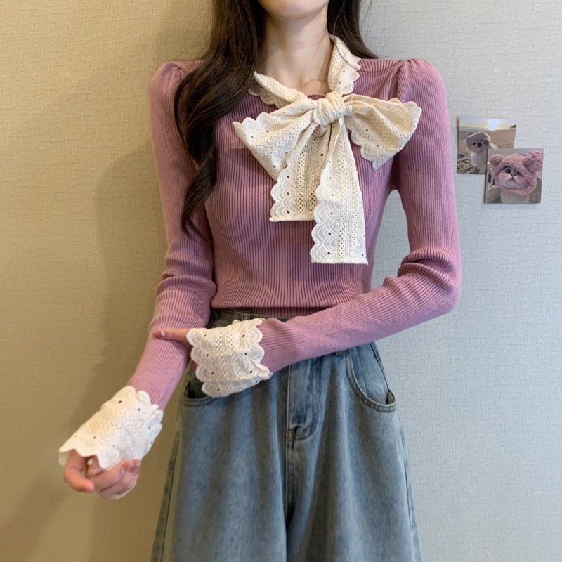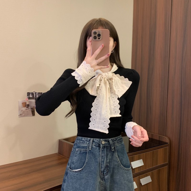 2024秋季新款法式蕾丝花边蝴蝶结气质修身显瘦甜美清新针织上衣女
