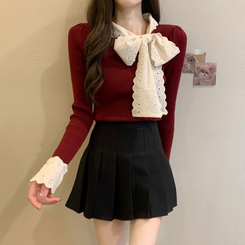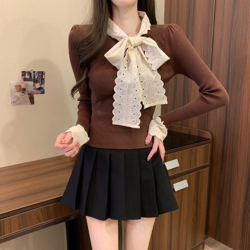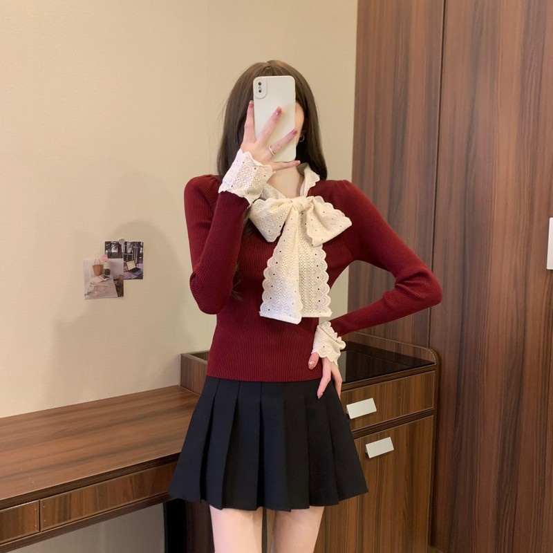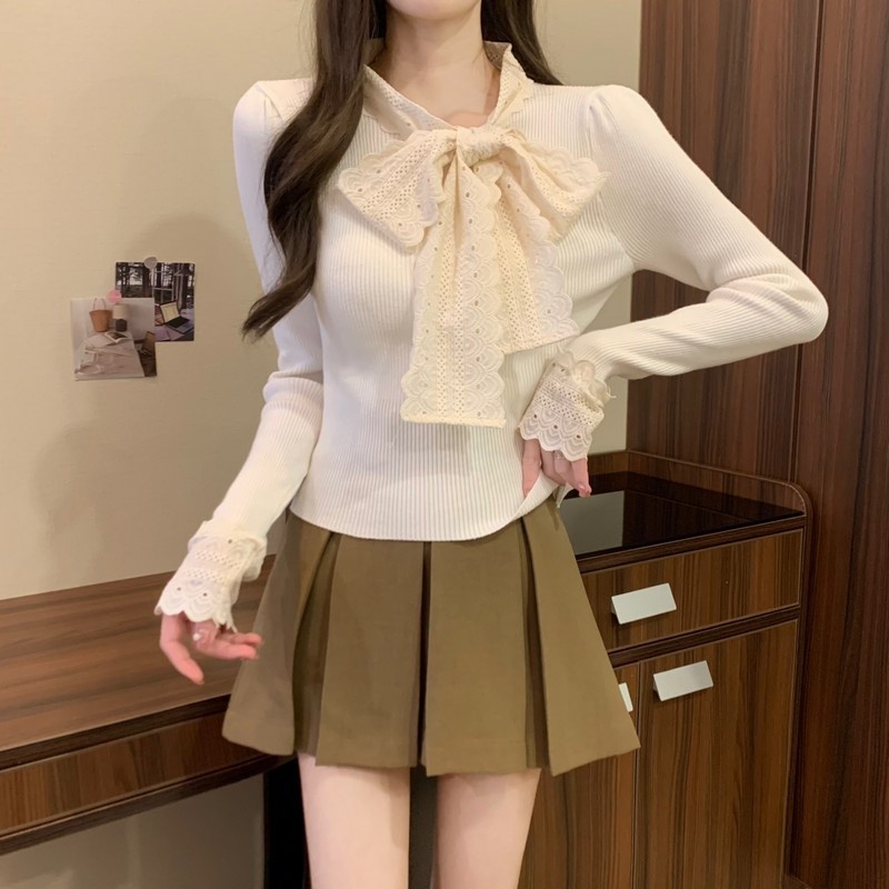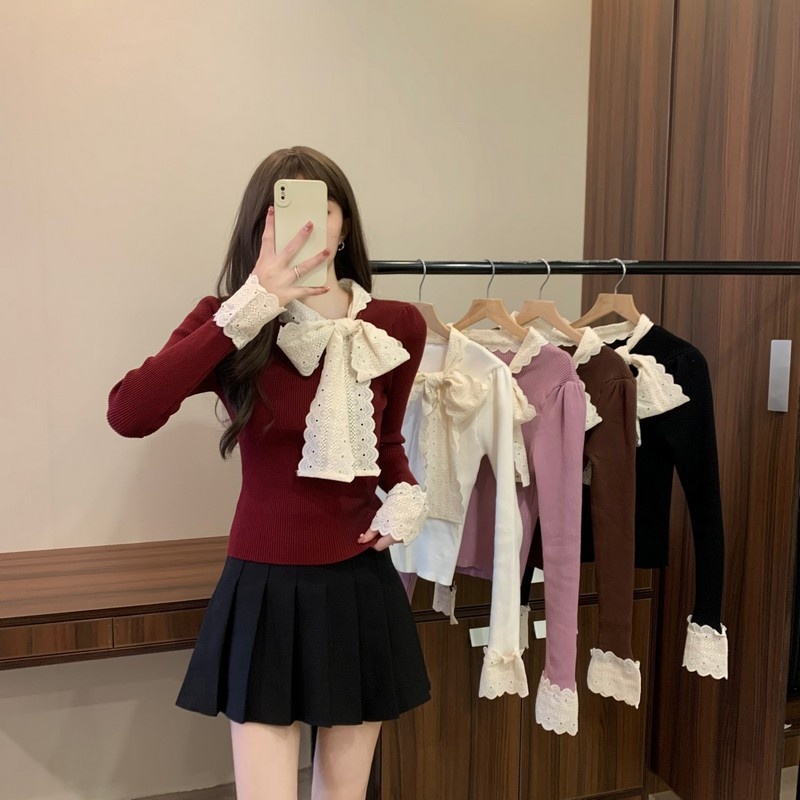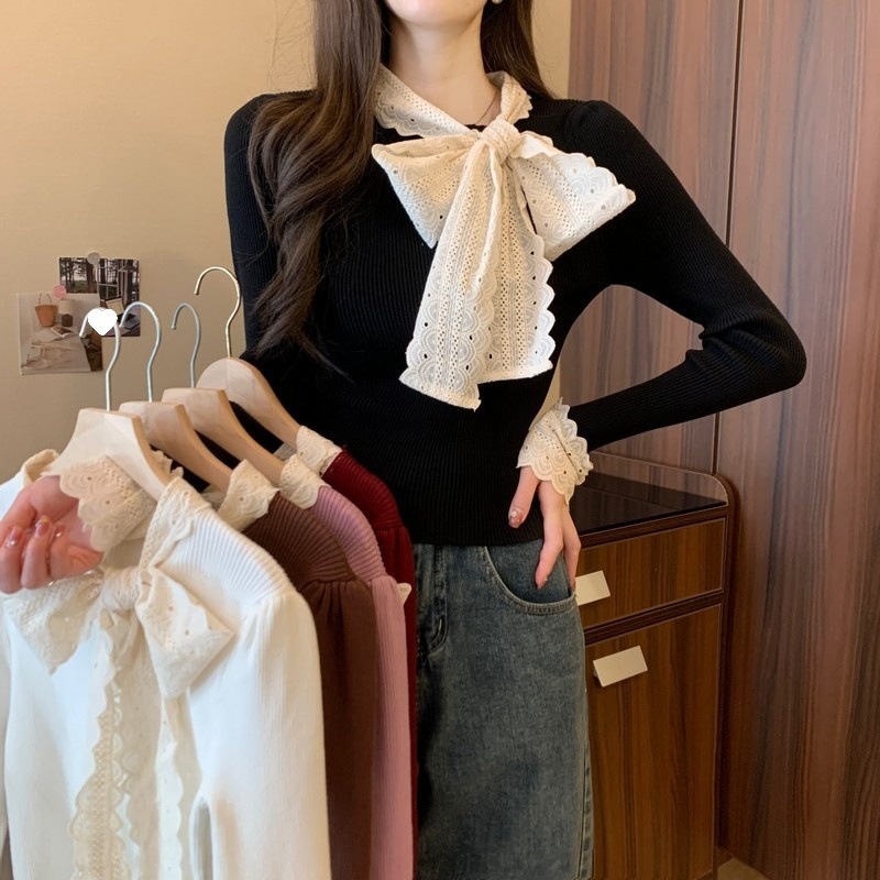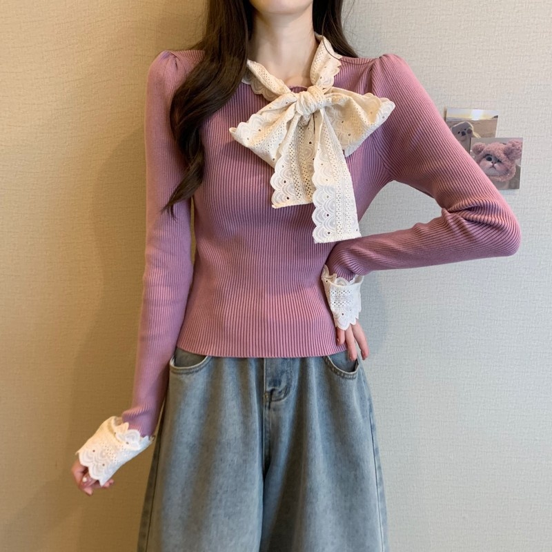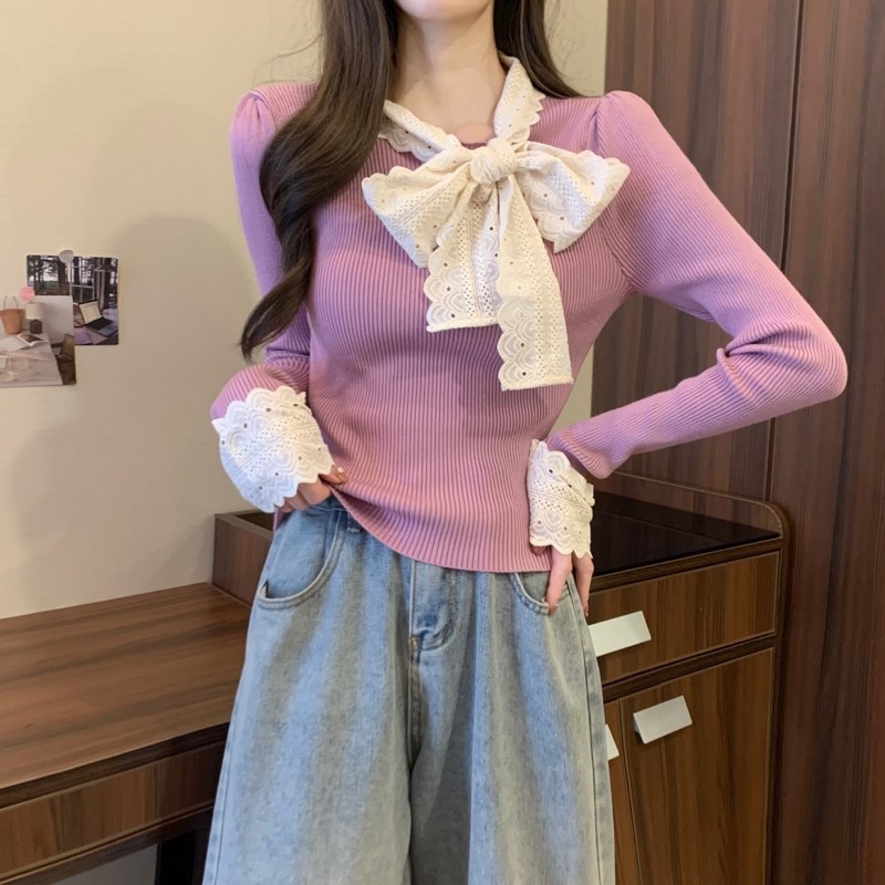 2024秋季新款法式蕾丝花边蝴蝶结气质修身显瘦甜美清新针织上衣女