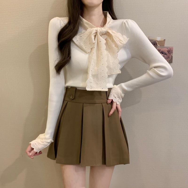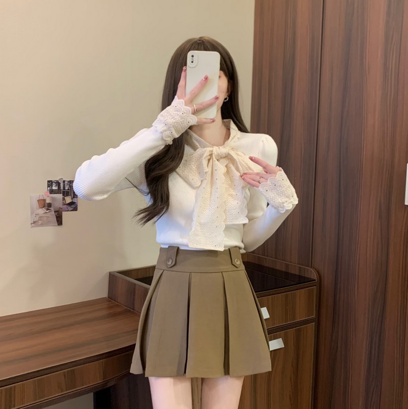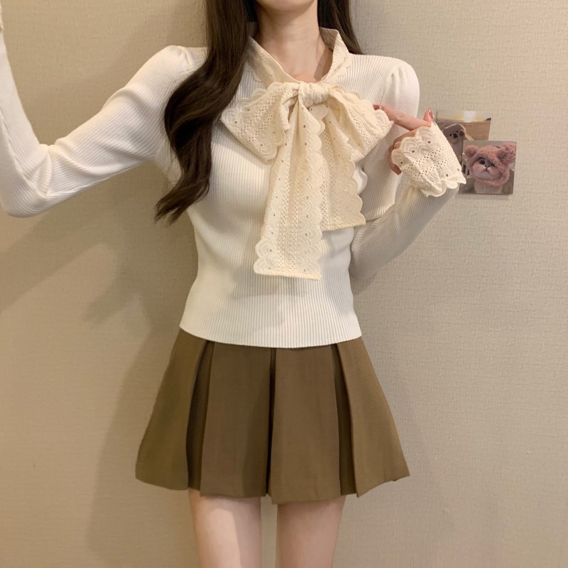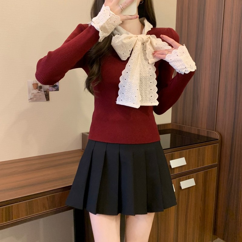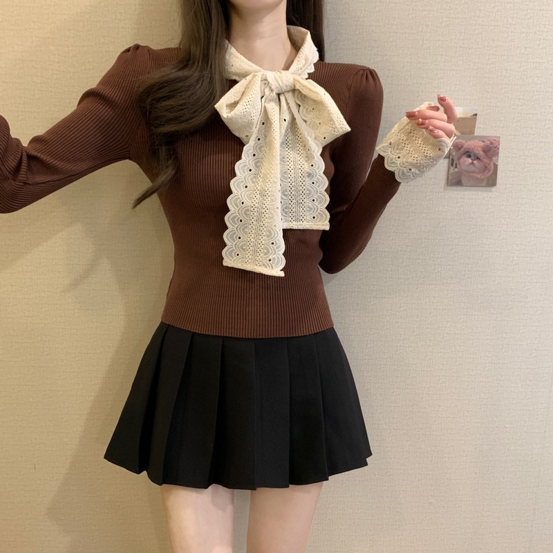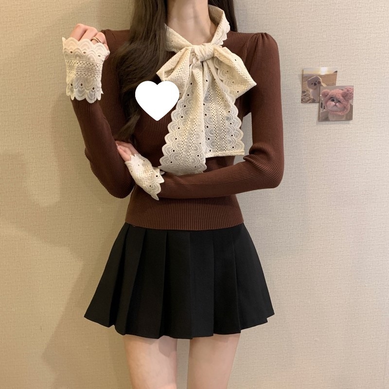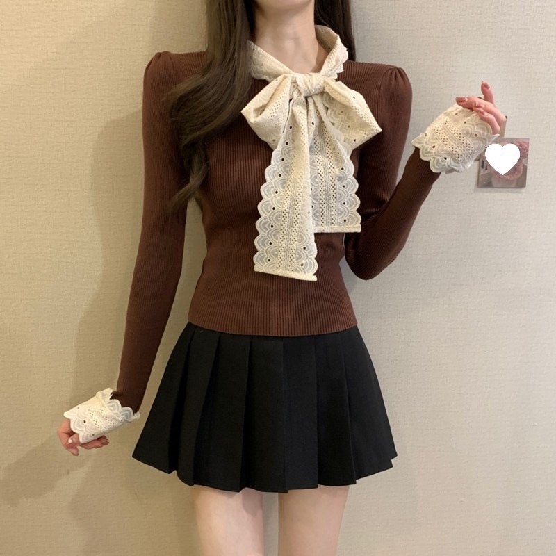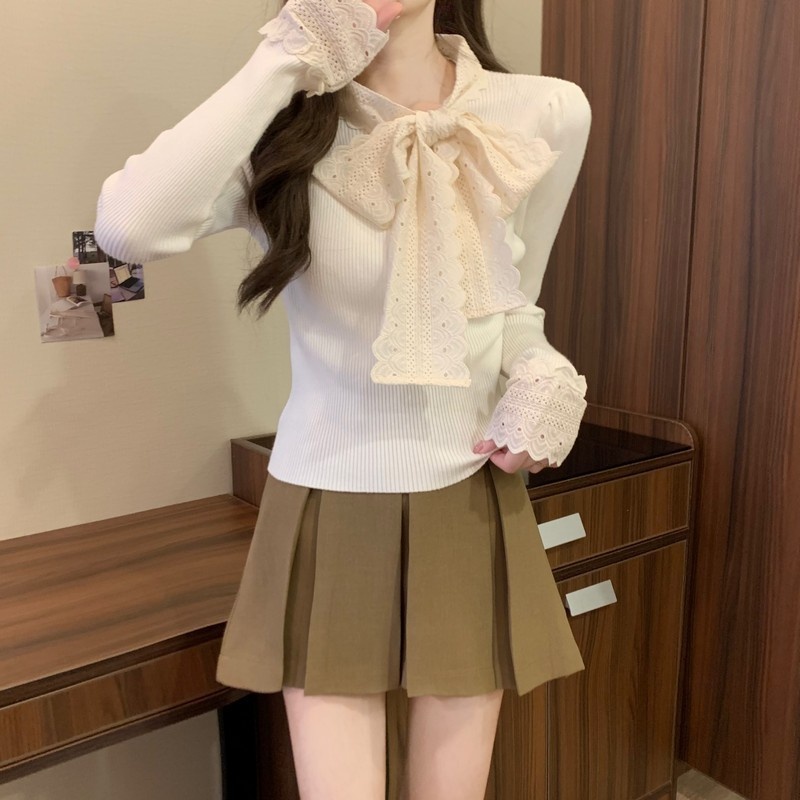 2024秋季新款法式蕾丝花边蝴蝶结气质修身显瘦甜美清新针织上衣女
