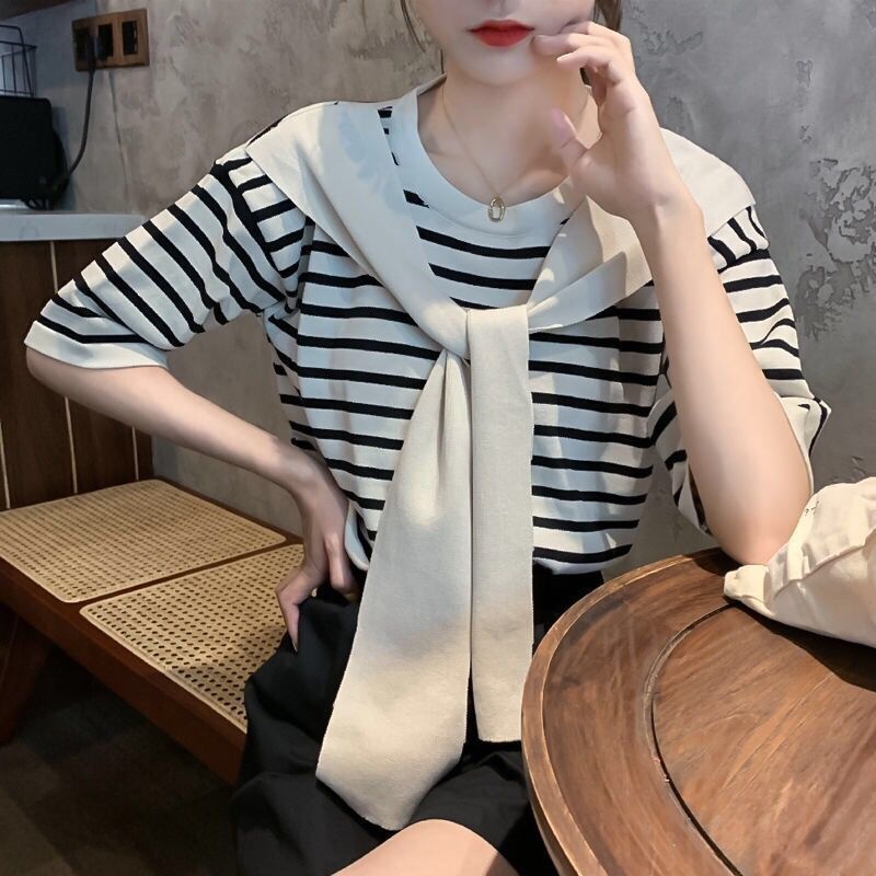 2024夏季新款韩版宽松圆领 百搭拼接假领子披肩条纹学生短袖T恤女