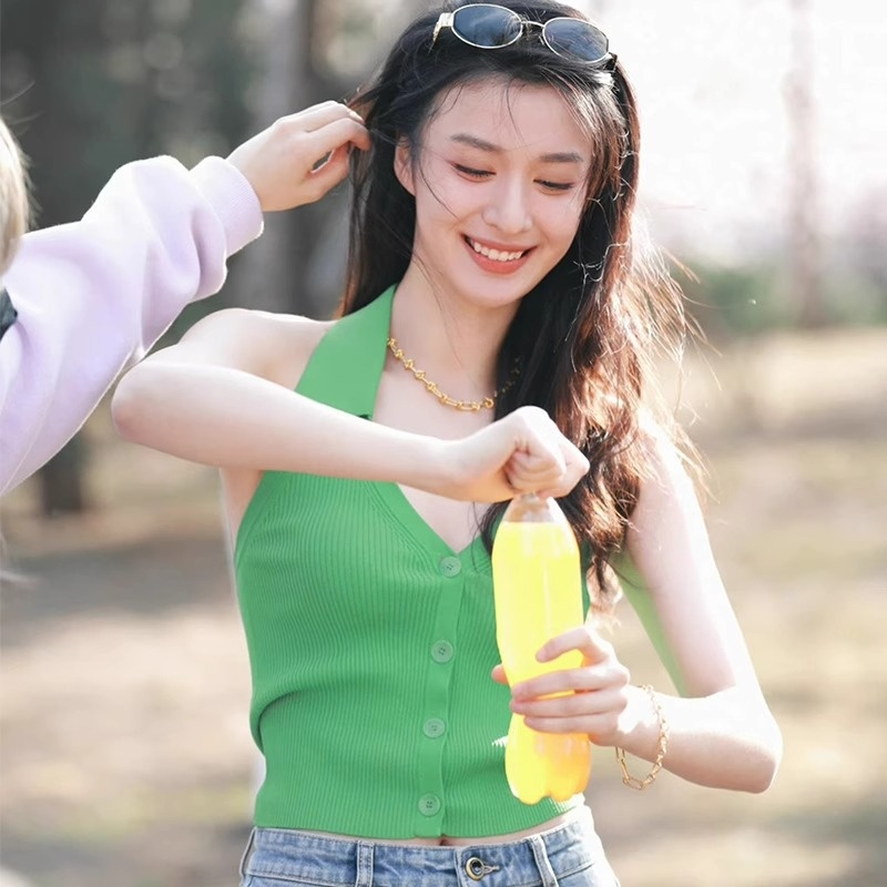 2024夏季新款绿色吊带无袖polo领挂脖式性感露背甜美针织衫背心女