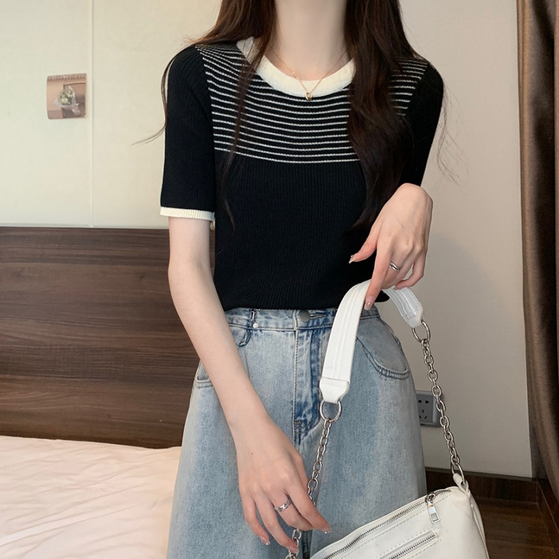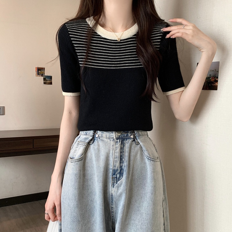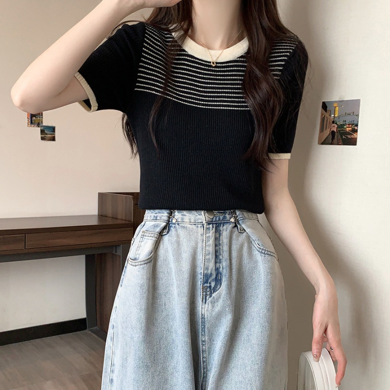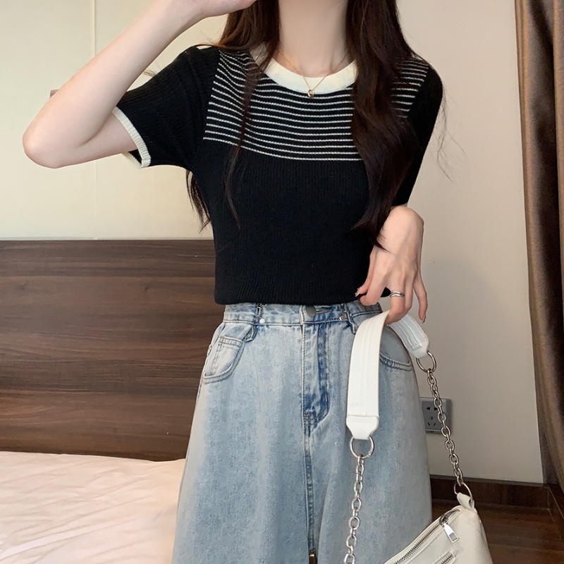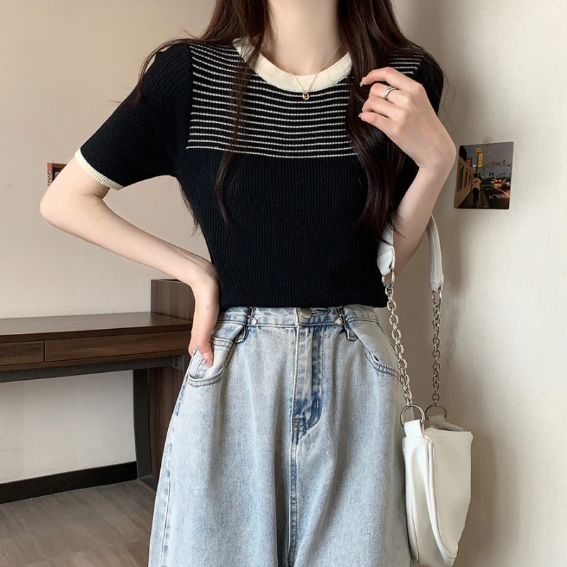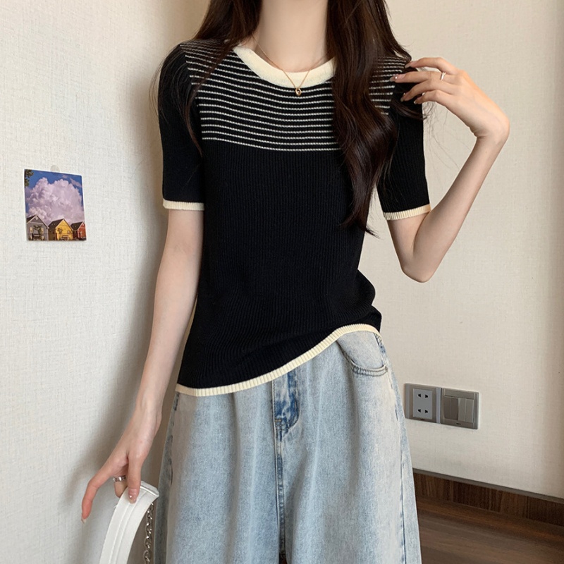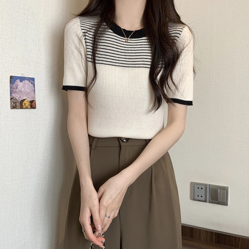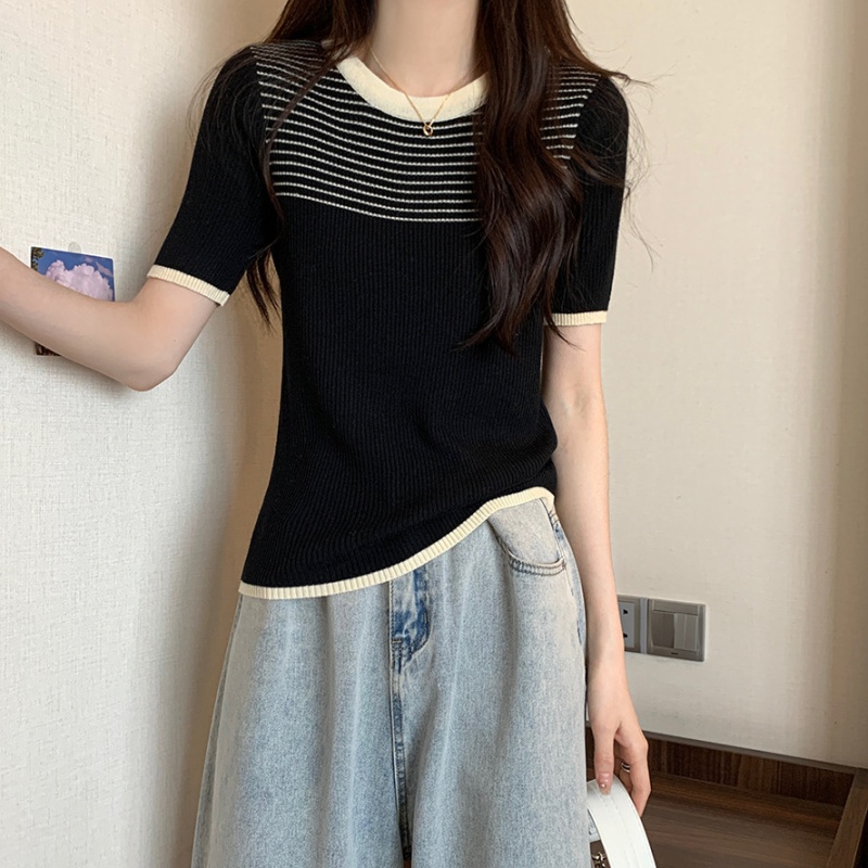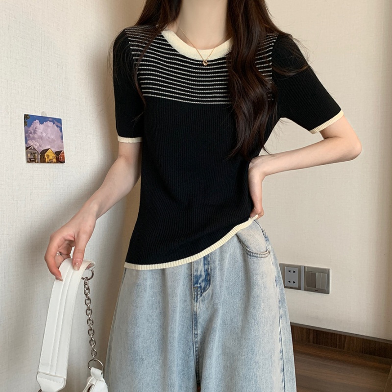 夏季新款韩风chic设计感复古撞色T恤休闲百搭短袖弹力收腰上衣女