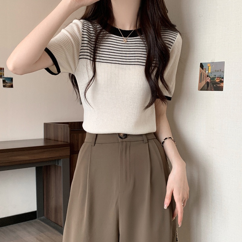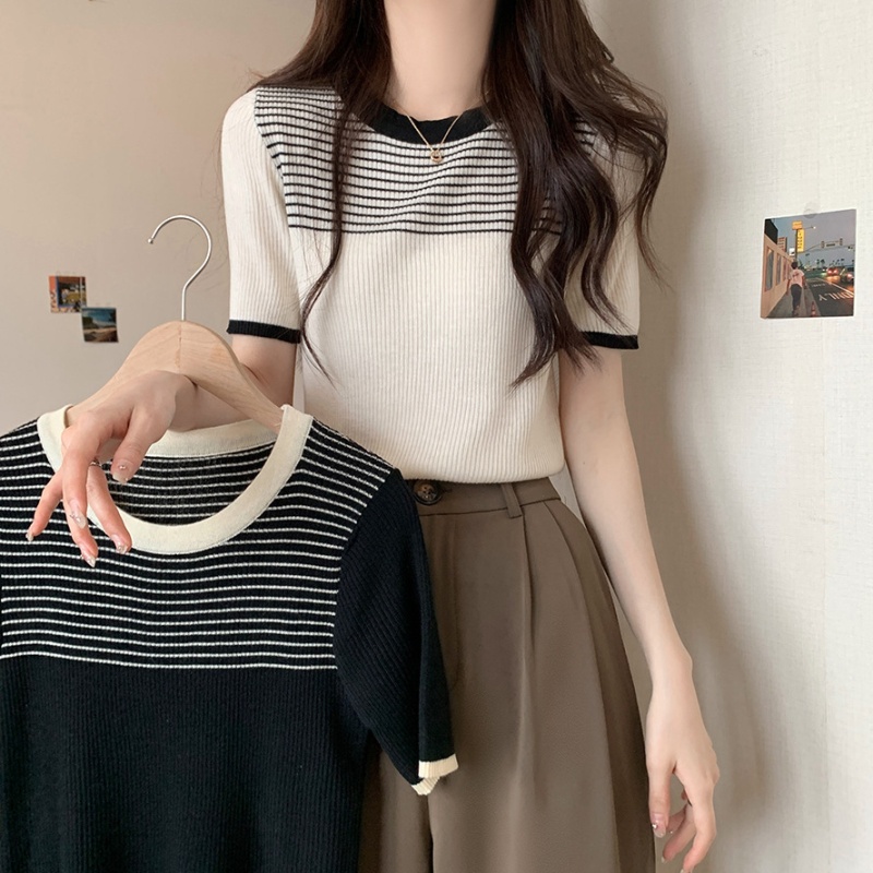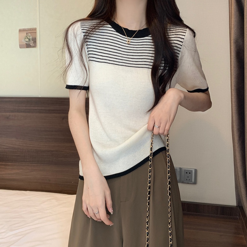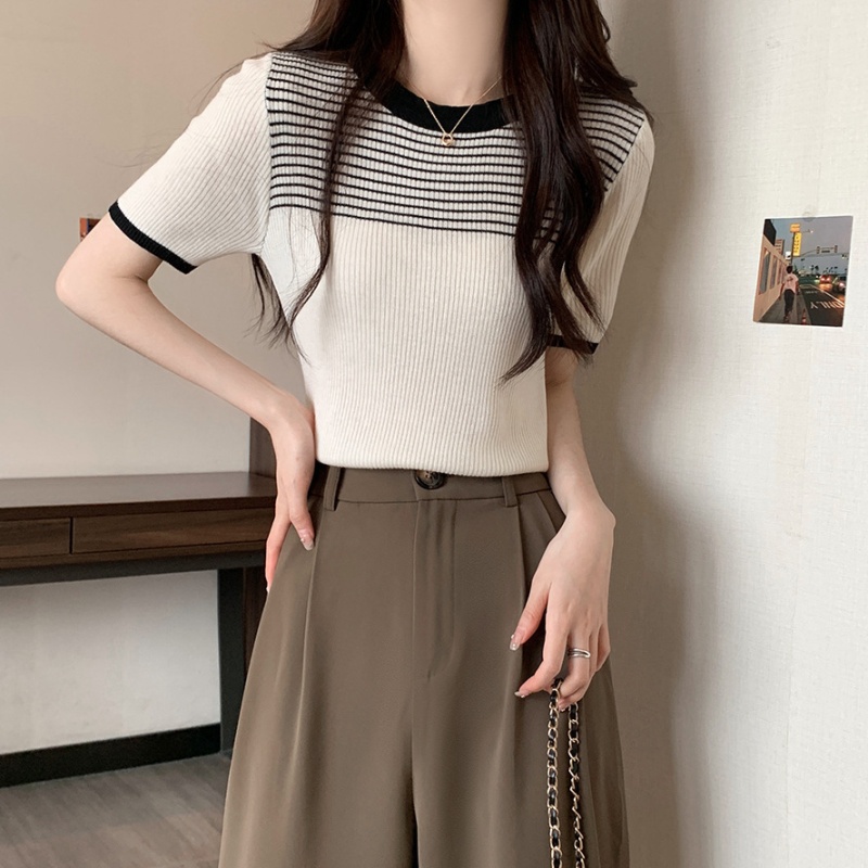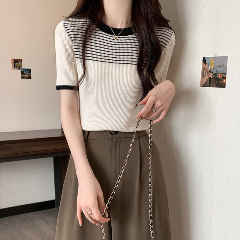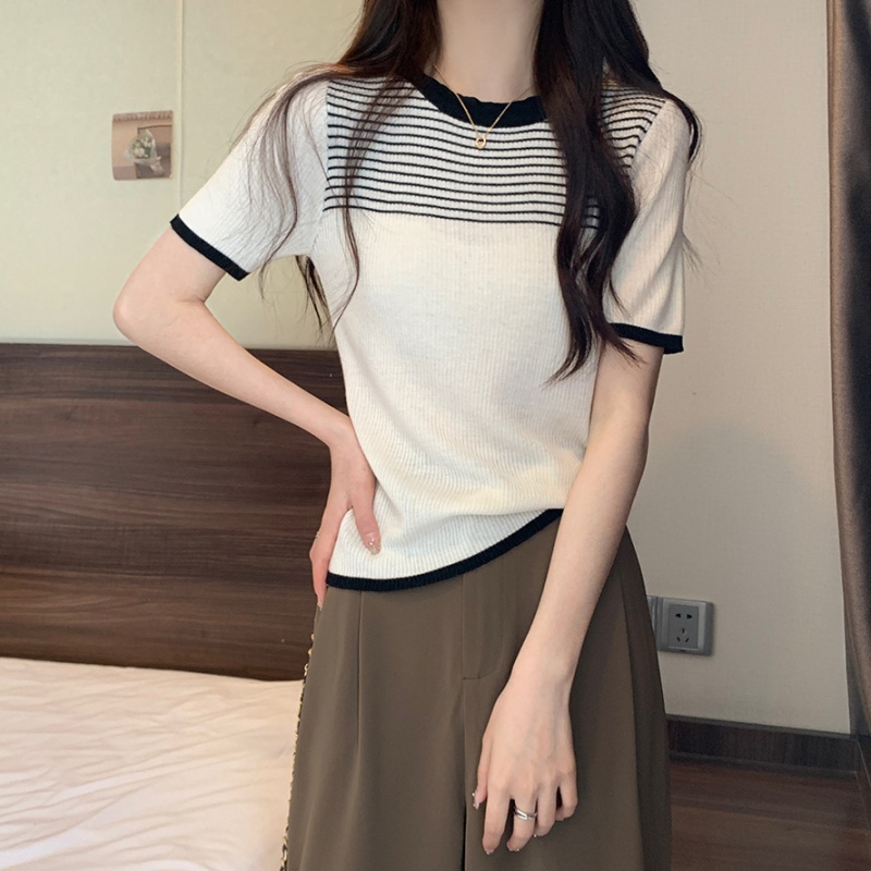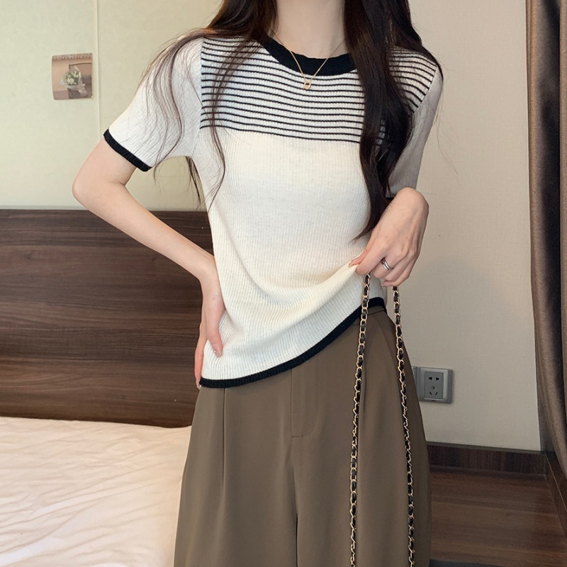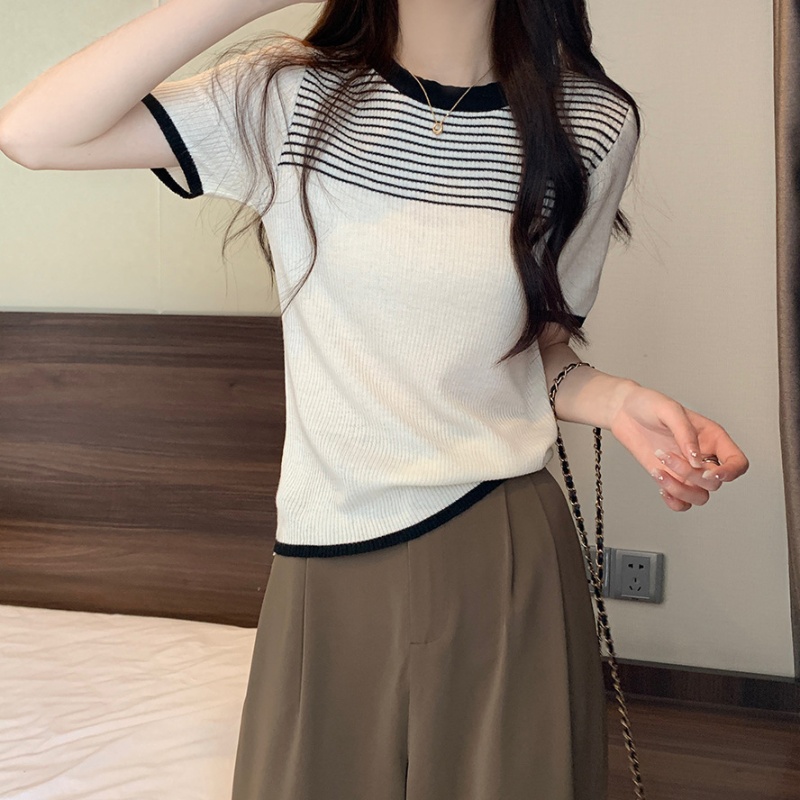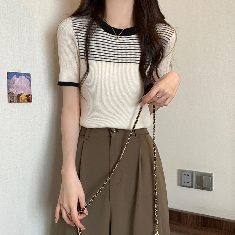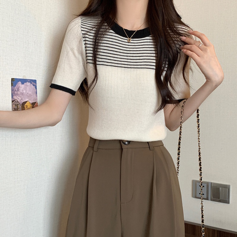 夏季新款韩风chic设计感复古撞色T恤休闲百搭短袖弹力收腰上衣女