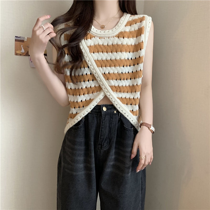 2022夏装复古开叉设计感前后两穿套头外穿宽松无袖条纹针织衫背心