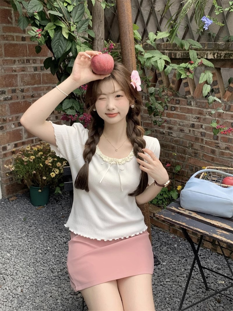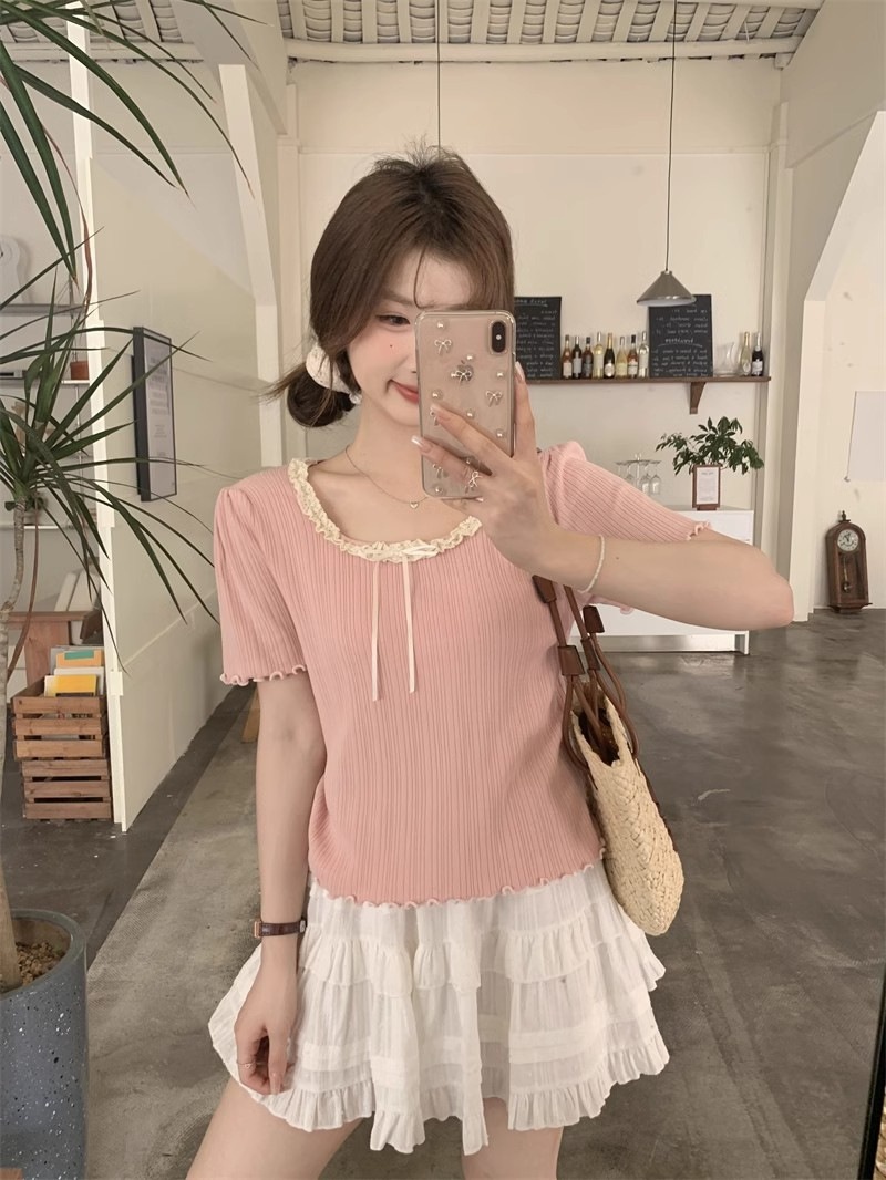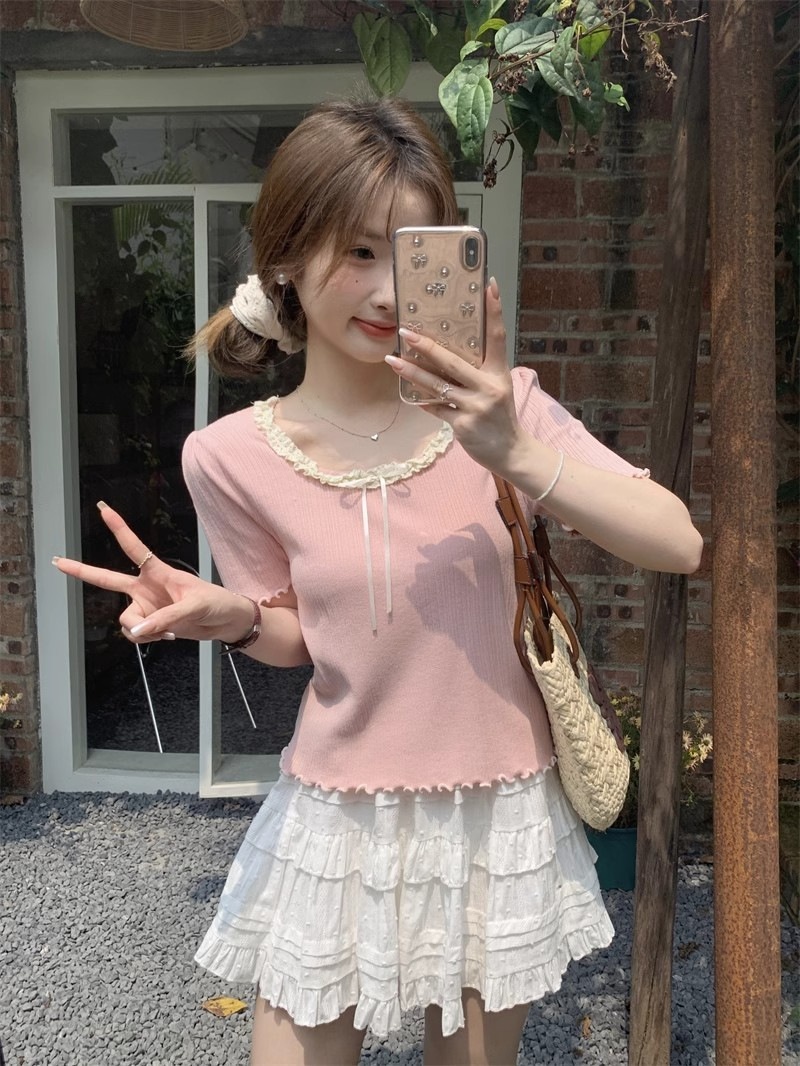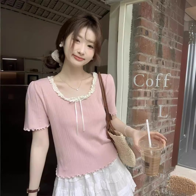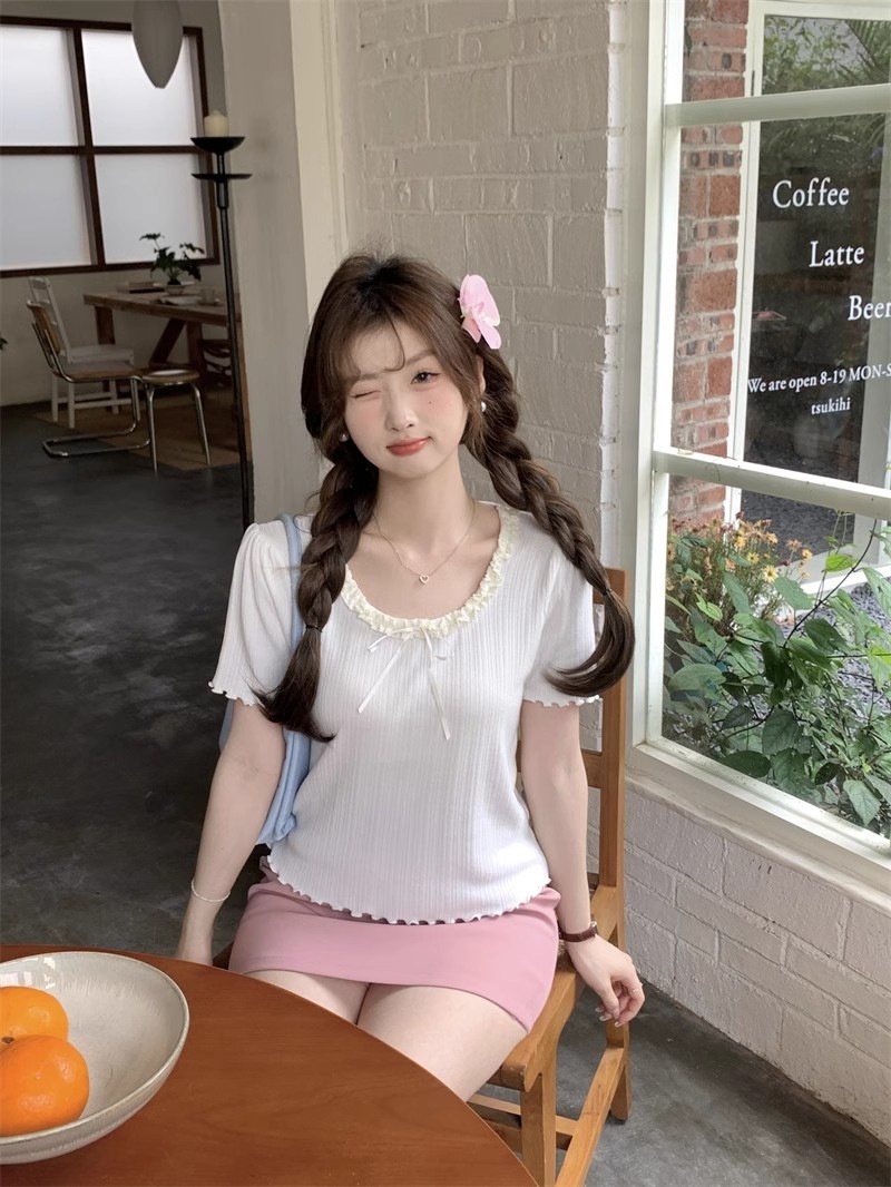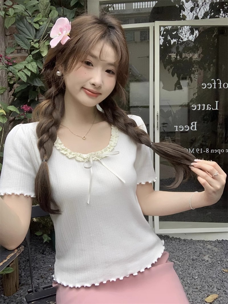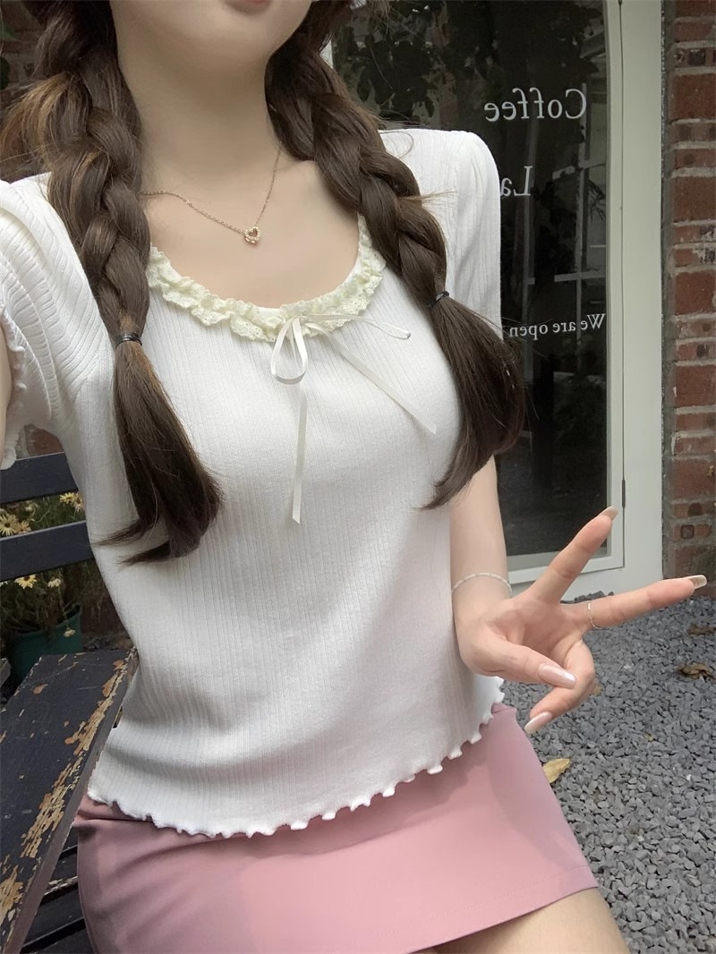 2024夏季新款小个子短款木耳边圆领正肩短袖t恤修身显瘦上衣女