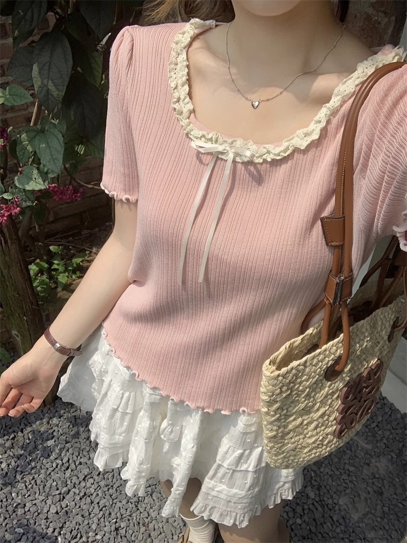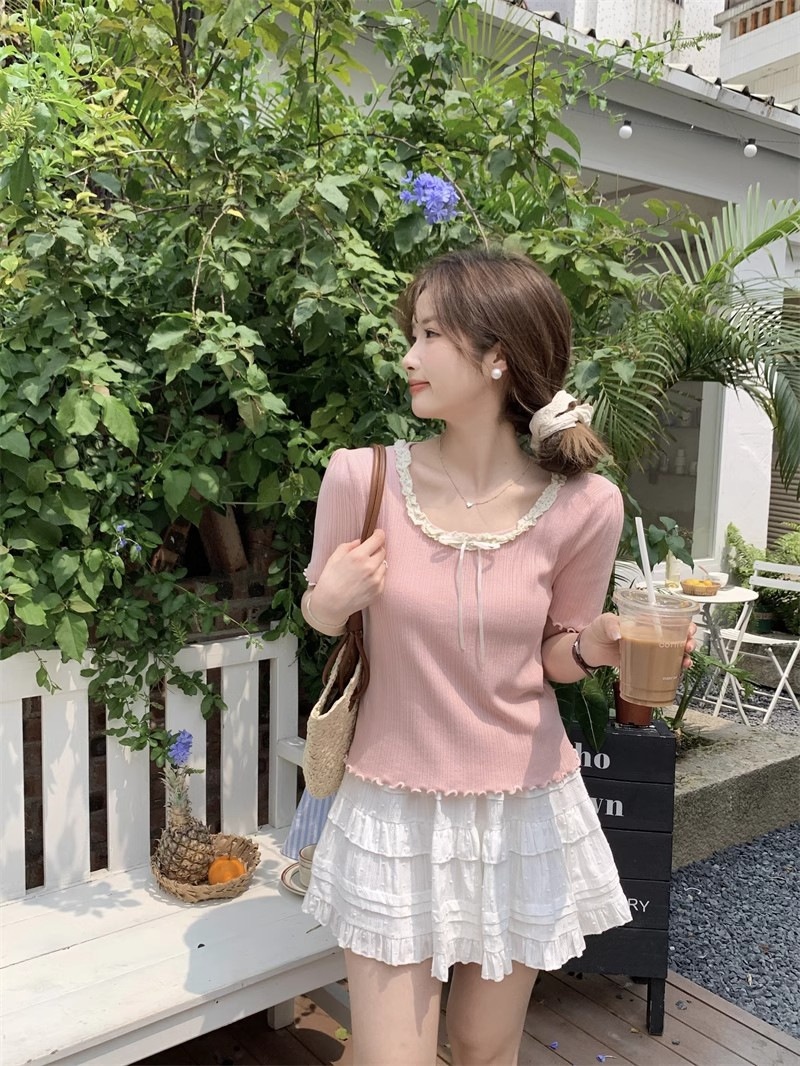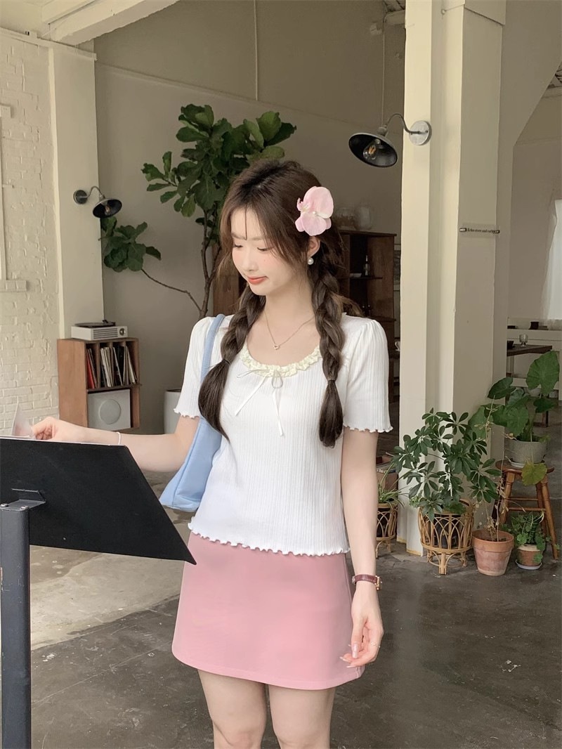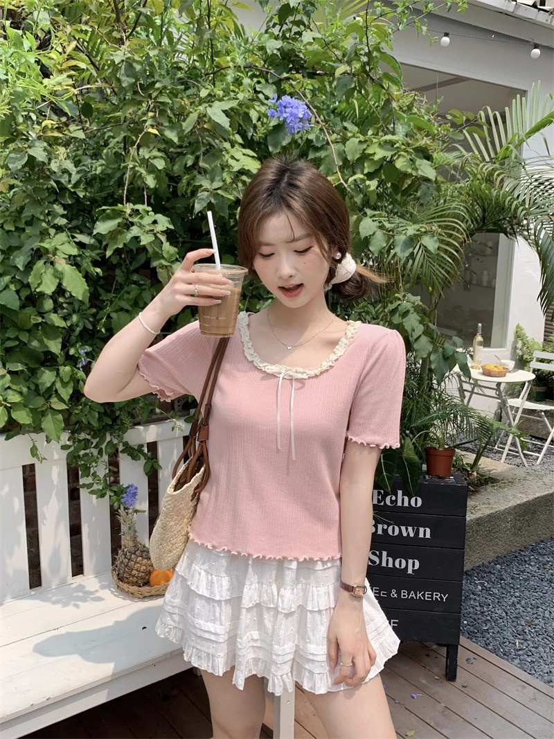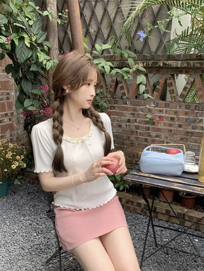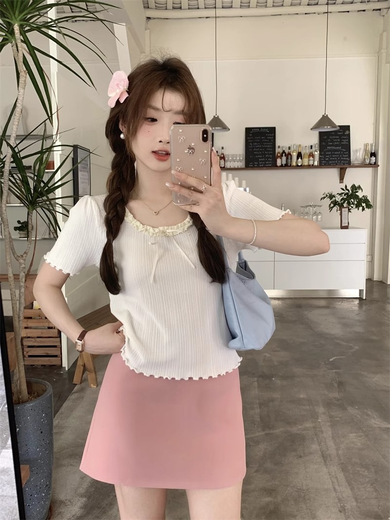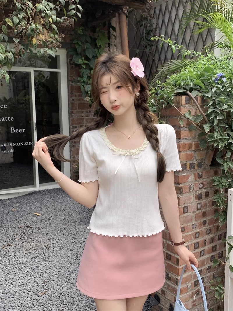 2024夏季新款小个子短款木耳边圆领正肩短袖t恤修身显瘦上衣女