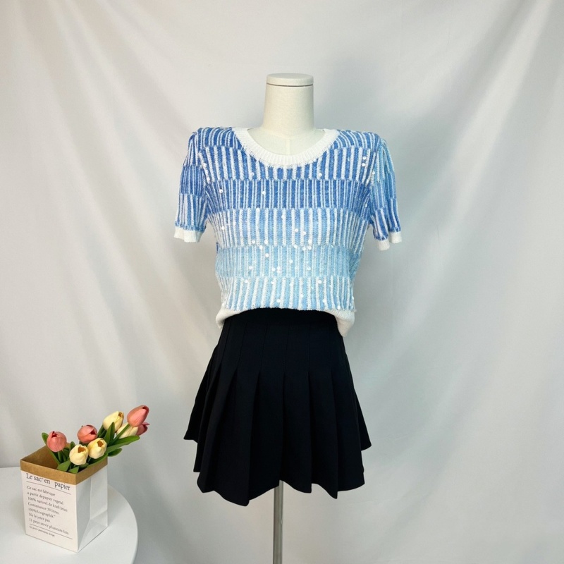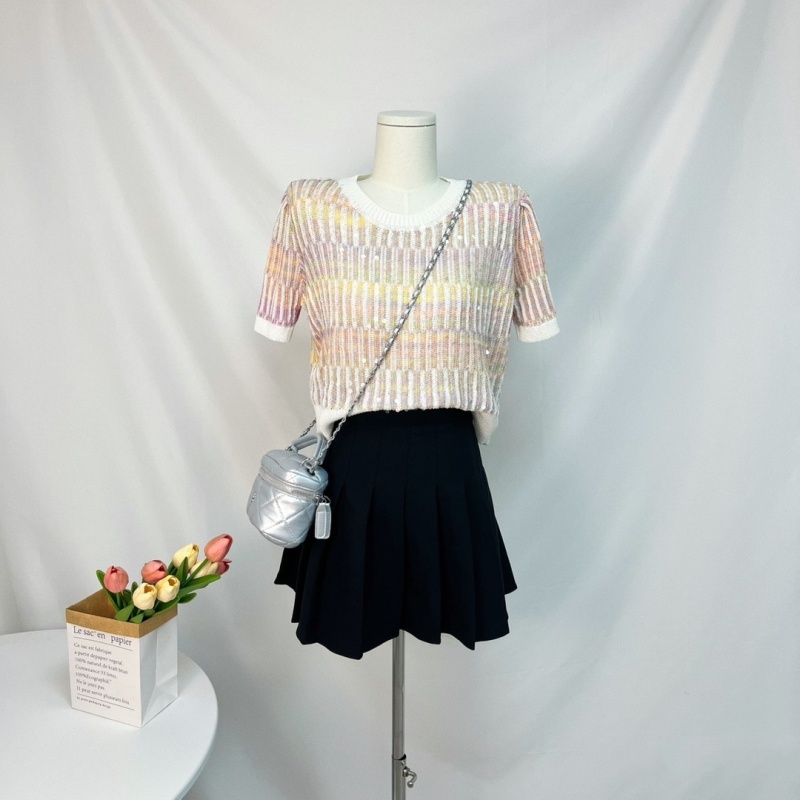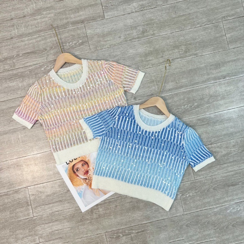 2024夏季新款小香风清新甜美百搭圆领彩色竖条亮片短袖短款上衣女