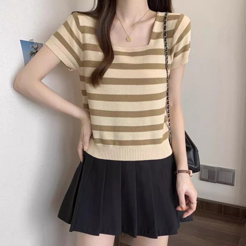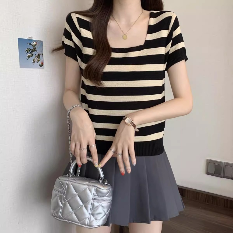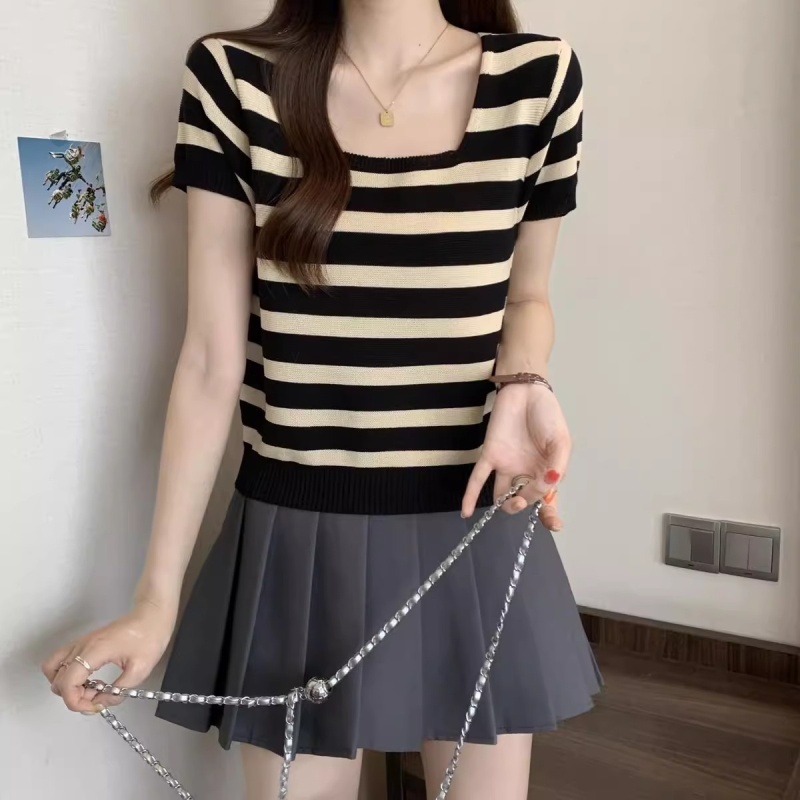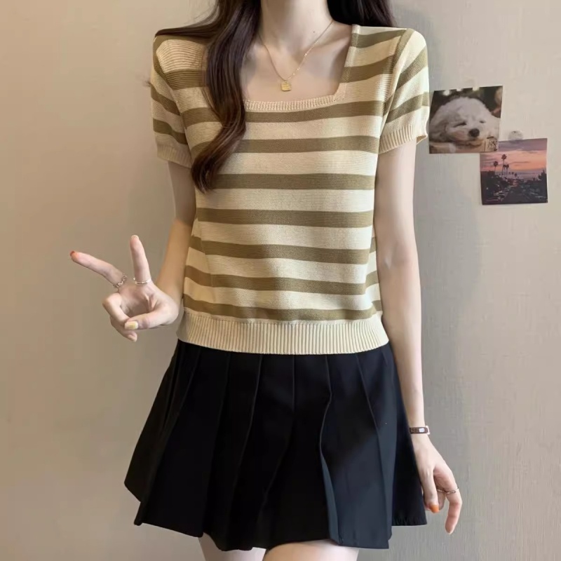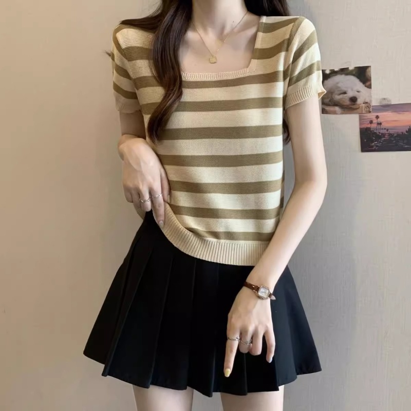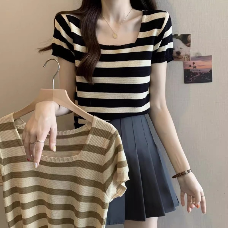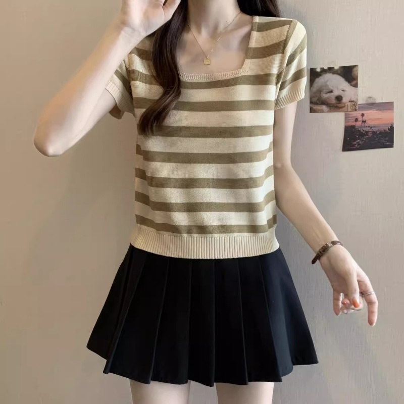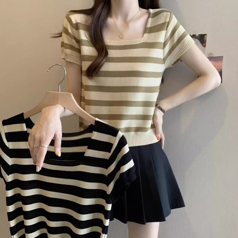 短袖冰丝针织T恤女2024夏季新款条纹打底衫显瘦短款方领上衣