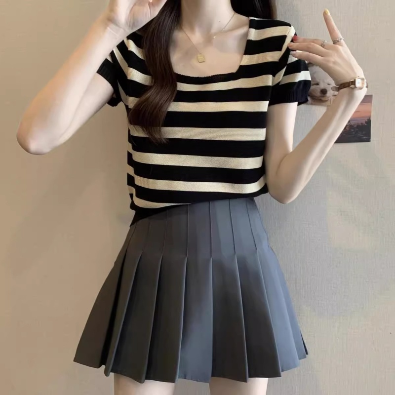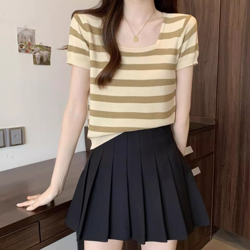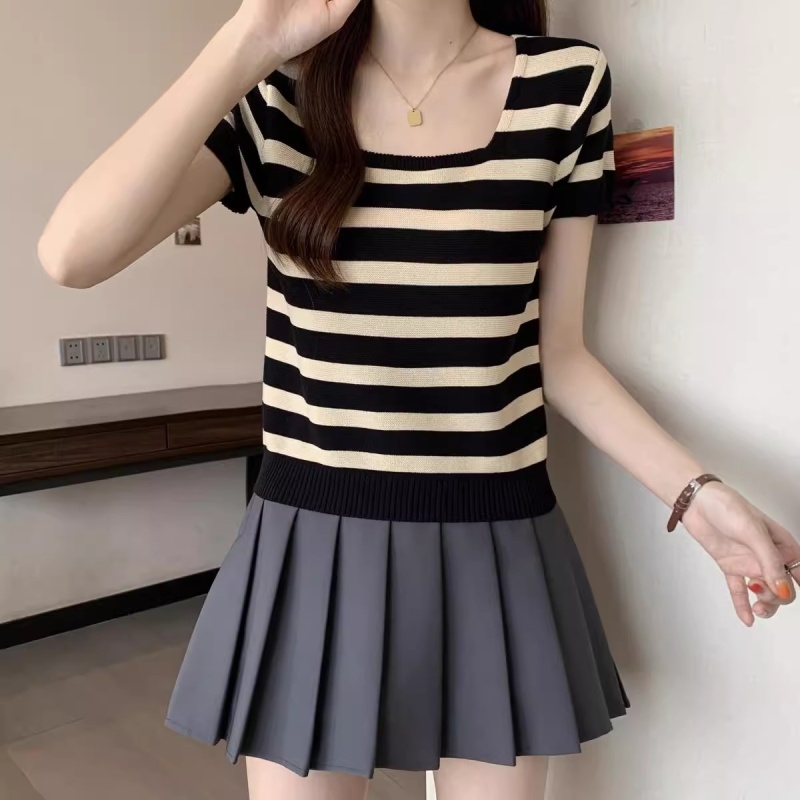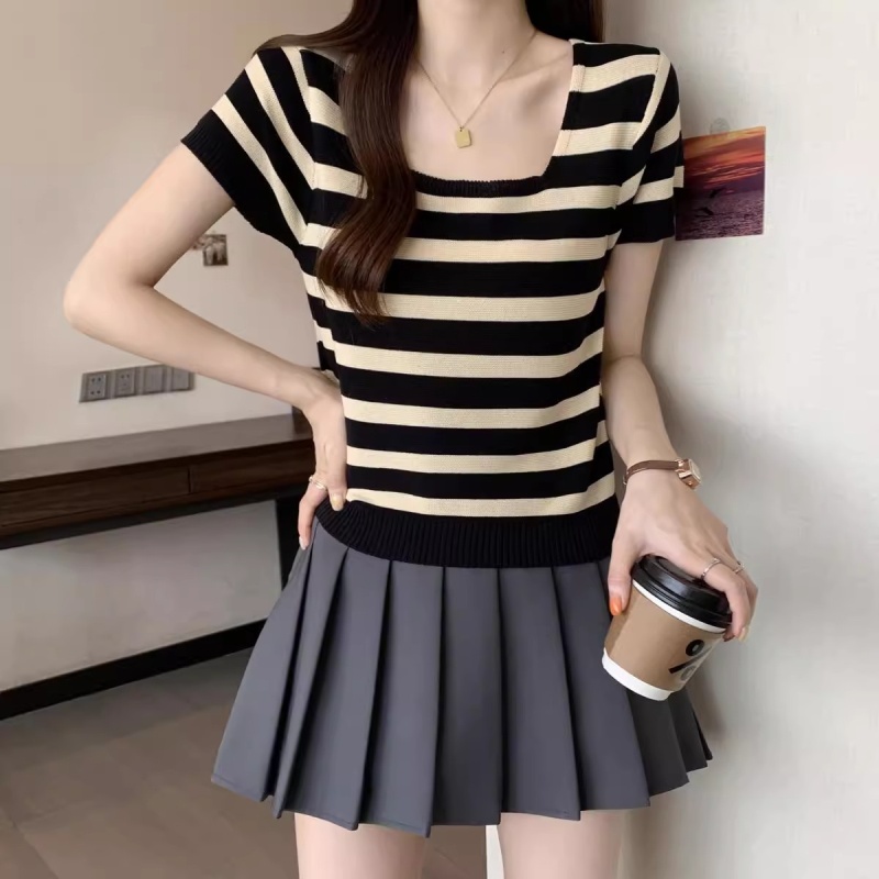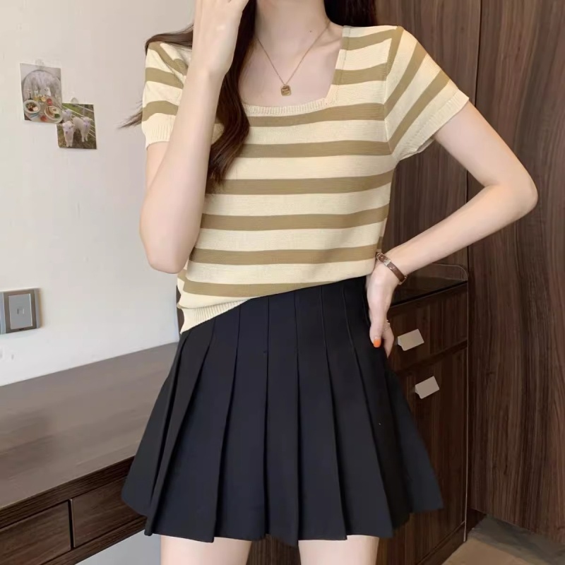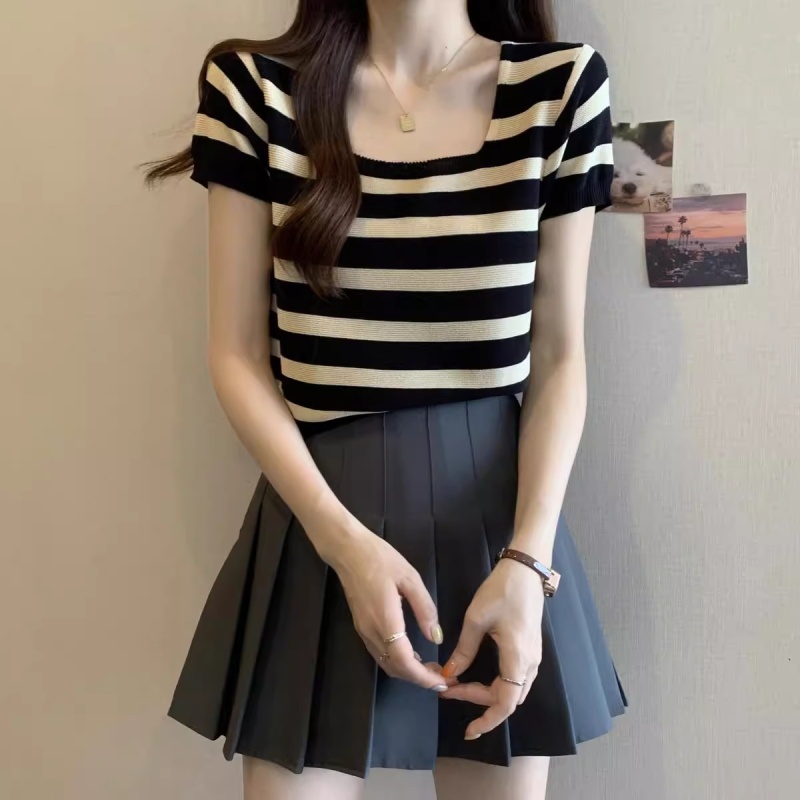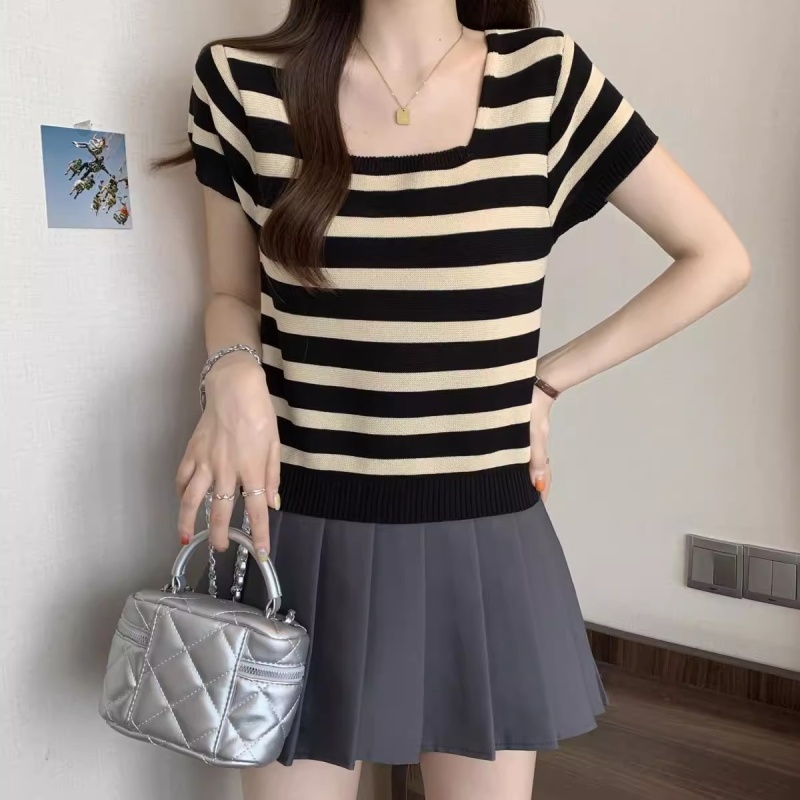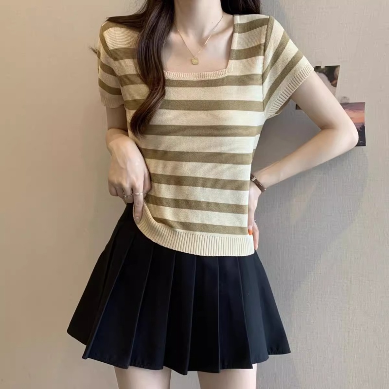 短袖冰丝针织T恤女2024夏季新款条纹打底衫显瘦短款方领上衣