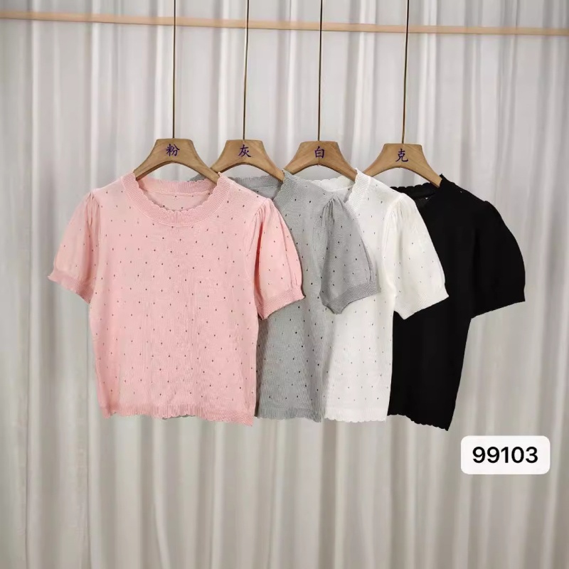 2024夏季新款韩系百搭小众镂空针织温柔气质圆领泡泡短袖上衣女潮