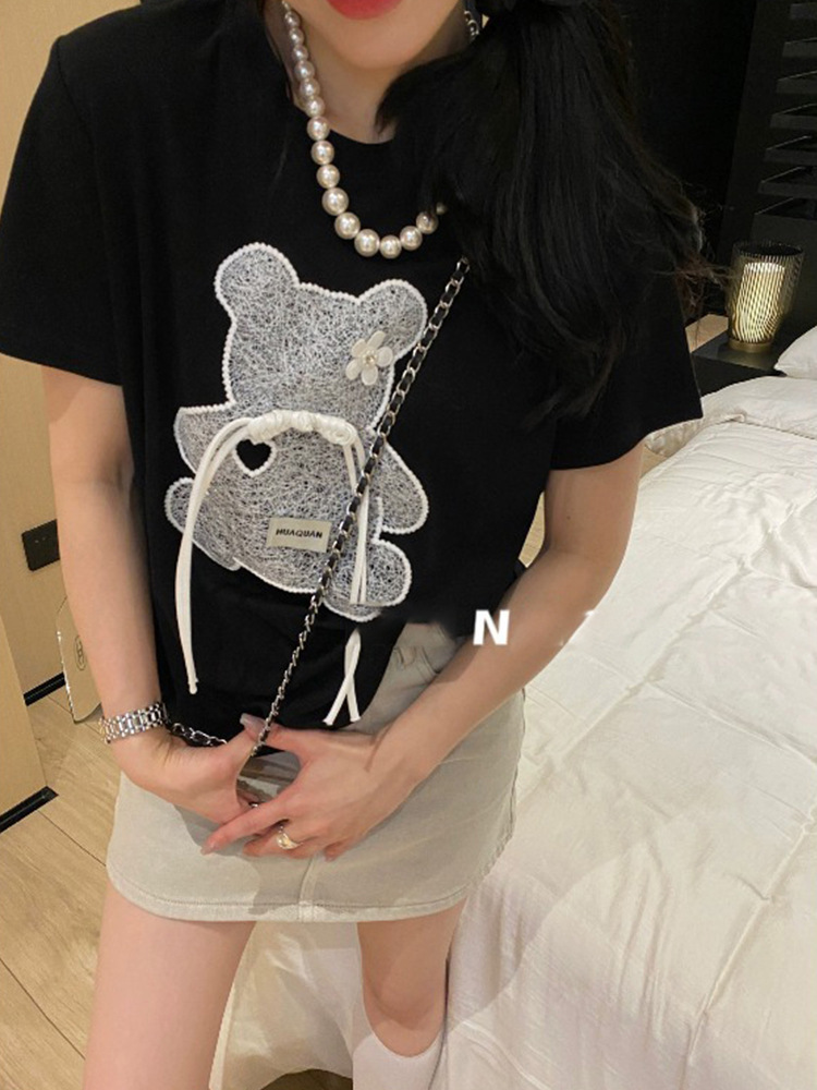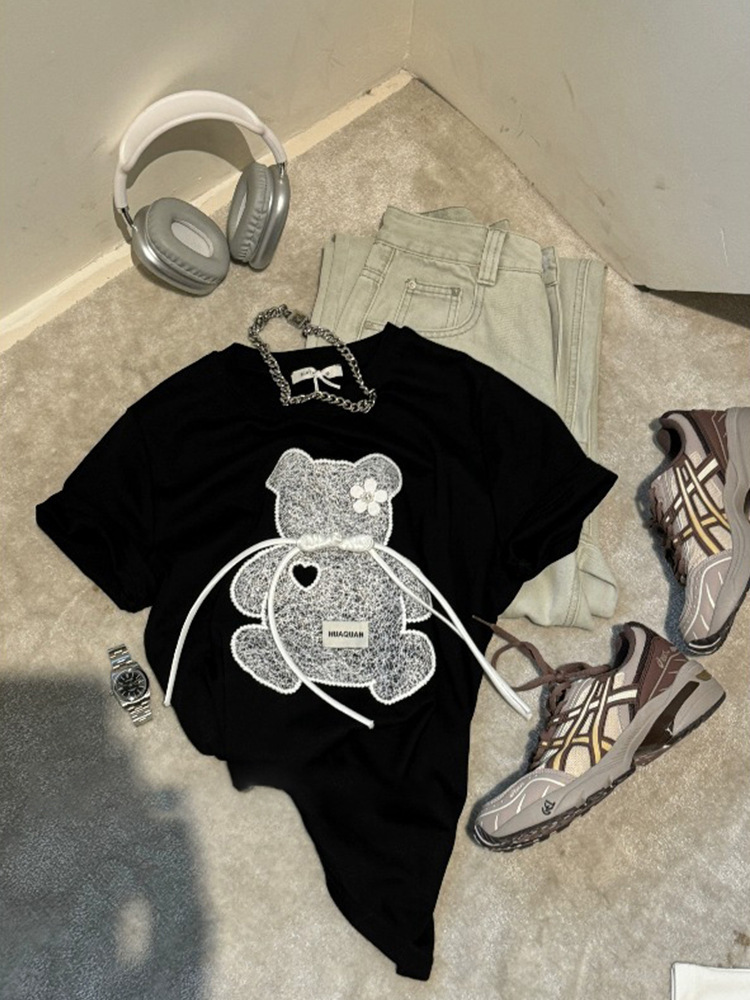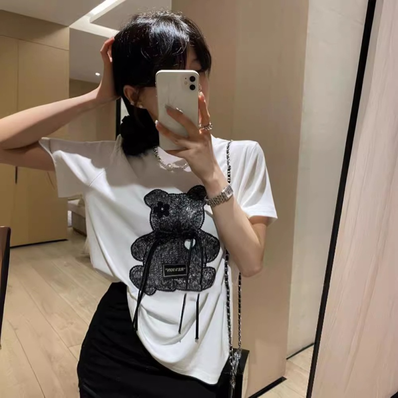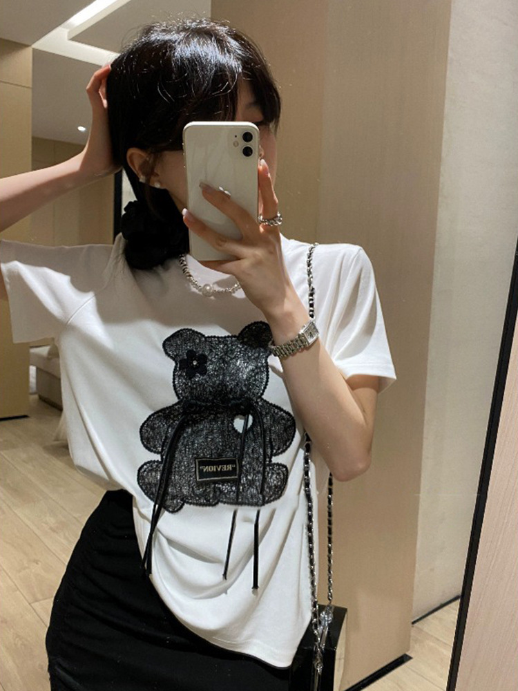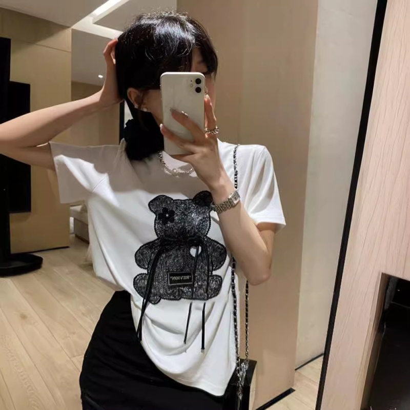 2024年春夏季设计感时尚短袖t恤小熊蕾丝圆领休闲时尚百搭上衣女