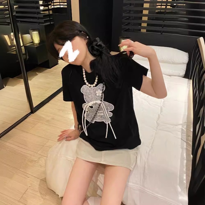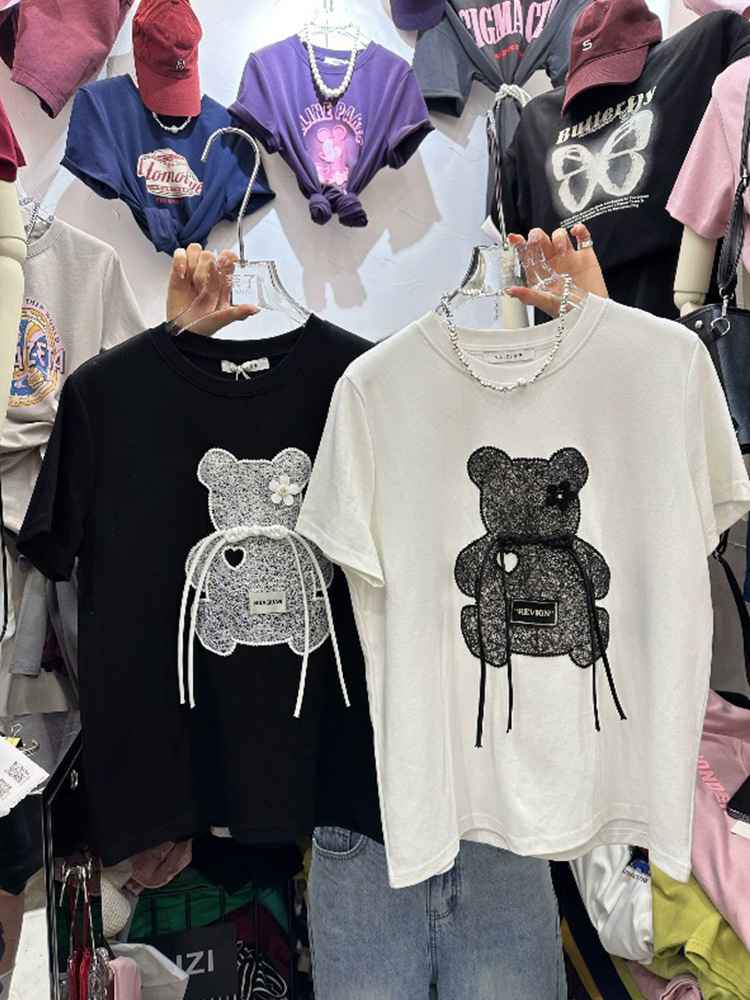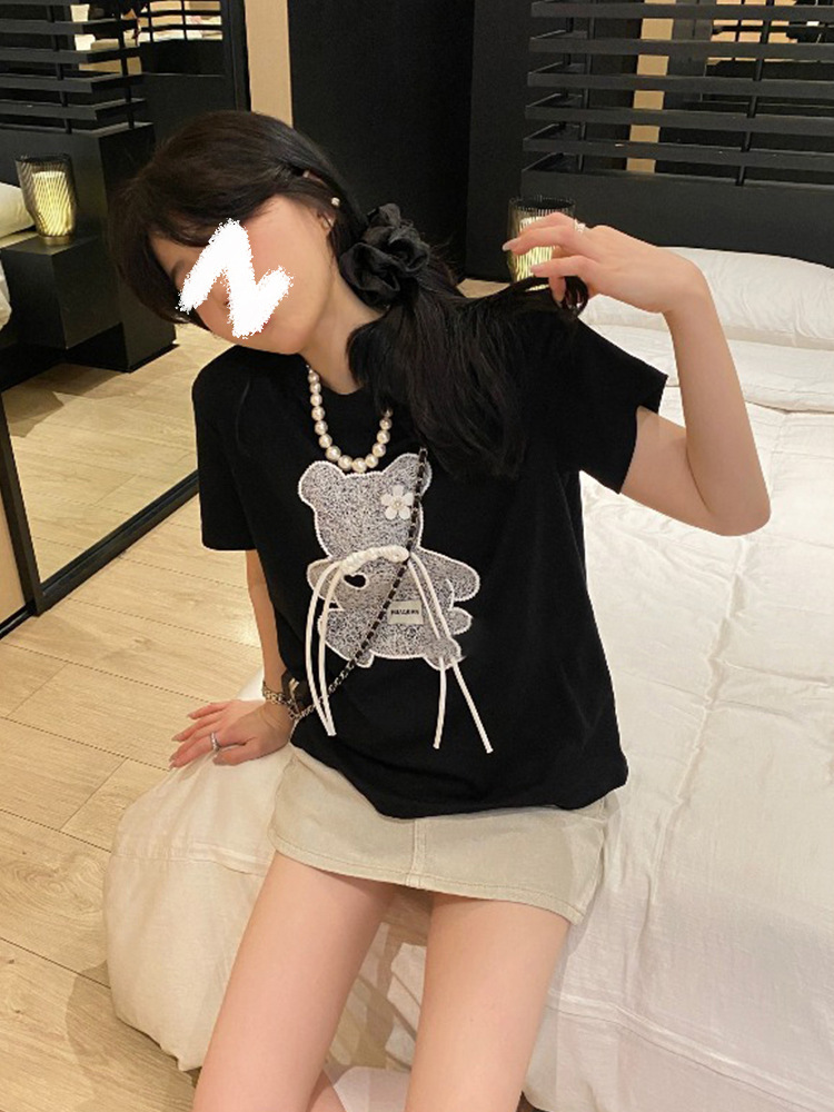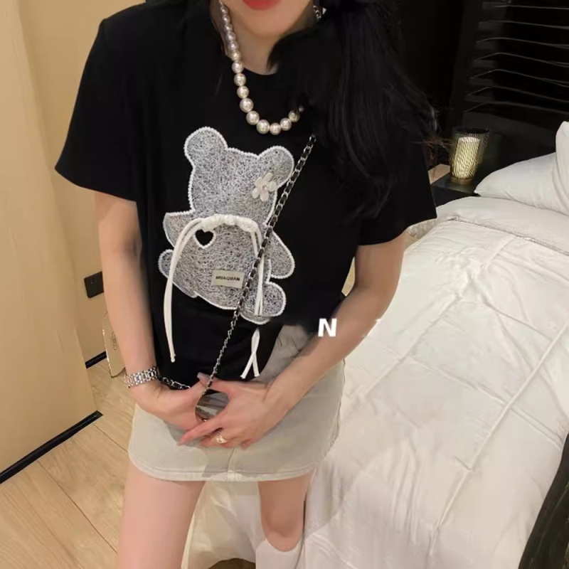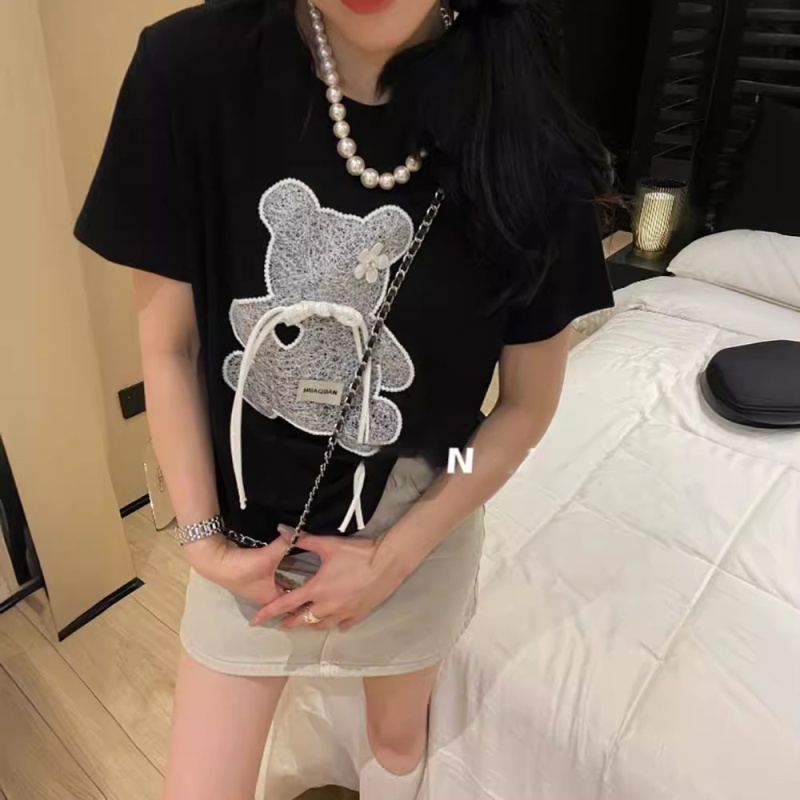 2024年春夏季设计感时尚短袖t恤小熊蕾丝圆领休闲时尚百搭上衣女
