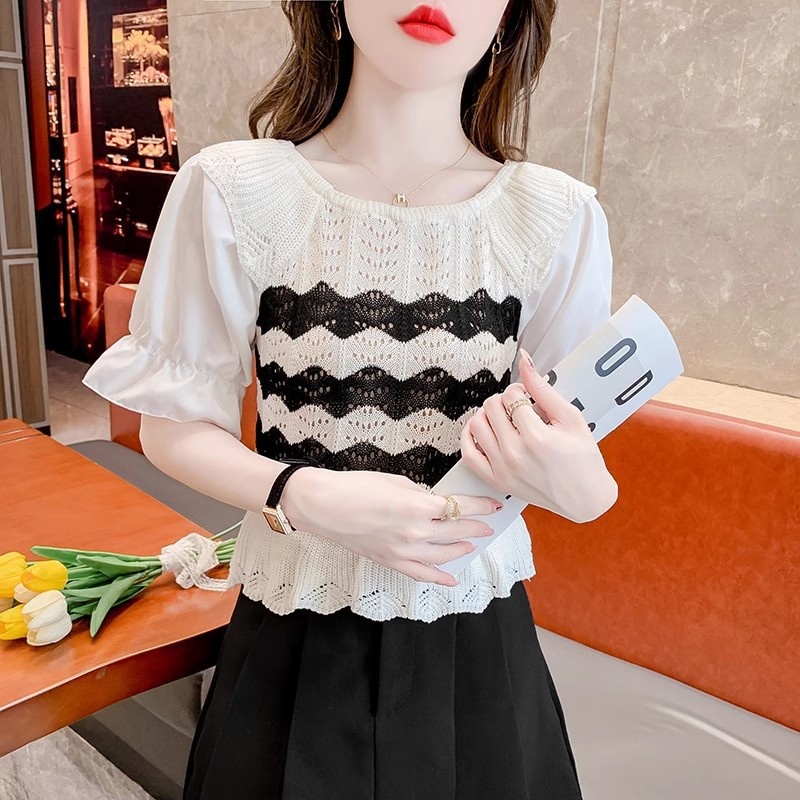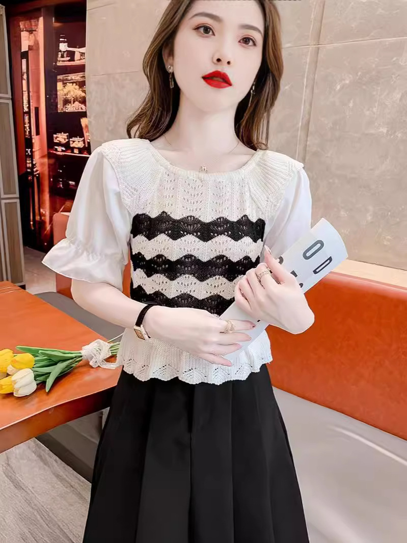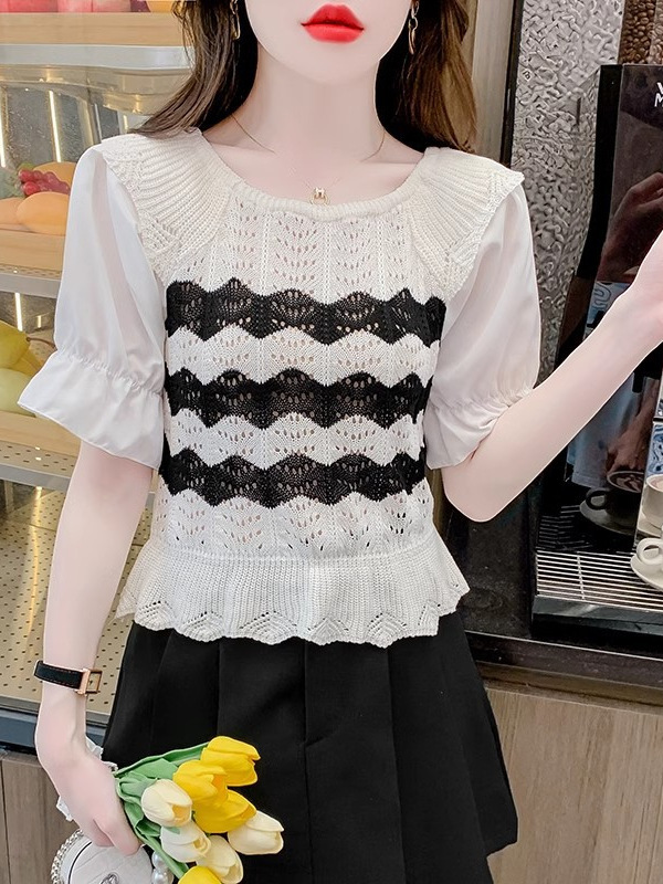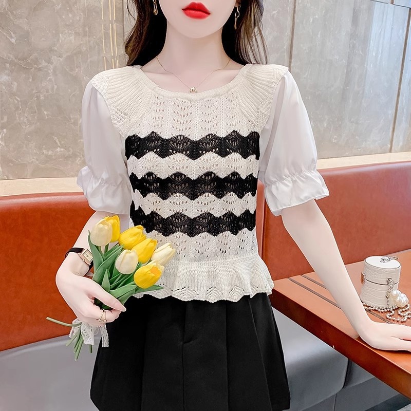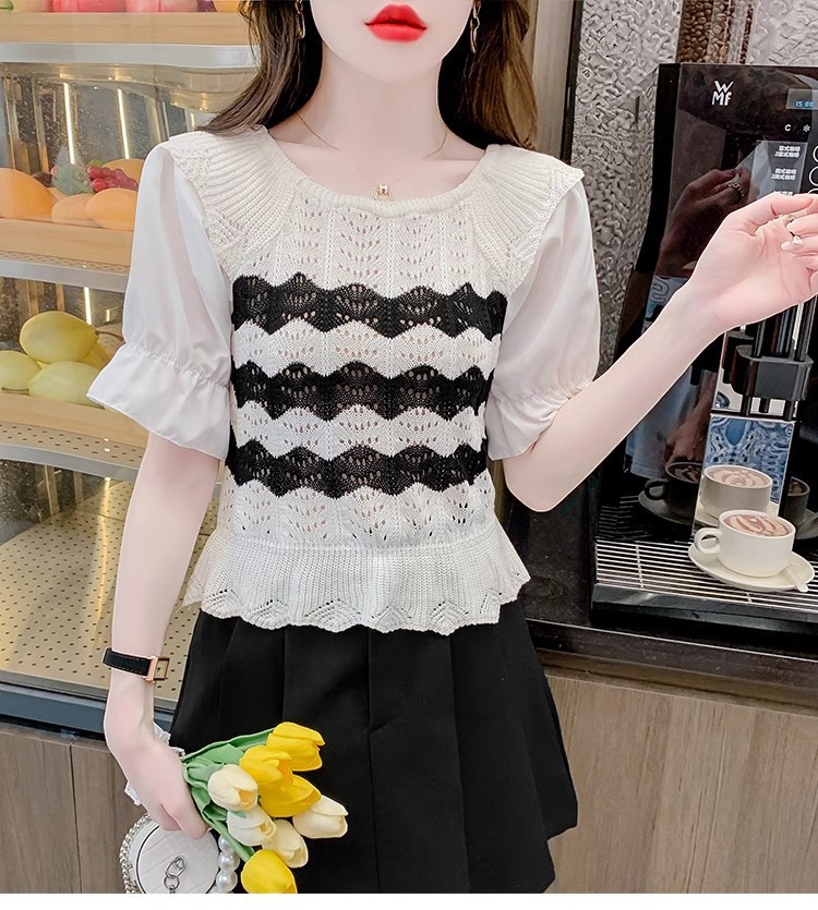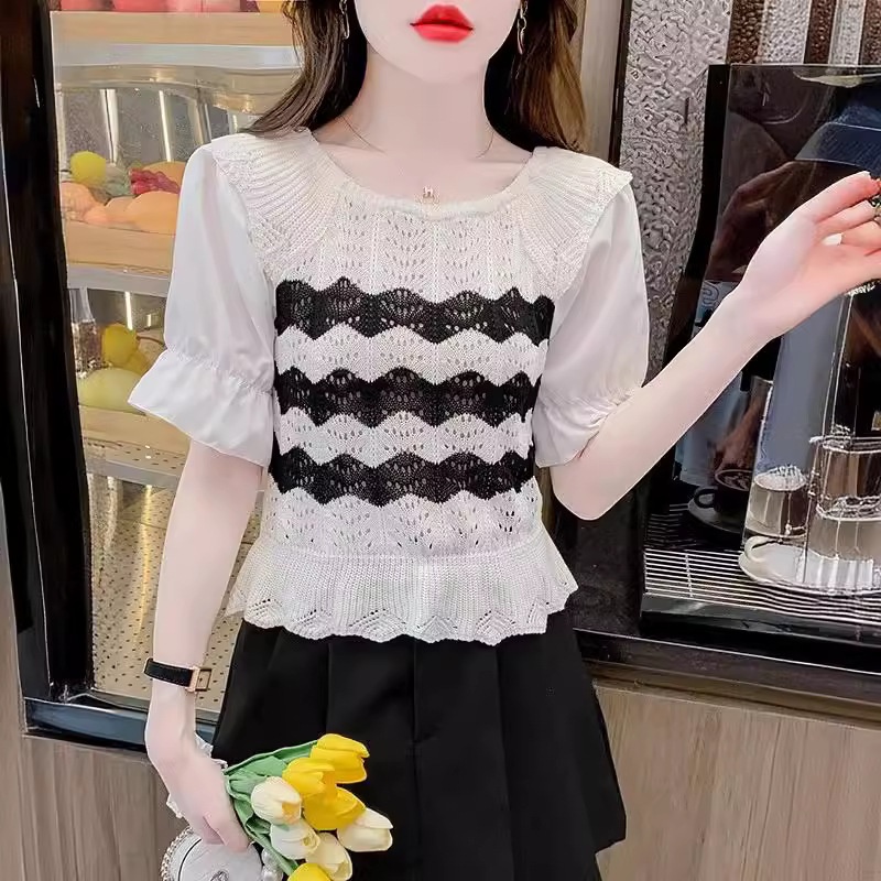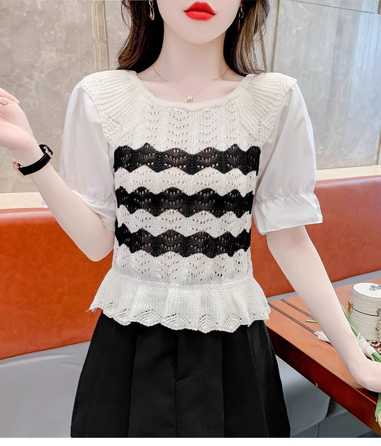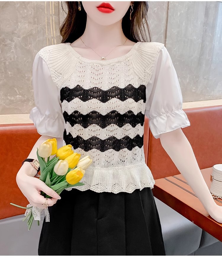 2024年夏季新款短袖女泡泡袖冰丝针织t恤设计感小众镂空短款上衣
