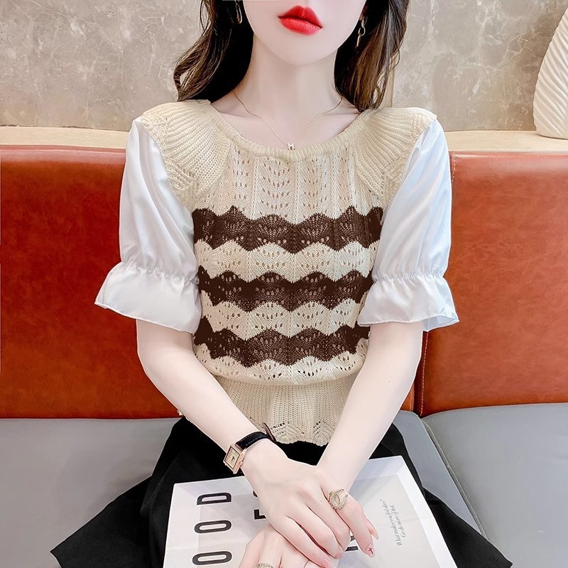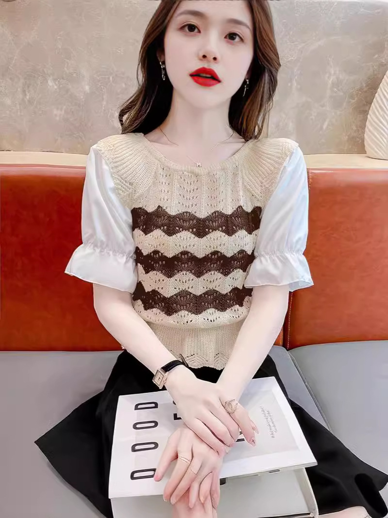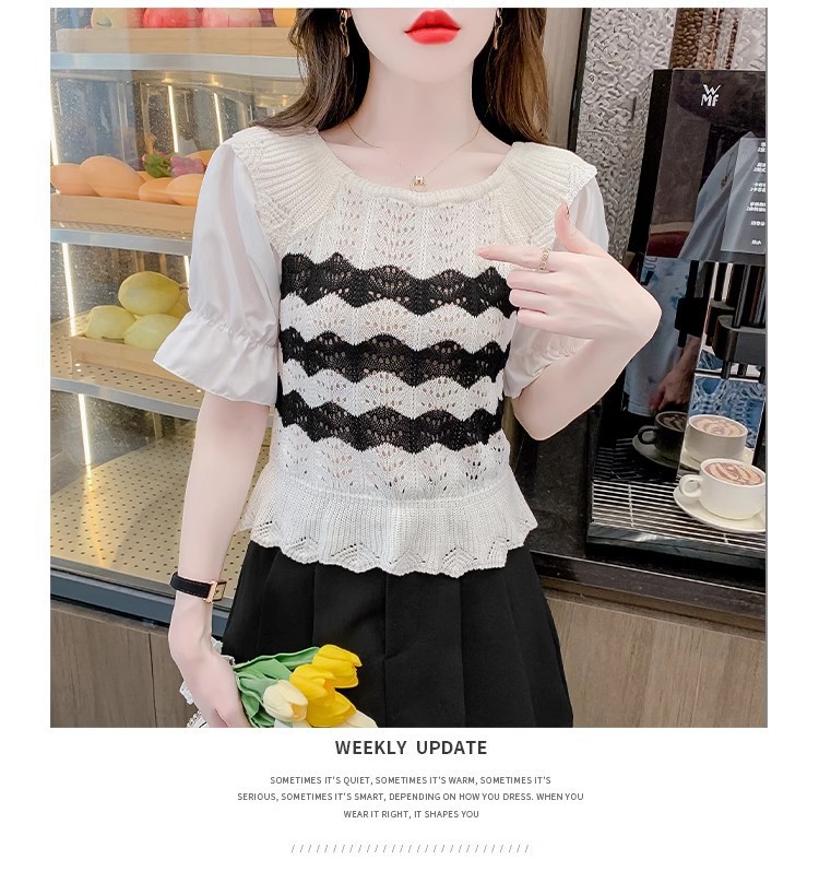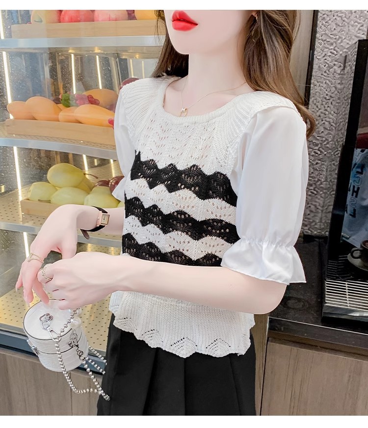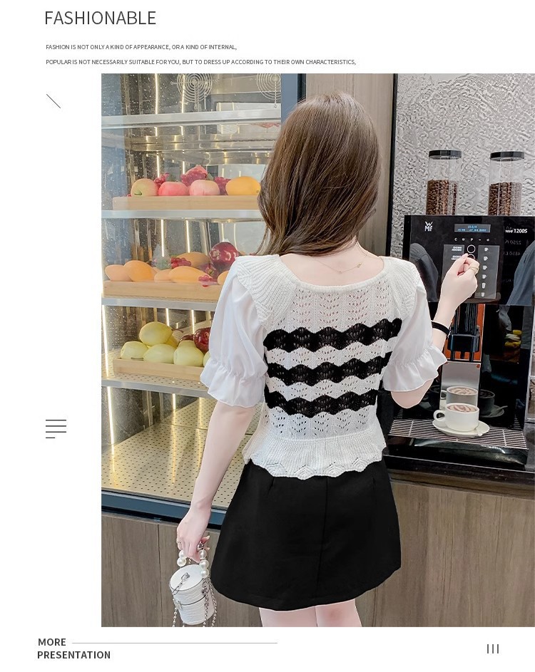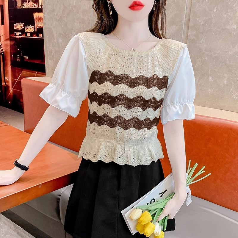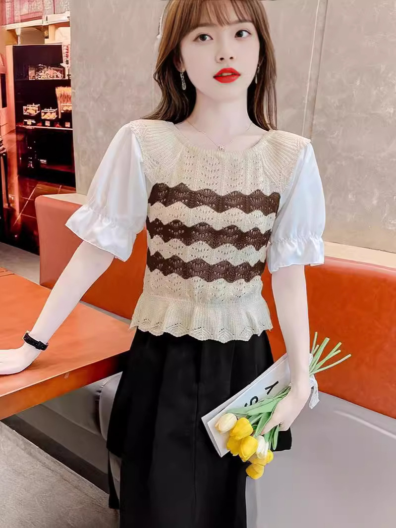 2024年夏季新款短袖女泡泡袖冰丝针织t恤设计感小众镂空短款上衣