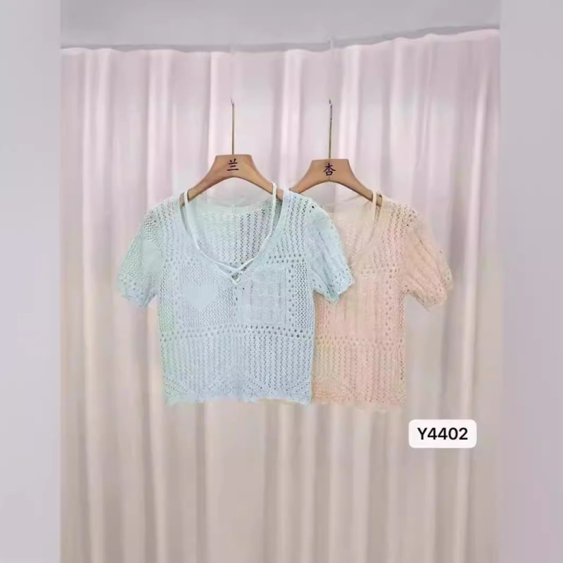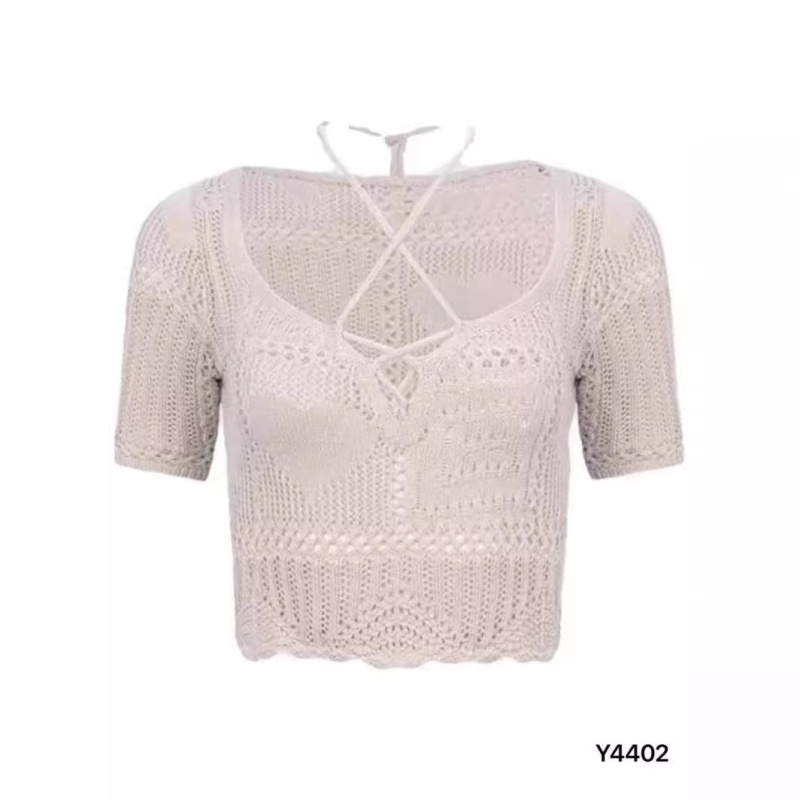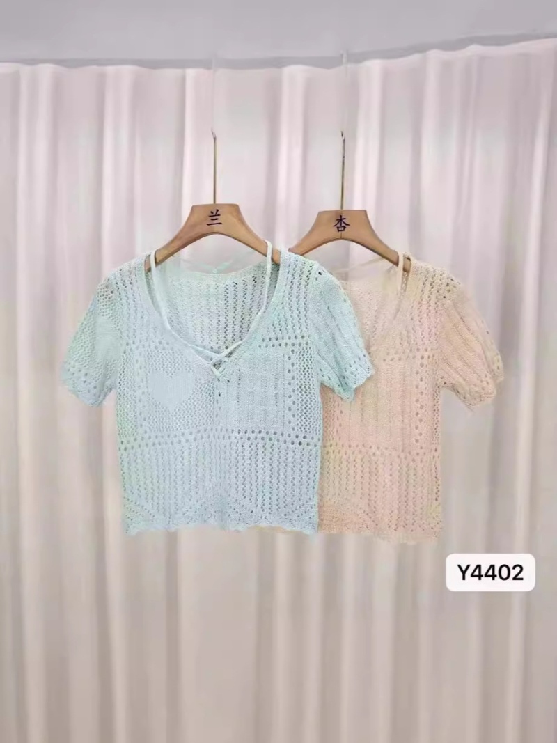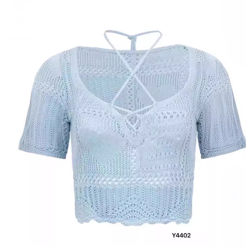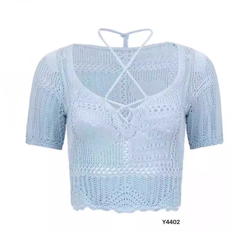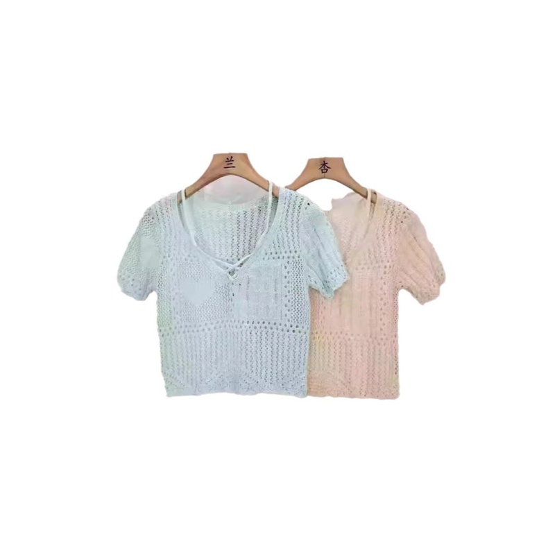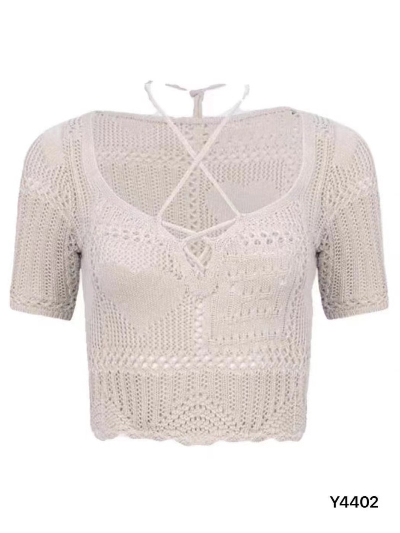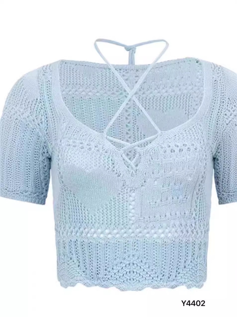 2024新款夏季小性感V领系带别致镂空针织短袖上衣女小性感V领系带
