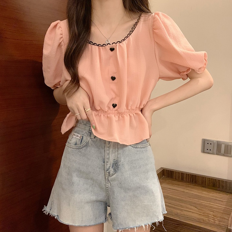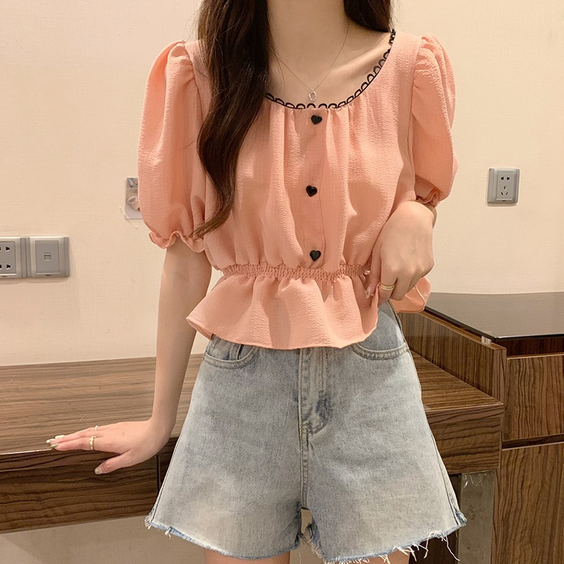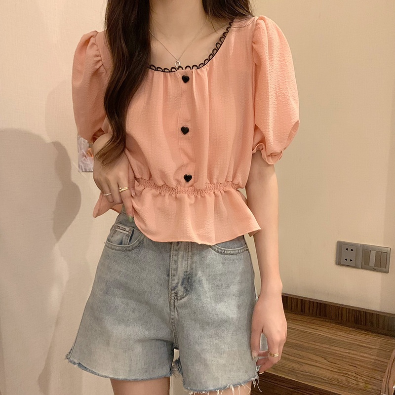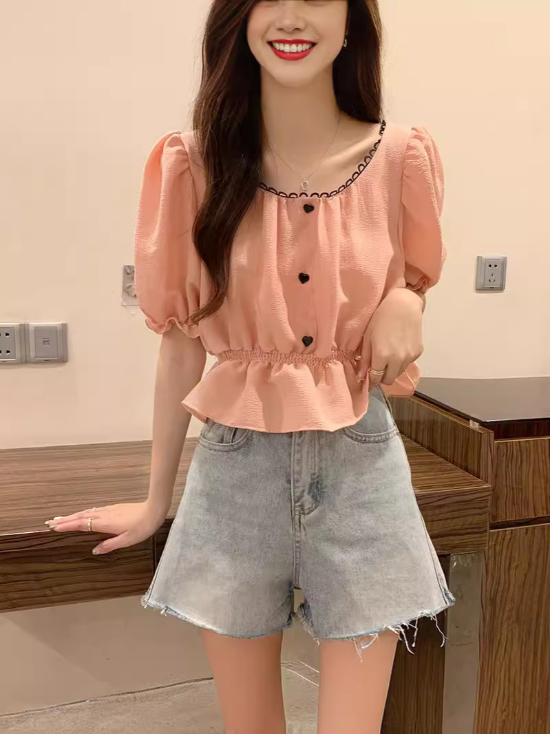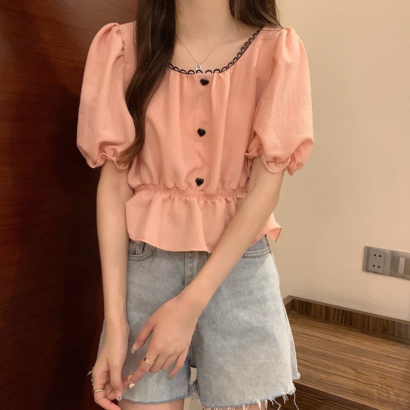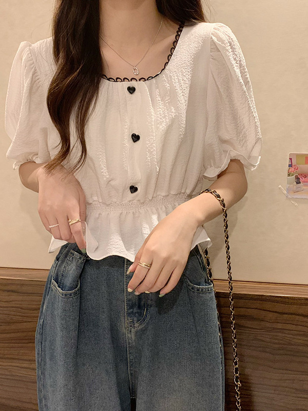 2024新款甜美减龄方领爱心扣撞色泡泡袖雪纺上衣甜美减龄泡泡短袖