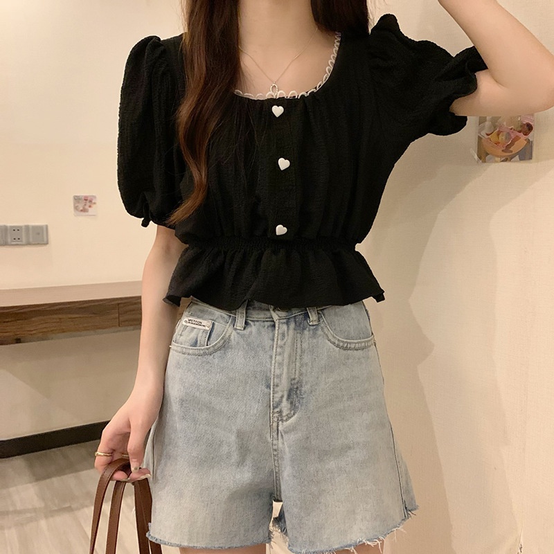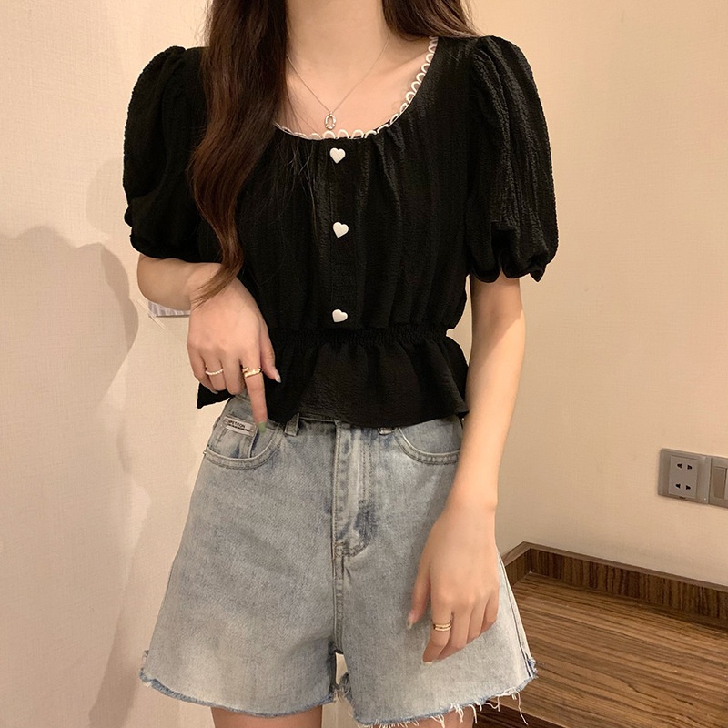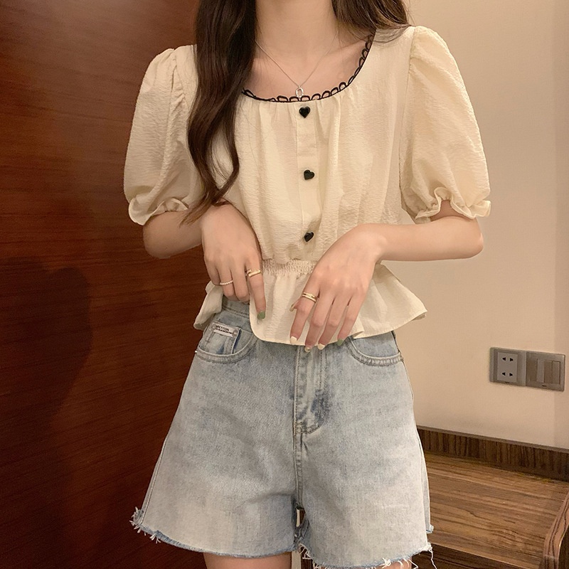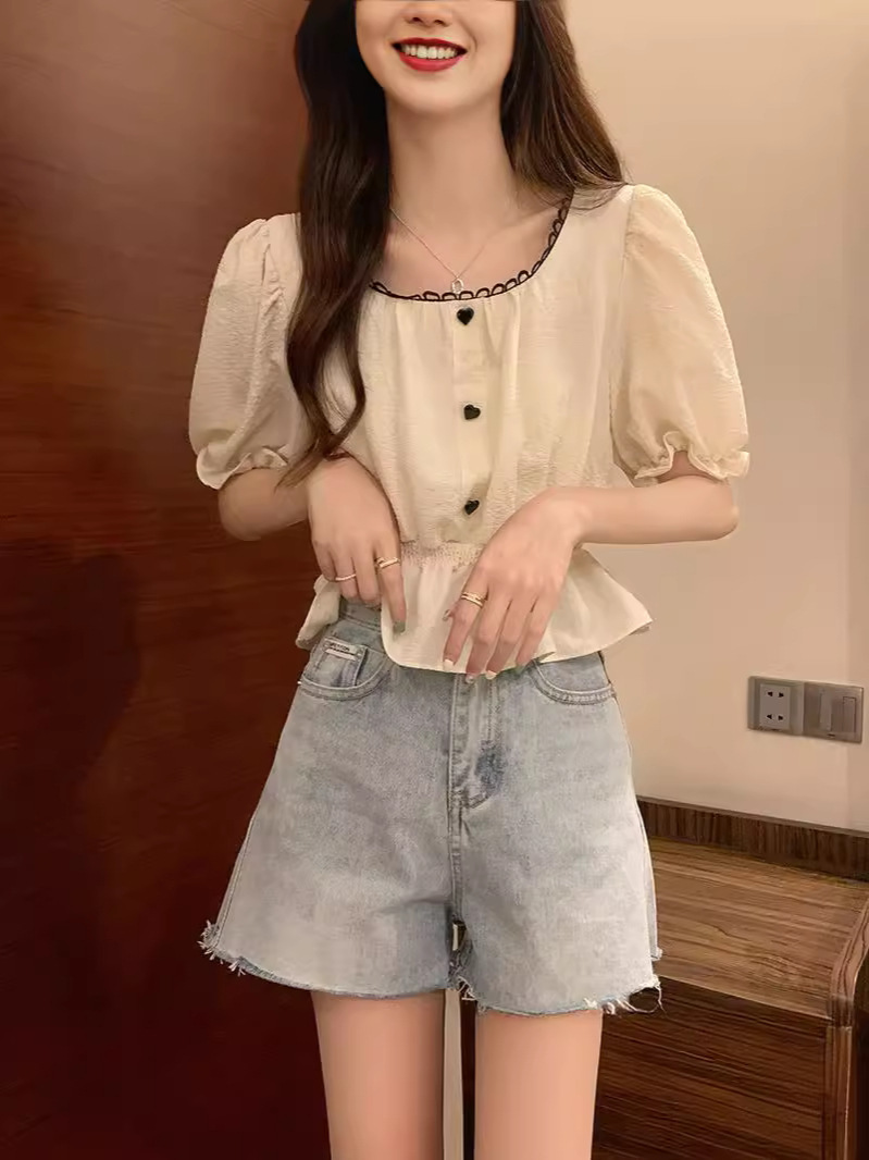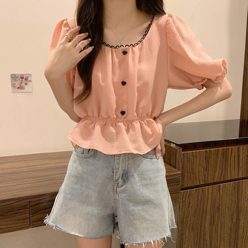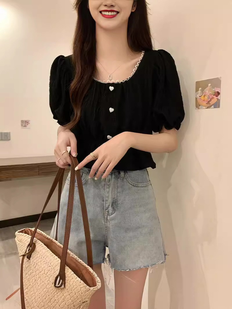 2024新款甜美减龄方领爱心扣撞色泡泡袖雪纺上衣甜美减龄泡泡短袖